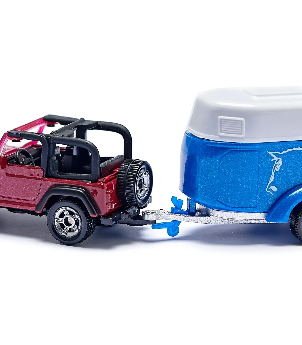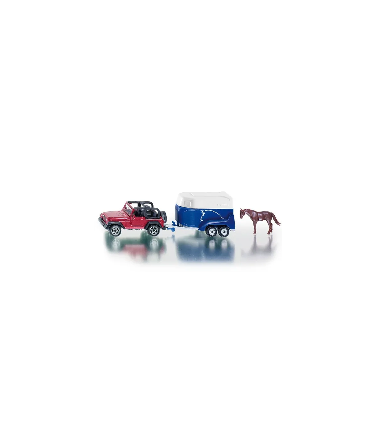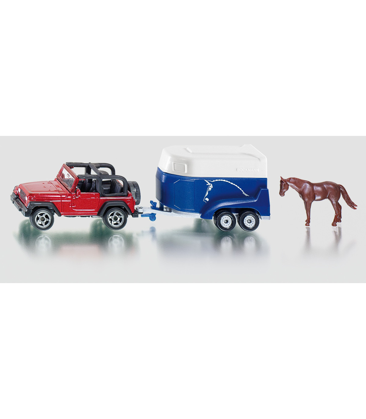El Jeep Wrangler con remolque para caballos Böckmann es la combinación clásica para dejar que los caballos se salgan de los caminos trillados. Tanto la carrocería del Jeep como el chasis del remolque para caballos están fabricados en metal. La trampilla de carga del remolque se puede abrir. En el paquete se incluye un caballo como accesorio.
