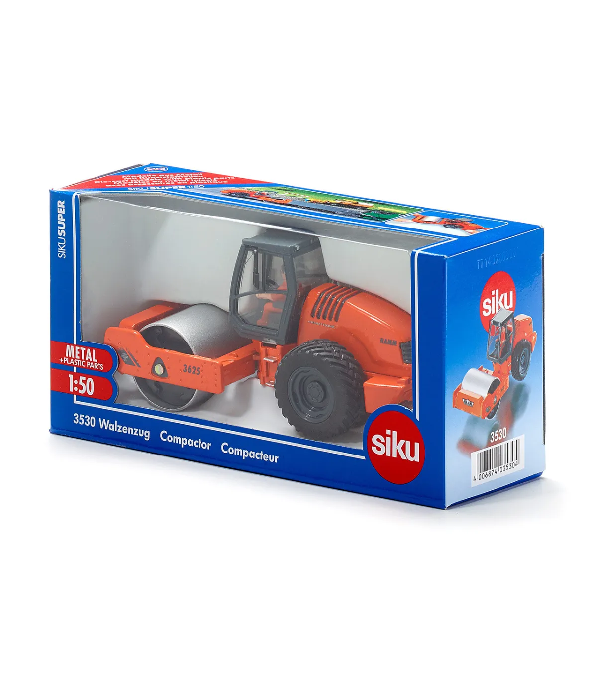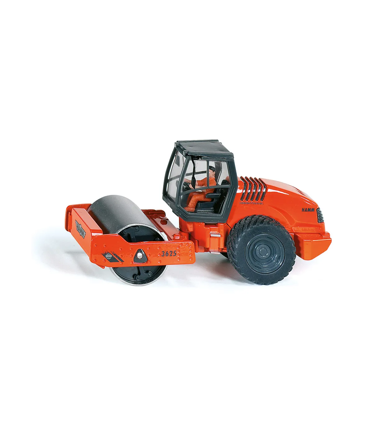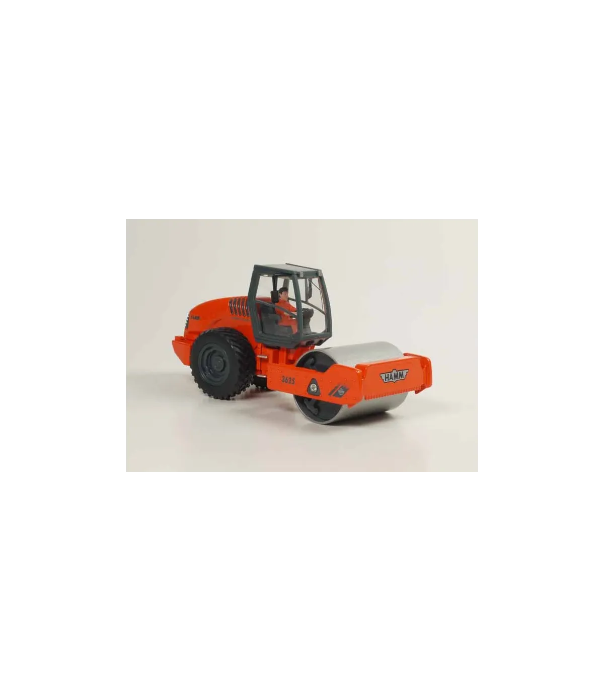 El llamado tren de rodillos vibratorios de la marca Hamm en su versión más grande a escala 1:50 es un modelo de juguete que marca pautas desde el punto de vista de la tecnología de modelismo. Las proporciones armoniosas de la zona trasera, también conocida como cintura de avispa, y las enormes dimensiones del rodillo y del modelo en conjunto, junto con un peso elevado, subrayan su carácter especial. Ruedas con banda de rodadura de goma, llantas originales, rodillo giratorio y articulación debajo de la cabina.