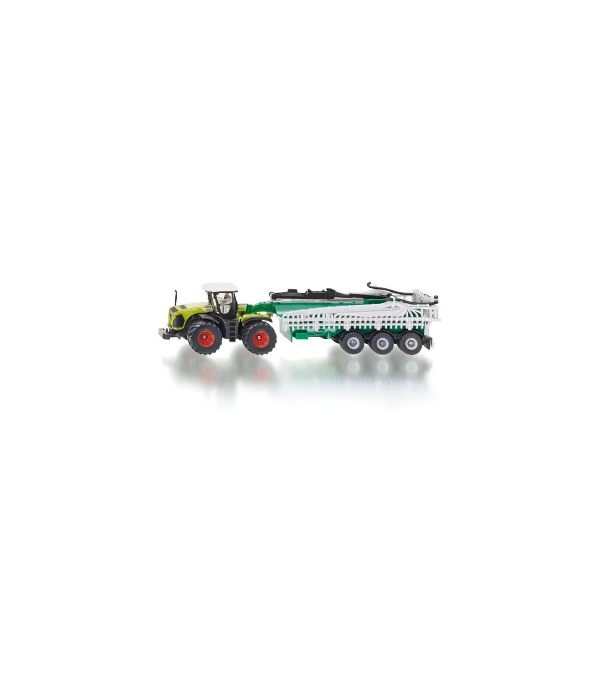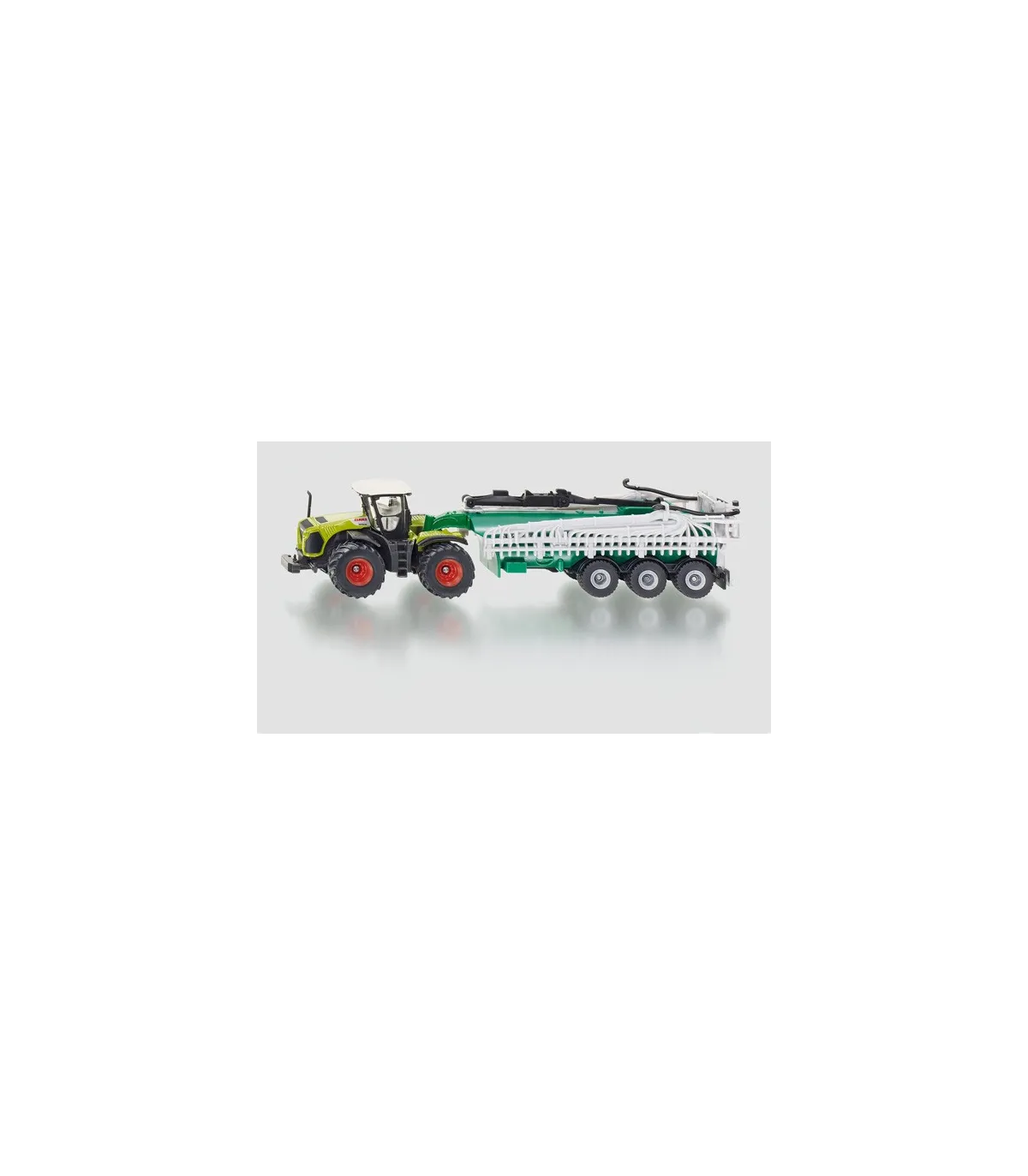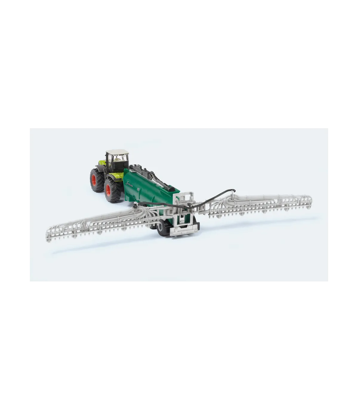 Para los amantes de las máquinas agrícolas miniaturizadas 87 a escala, ¡esta combinación de vehículos cumplirá todos sus deseos! El tractor del sistema Claas Xerion arrastra el potente carro cisterna Samson, que por supuesto también puede desmontarse. Particularmente impresionante: el distribuidor de mangueras de arrastre, fielmente reproducido, en la parte trasera del camión portatambores, se puede desplegar hasta alcanzar una impresionante anchura de trabajo. El techo de la cabina del Claas Xerion es, por supuesto, desmontable y los neumáticos de goma garantizan una gran tracción. La impresión es de filigrana.