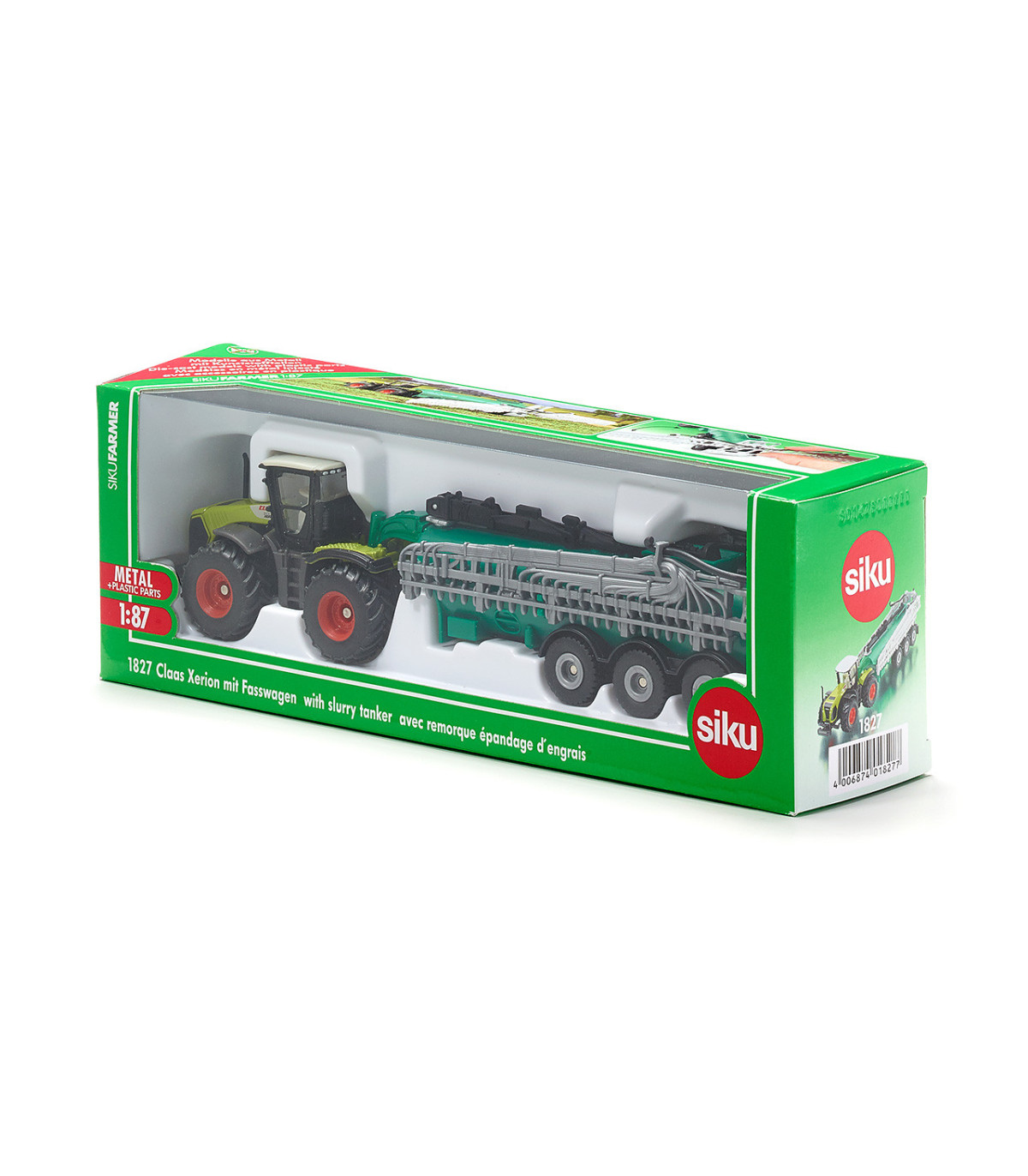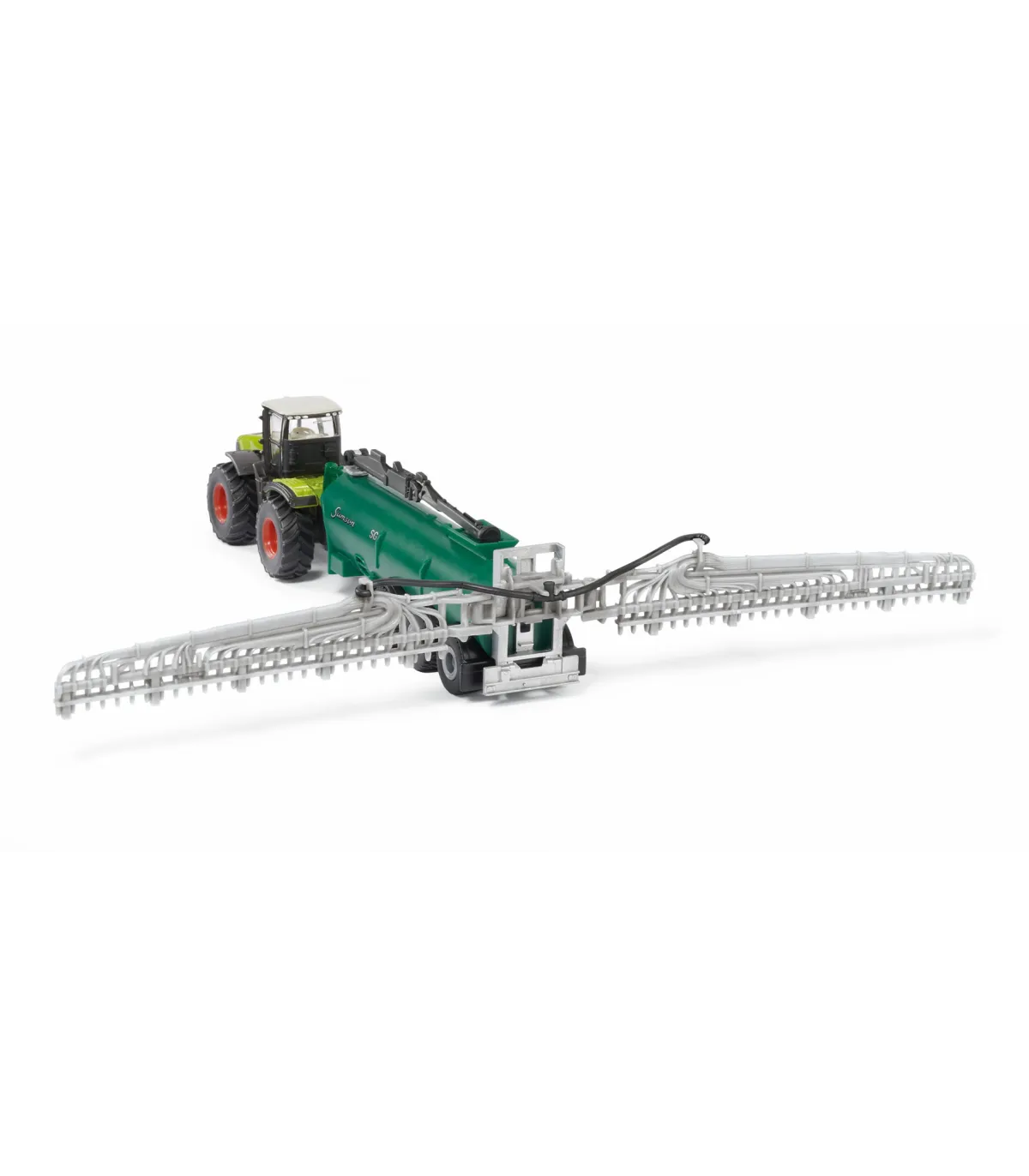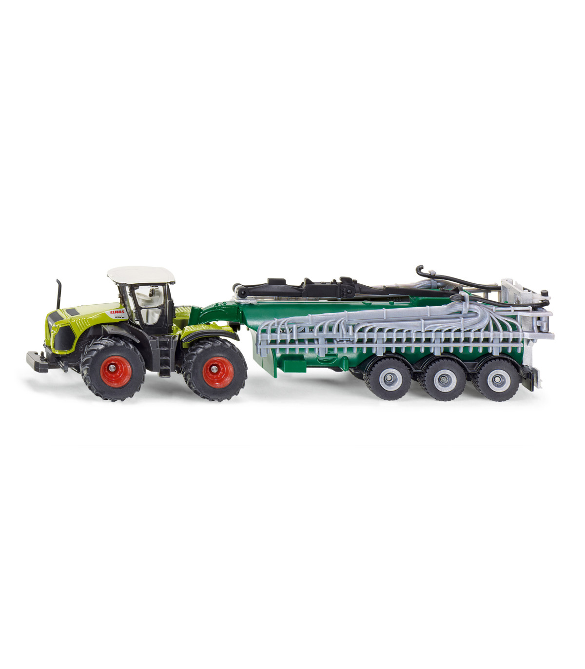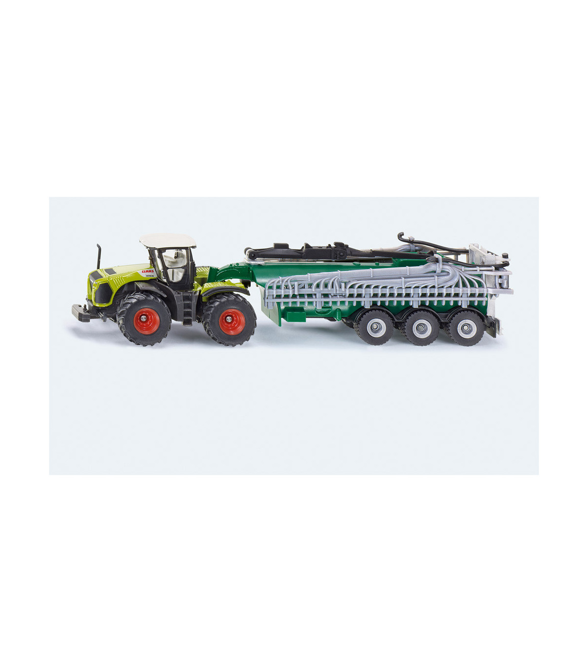 Para los amantes de las máquinas agrícolas miniaturizadas 87 a escala, ¡esta combinación de vehículos cumplirá todos sus deseos! El tractor del sistema Claas Xerion arrastra el potente carro cisterna Samson, que por supuesto también puede desmontarse. Particularmente impresionante: el distribuidor de mangueras de arrastre, fielmente reproducido, en la parte trasera del camión portatambores, se puede desplegar hasta alcanzar una impresionante anchura de trabajo. El techo de la cabina del Claas Xerion es, por supuesto, desmontable y los neumáticos de goma garantizan una gran tracción. La impresión es de filigrana.