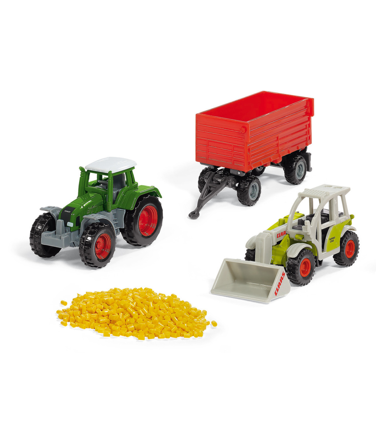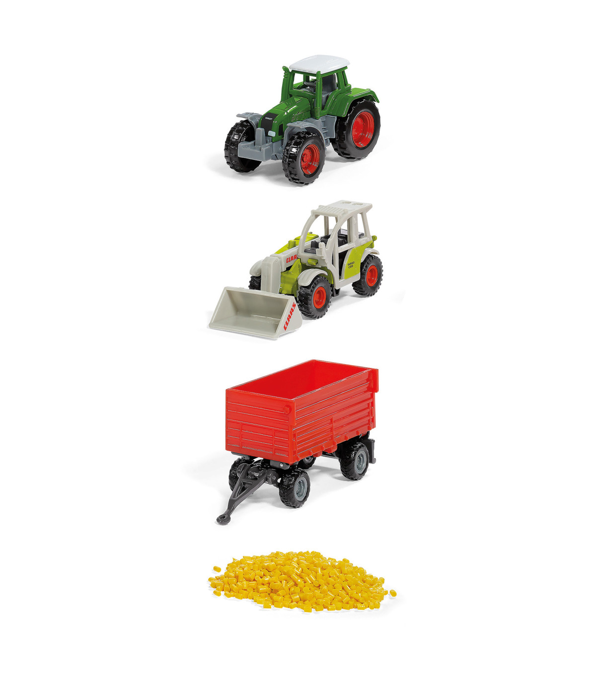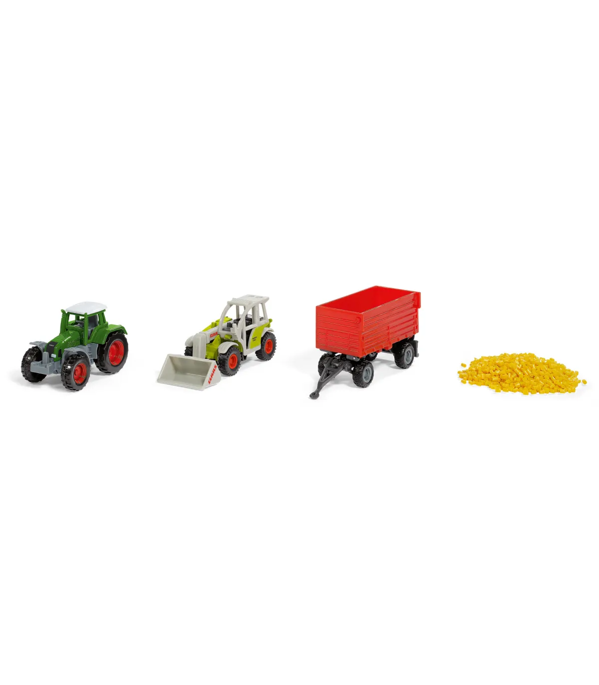 Transporte y carga de maíz en un solo set de regalo. El tractor lleva el granulado a la granja con el remolque y lo arroja allí. El manipulador telescópico comienza inmediatamente a cargar los productos a granel. La pala grande y el brazo telescópico son características útiles para un trabajo rápido.