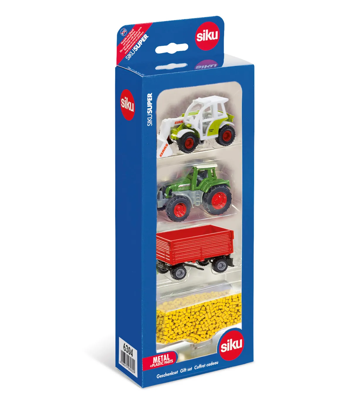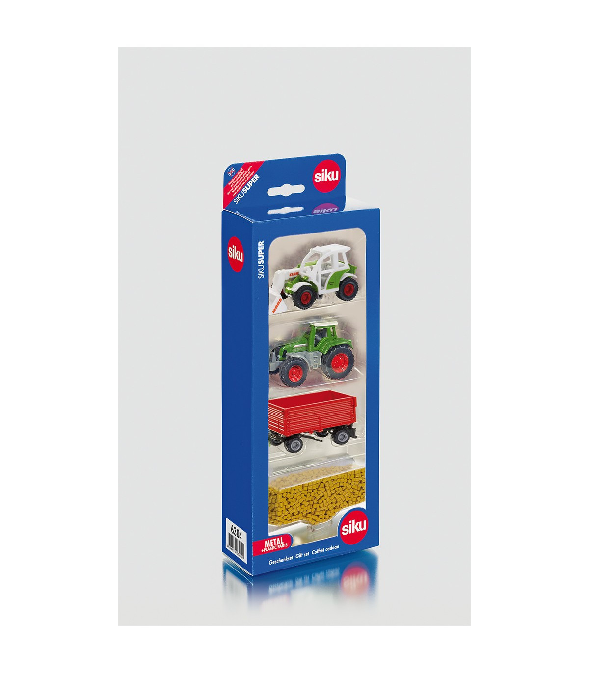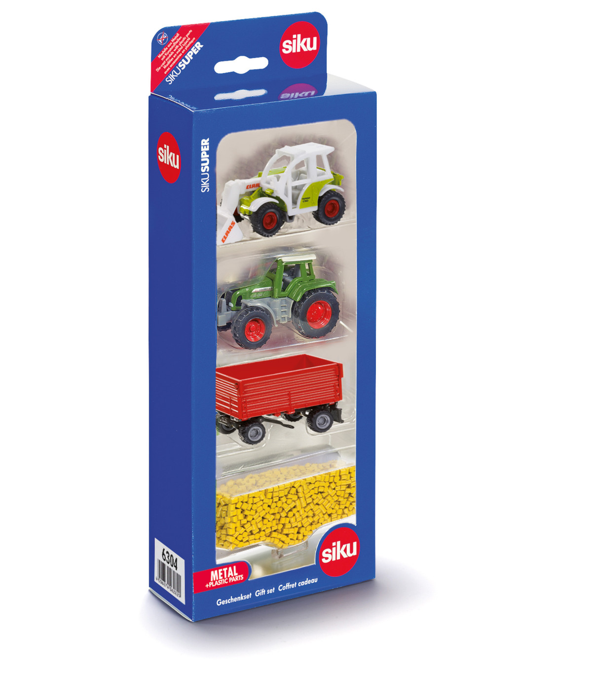 Transporte y carga de maíz en un solo set de regalo. El tractor lleva el granulado a la granja con el remolque y lo arroja allí. El manipulador telescópico comienza inmediatamente a cargar los productos a granel. La pala grande y el brazo telescópico son características útiles para un trabajo rápido.