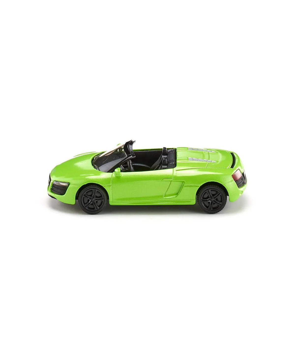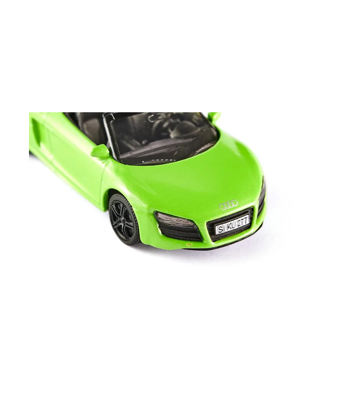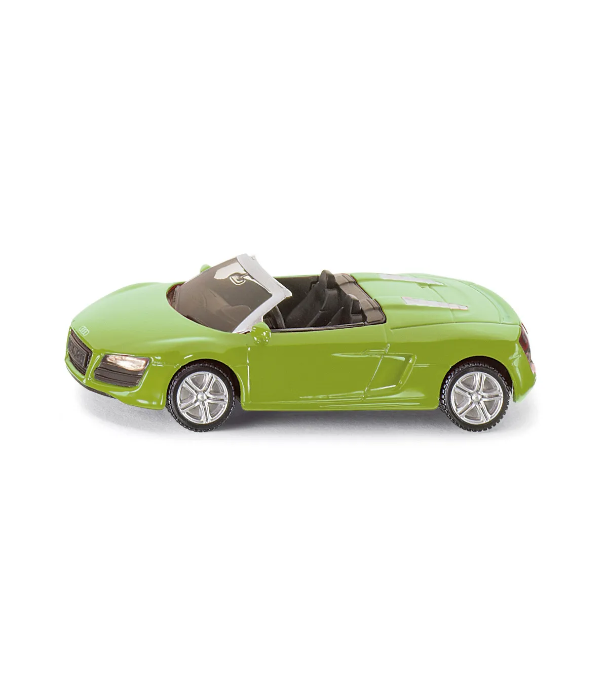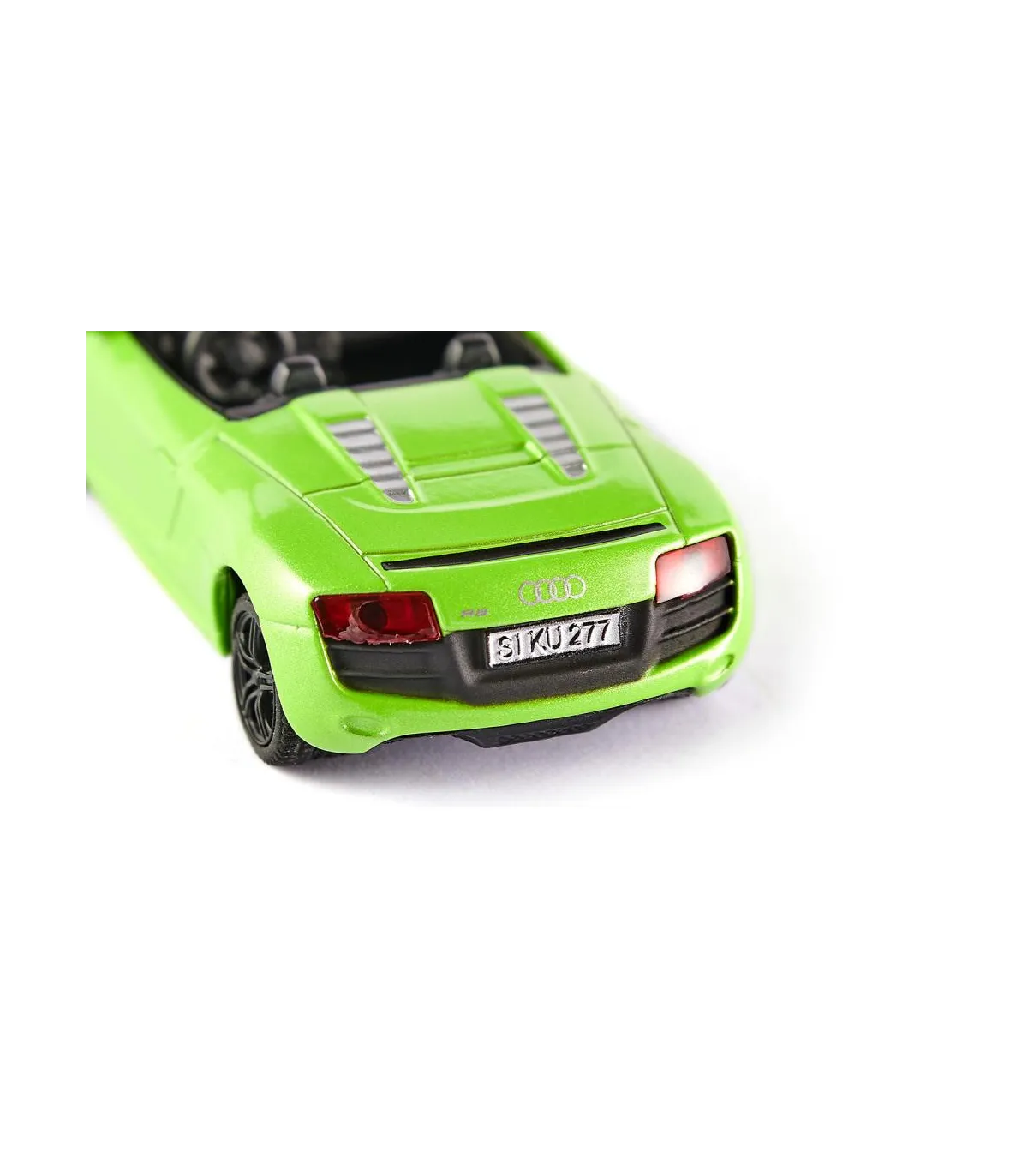 Versión descapotable del superdeportivo Audi R8. Neumáticos ultraanchos sobre llantas deportivas. Cuerpo metálico. Faros delanteros y traseros de plástico.