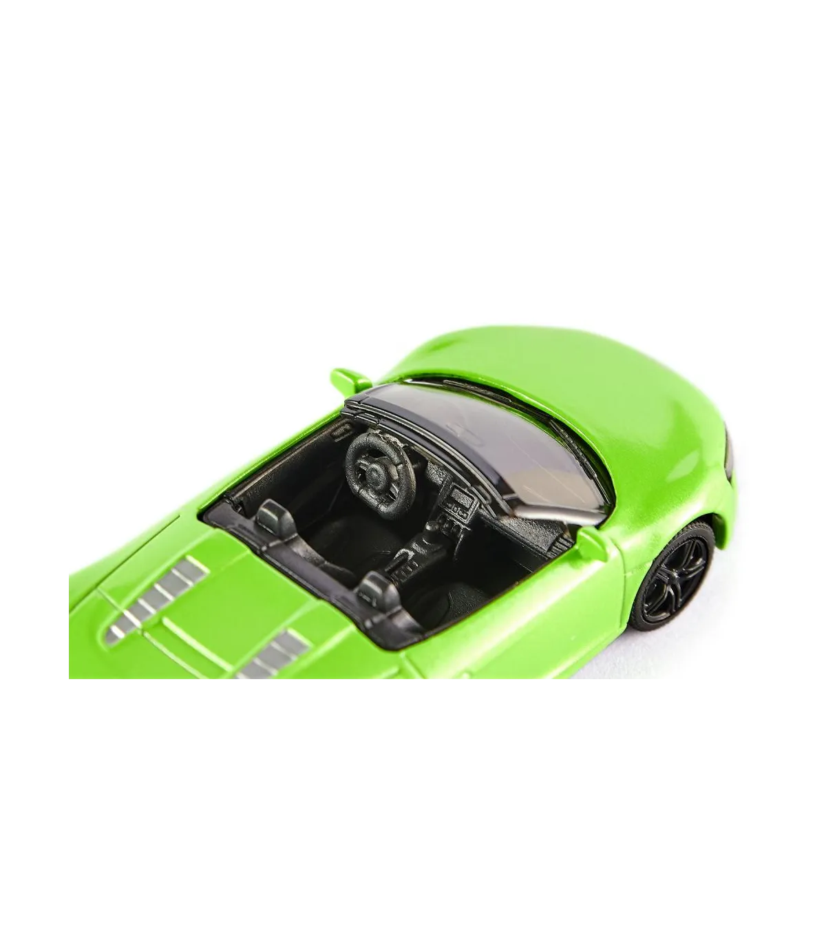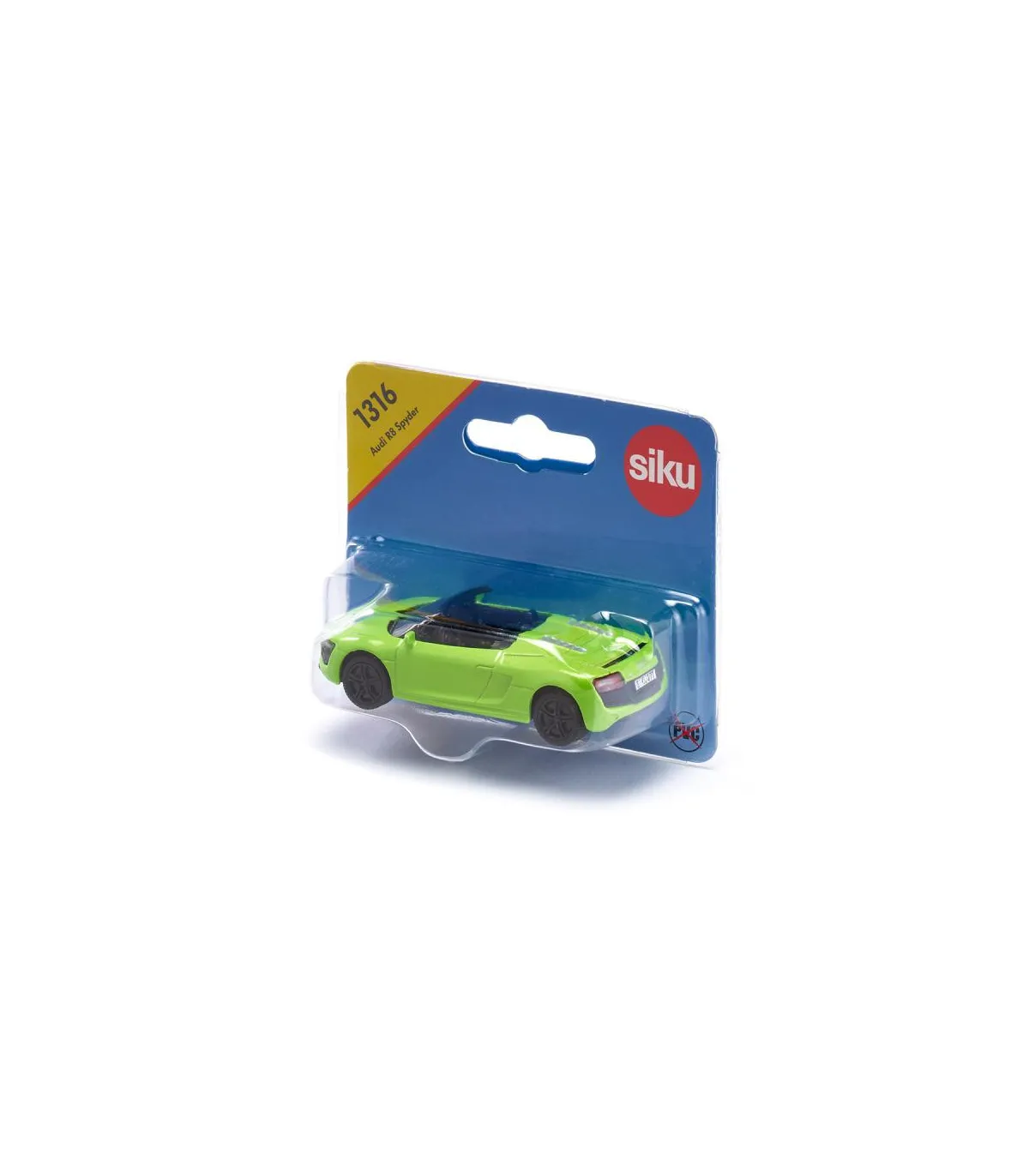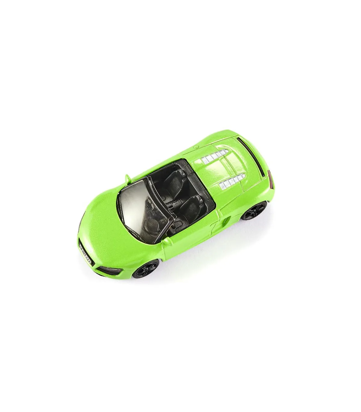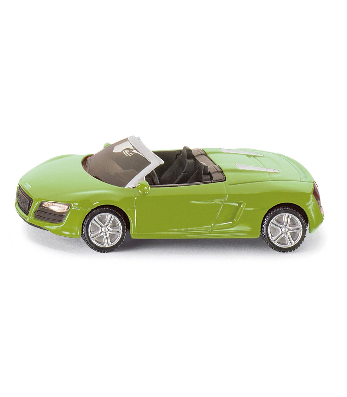 Versión descapotable del superdeportivo Audi R8. Neumáticos ultraanchos sobre llantas deportivas. Cuerpo metálico. Faros delanteros y traseros de plástico.