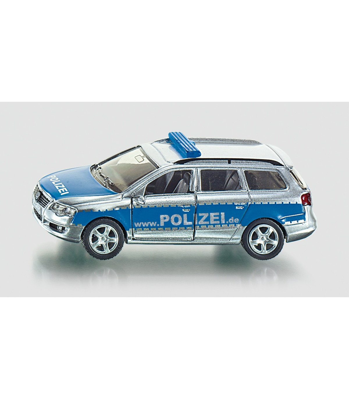 Coche patrulla policial basado en el BMW Serie 5 Touring. Color básico plateado con rayas azules y letras policiales. Barras de luz azul en el techo. Llantas en aluminio.