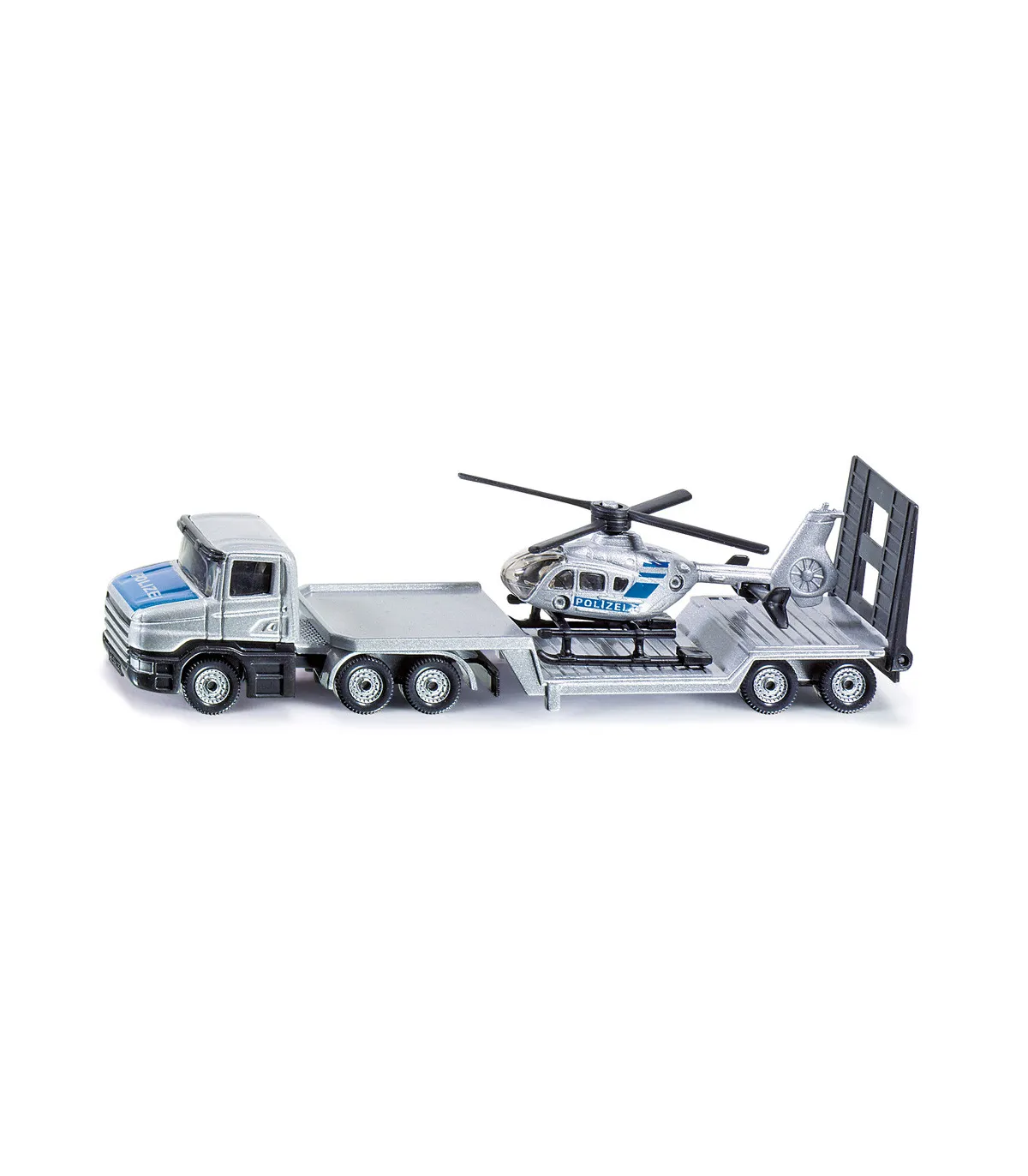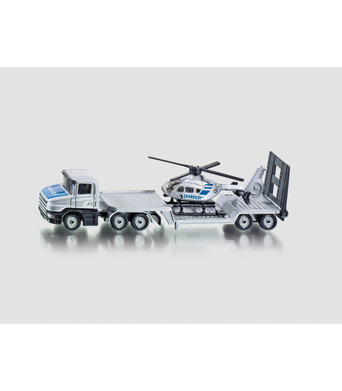 Un remolque único fabricado con piezas de metal y plástico diseñado para transportar el helicóptero de la policía SIKU. Tiene una forma especial, protección trasera y neumáticos de goma que permiten al conductor llegar a casi cualquier lugar. El conjunto de tareas especiales incluye un helicóptero con hélice móvil y cabina transparente. El modelo resultará útil para el juego de los pequeños policías y será una interesante incorporación a muchas colecciones.