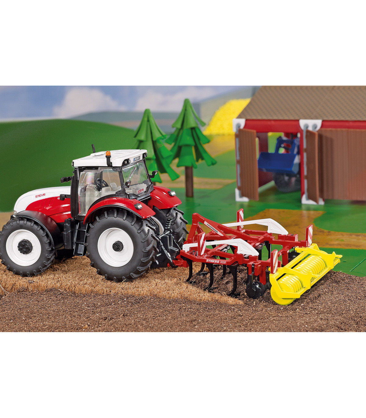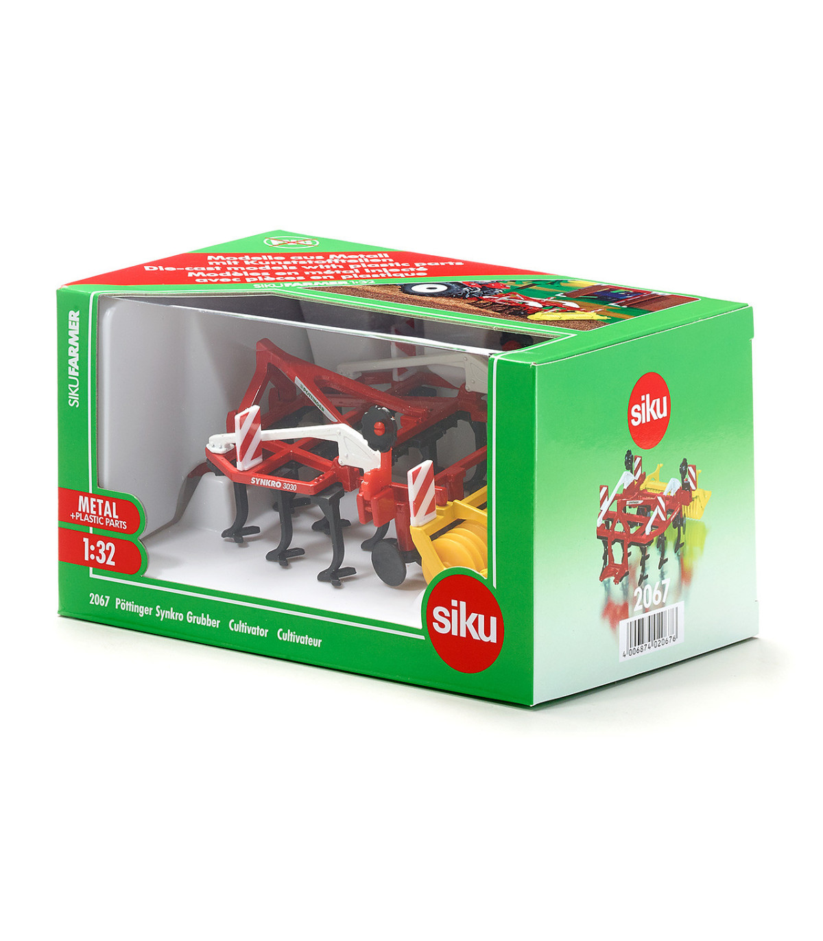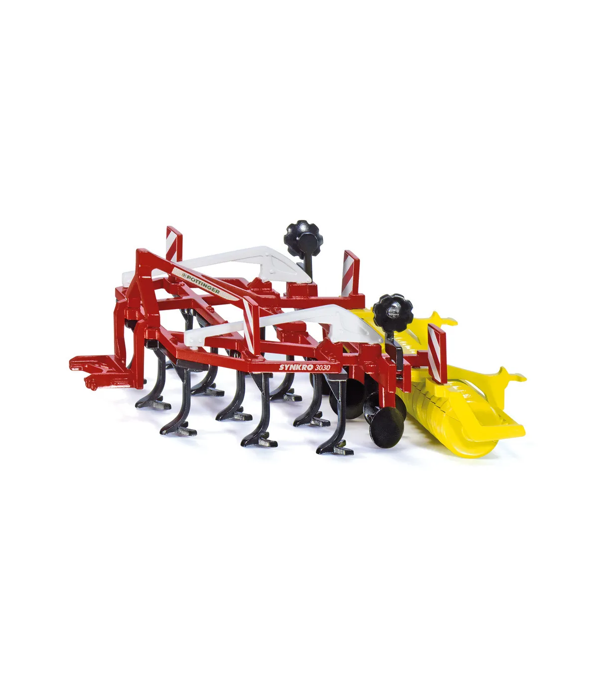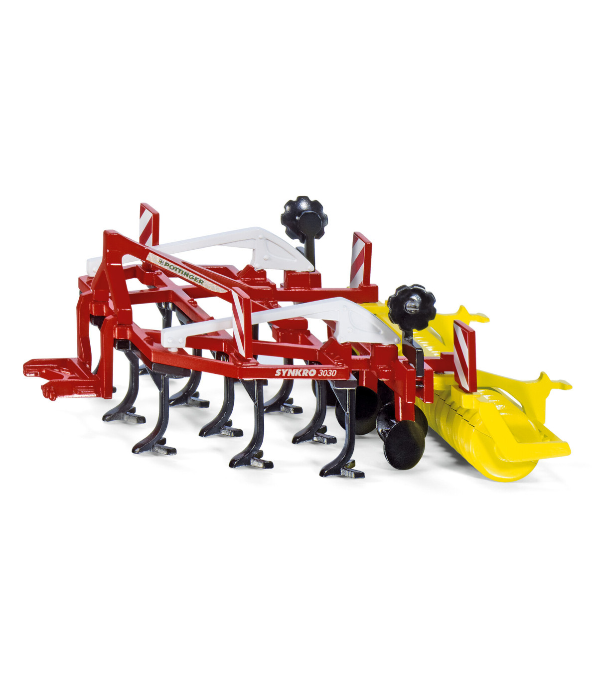 El modelo Synkro de la tradicional empresa austriaca Pöttinger es uno de los últimos aparatos para el cultivo del suelo del mercado. El cultivador originalmente de 3 metros de ancho con estructura de metal está equipado, además de las púas, con un rodillo compactador giratorio. El modelo, pintado en colores llamativos, se puede acoplar fácilmente a los tractores SIKU a escala 1:32.
