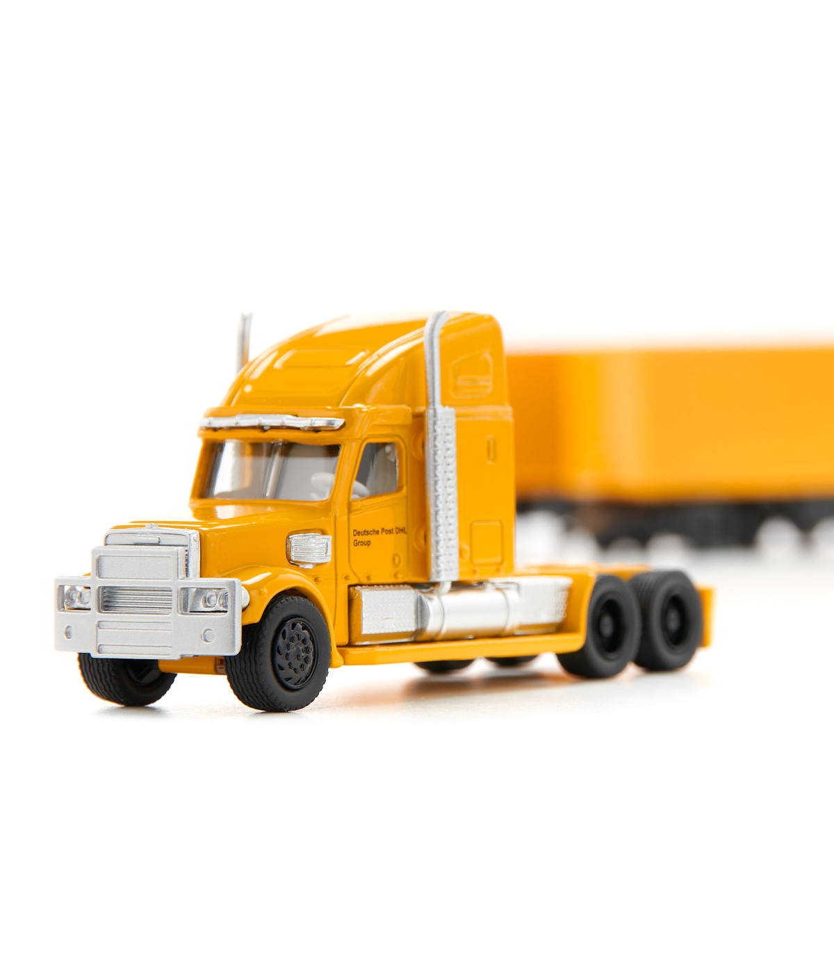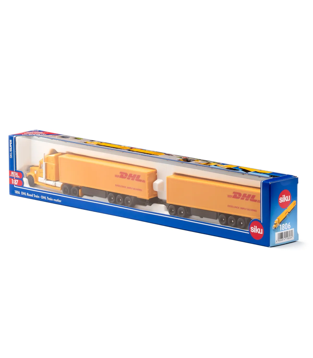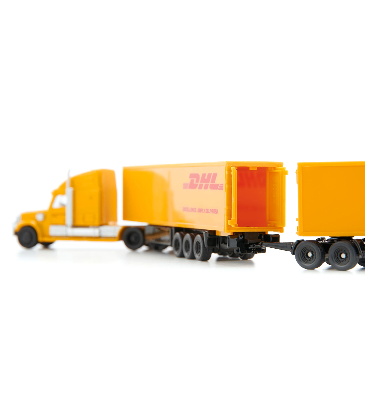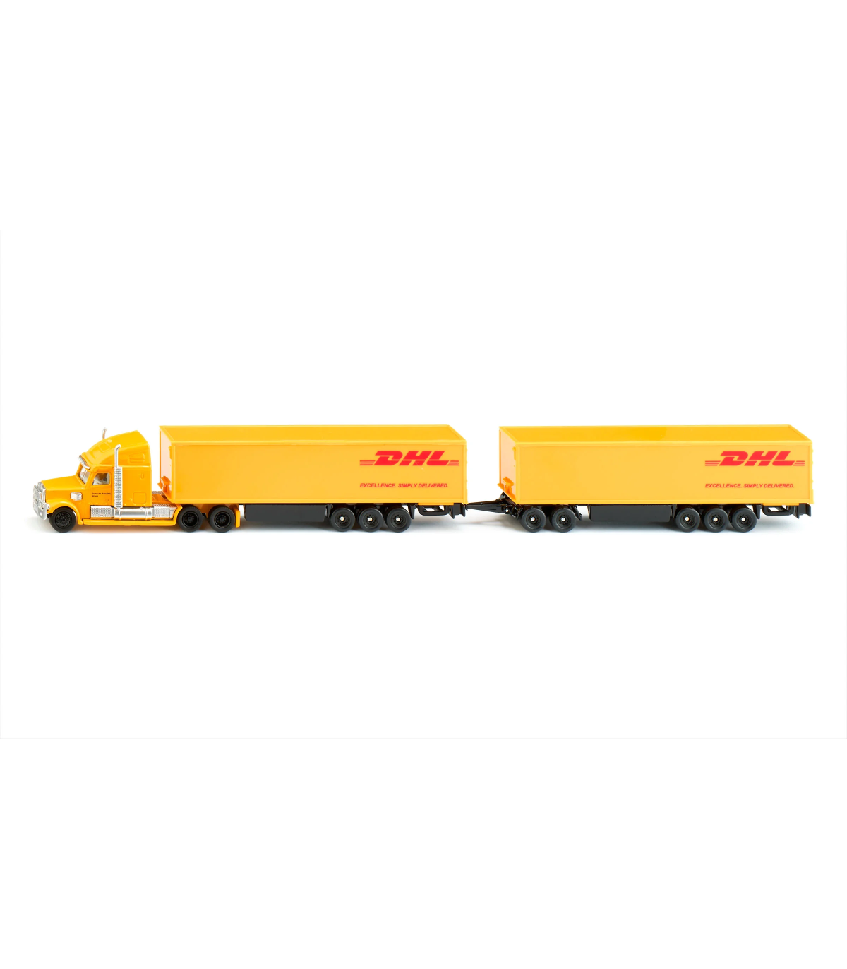 Un potente equipo de 30 metros conduce 87 veces en miniatura y sin frenos hasta el alcance del siku. El impresionante tractor Hauber estadounidense, adornado con piezas cromadas, arrastra dos remolques de tres ejes conectados a una plataforma rodante por carreteras solitarias. Las 22 ruedas con neumáticos de goma garantizan un funcionamiento suave en cualquier superficie. Ahora nuevo con licencia DHL.