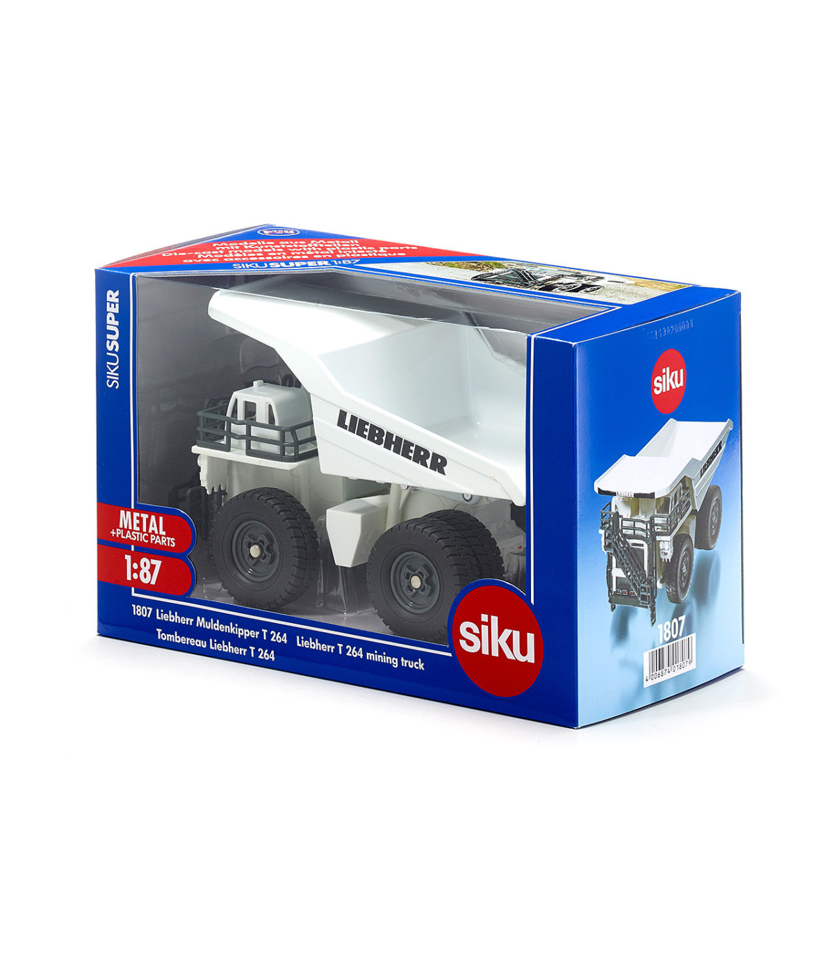 El gigante de los vehículos basculantes en las obras y en la minería a cielo abierto es un auténtico coloso, incluso a escala HO. La vanguardista serie T 264 de Liebherr es uno de los volquetes más grandes y potentes del mundo. Las seis ruedas, originalmente de 4 metros de altura, transportan con seguridad un modelo hecho casi enteramente de metal al siguiente lugar. El enorme comedero se puede volcar. La cabina del conductor y las escaleras de acceso están diseñadas con precisión y completan este modelo inusual.