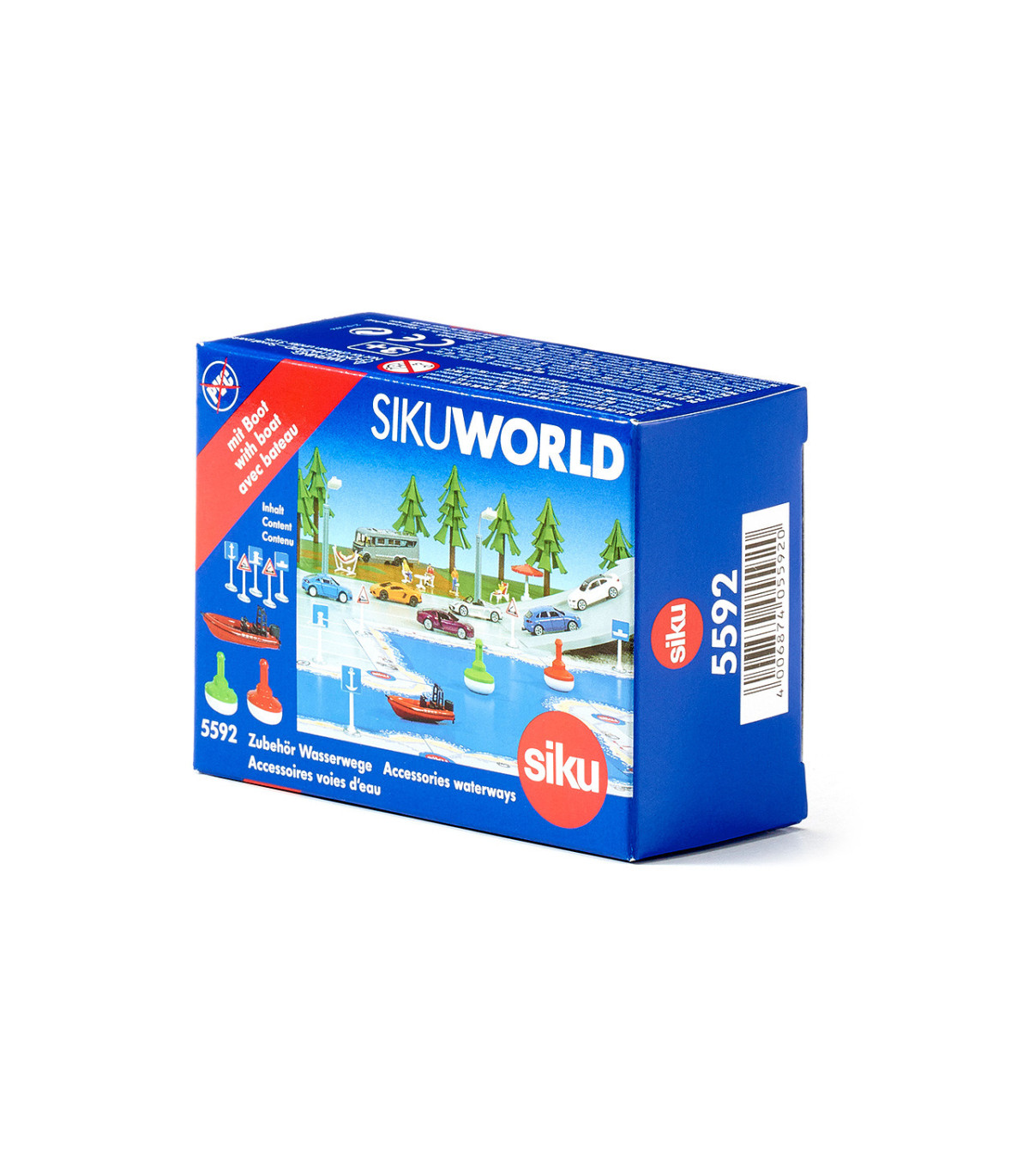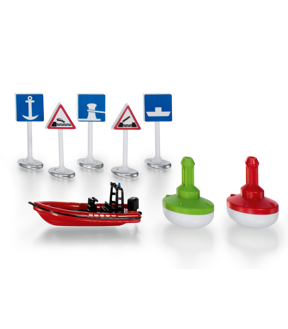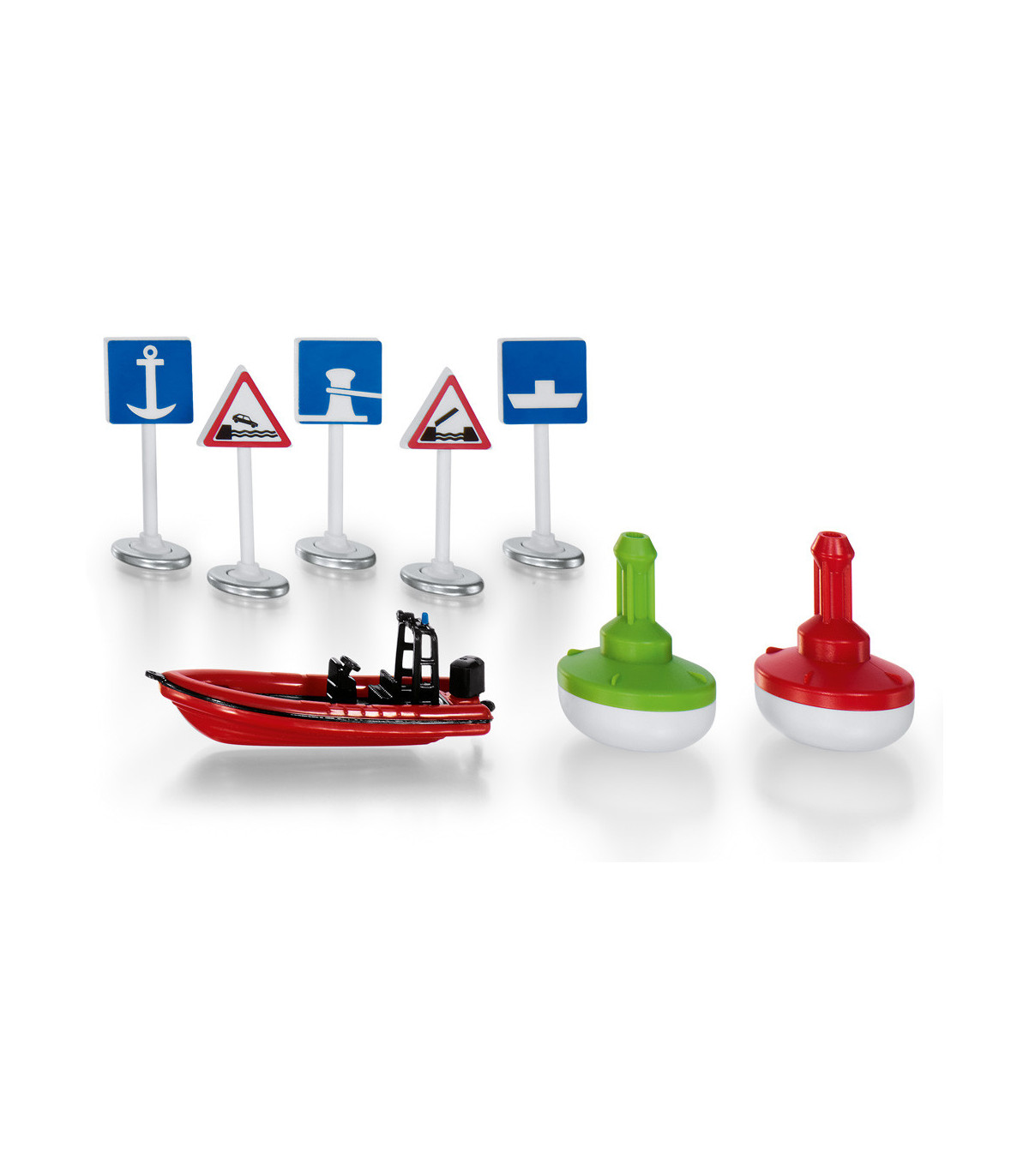 Es necesario regular el tráfico marítimo en las vías navegables infantiles. Las boyas son rojas y verdes, y las distintas señales de tráfico indican fondeaderos, terraplenes y puentes. Un barco deportivo completa este juego.