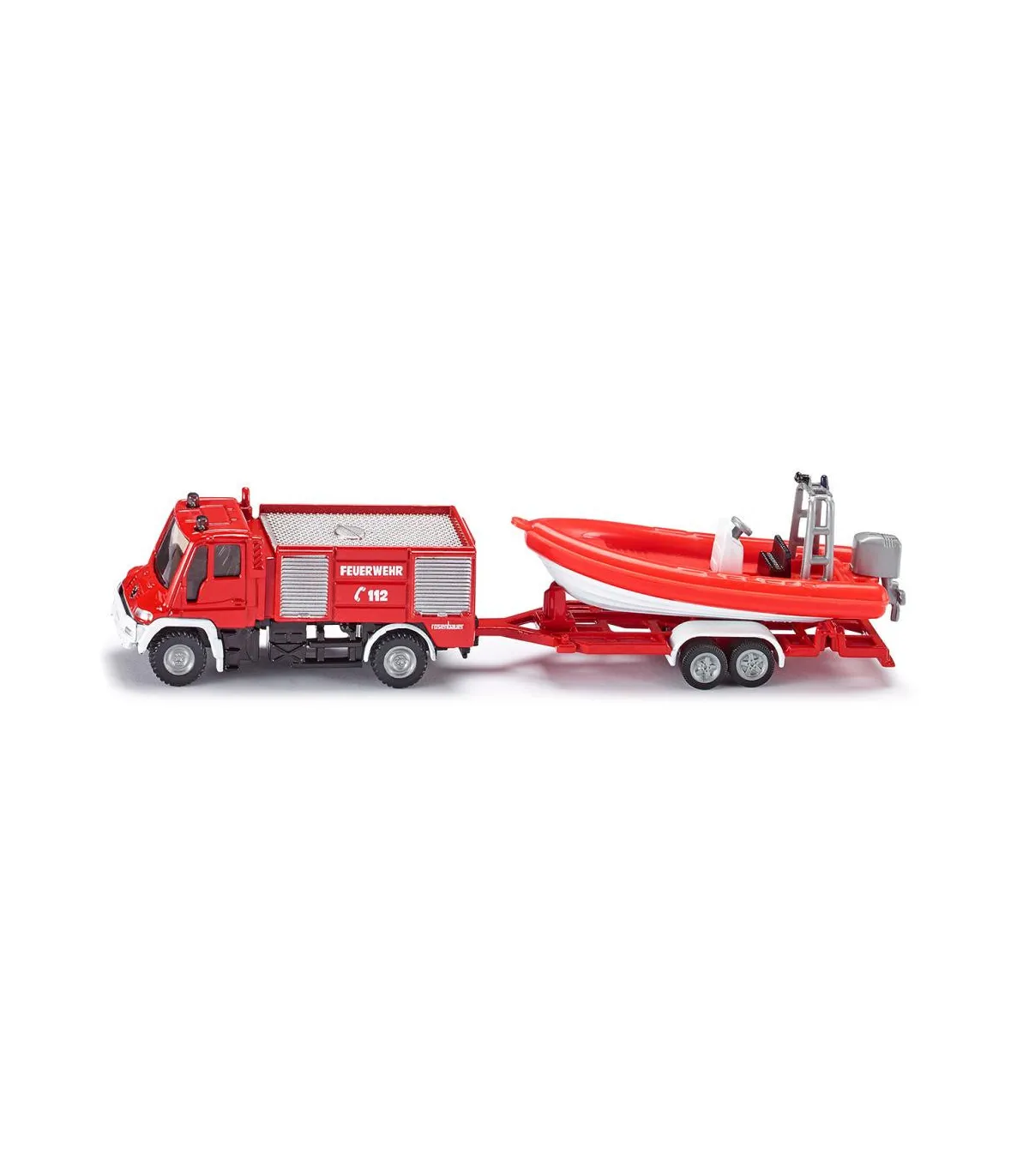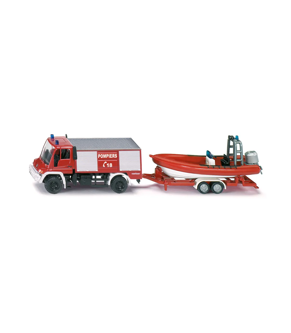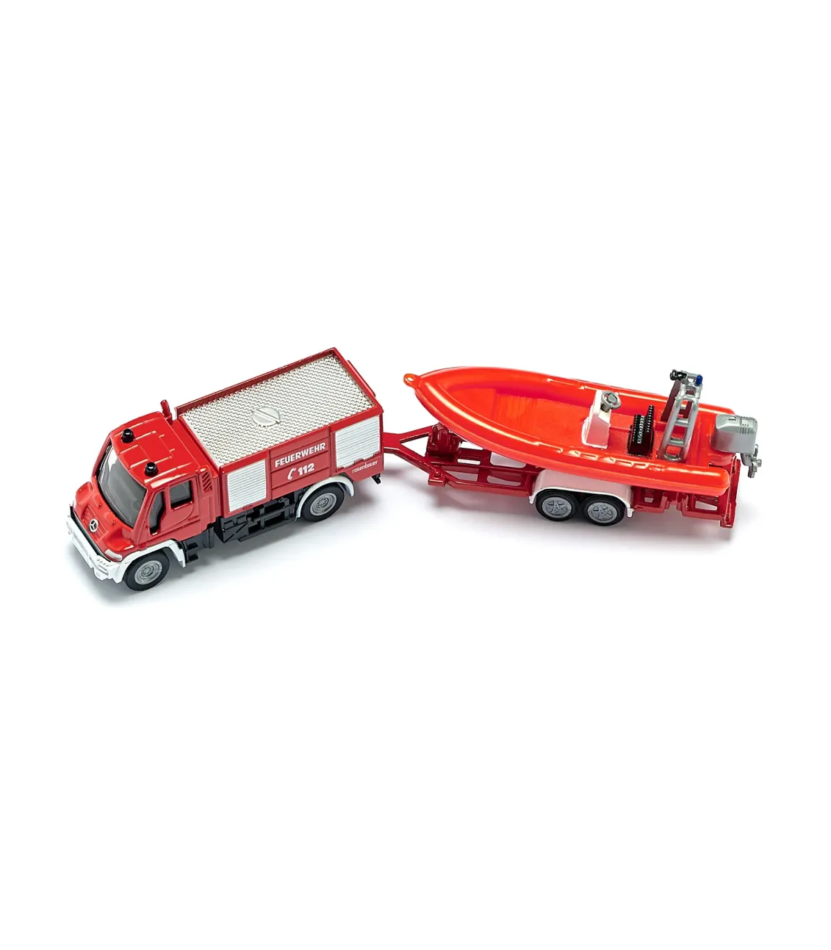 Unimog de bomberos a escala 1:87 fabricado en metal. Aspecto de alta calidad gracias a elaborados grabados e impresiones. En combinación con un bote salvavidas en un remolque de eje tándem.