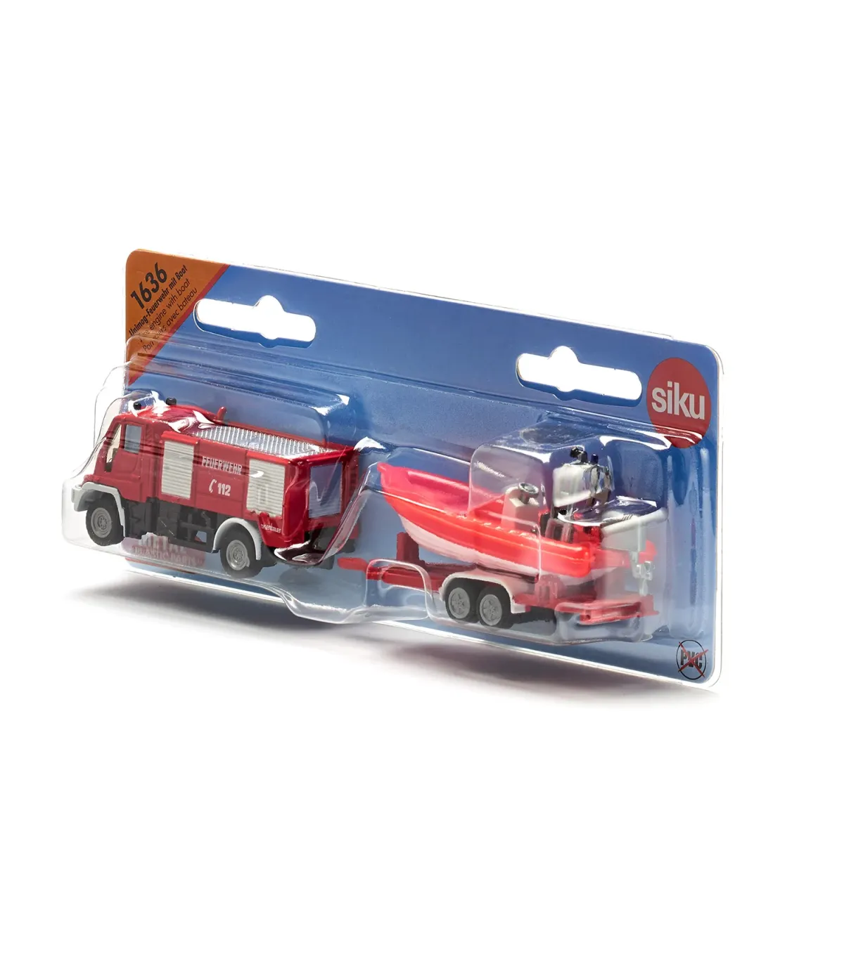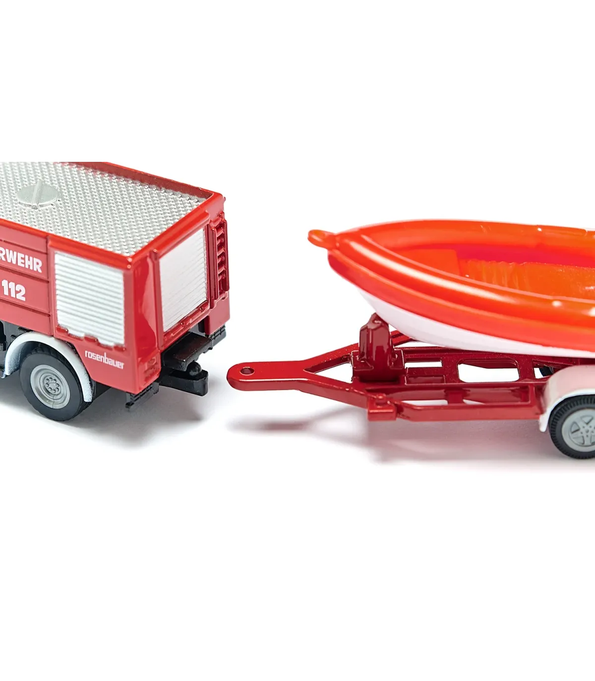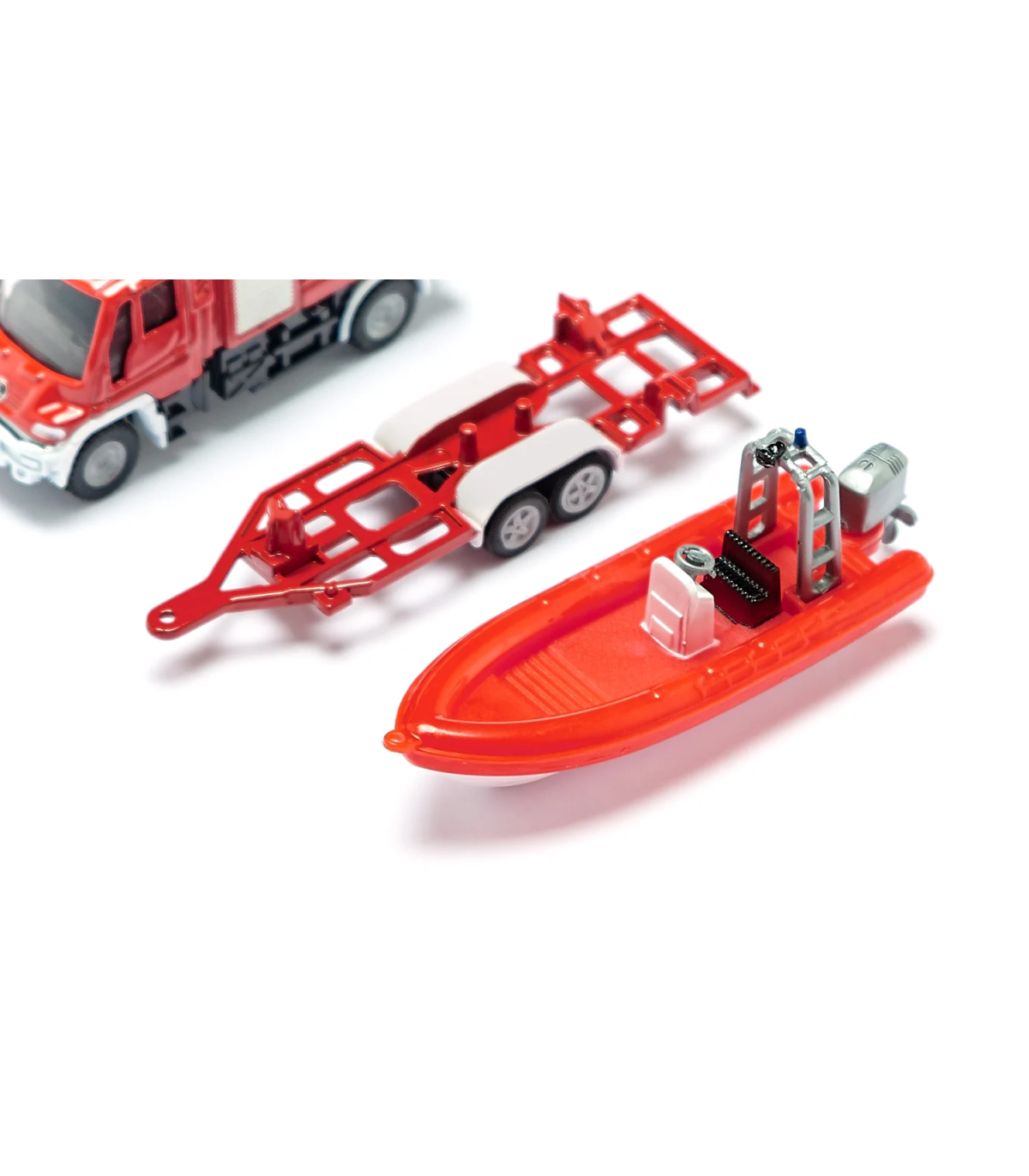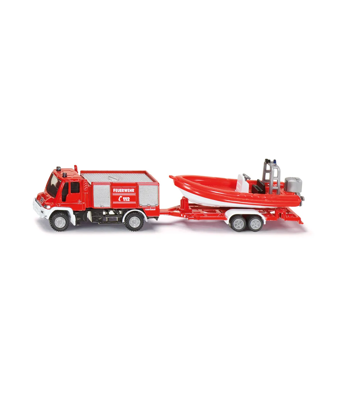 Unimog de bomberos a escala 1:87 fabricado en metal. Aspecto de alta calidad gracias a elaborados grabados e impresiones. En combinación con un bote salvavidas en un remolque de eje tándem.