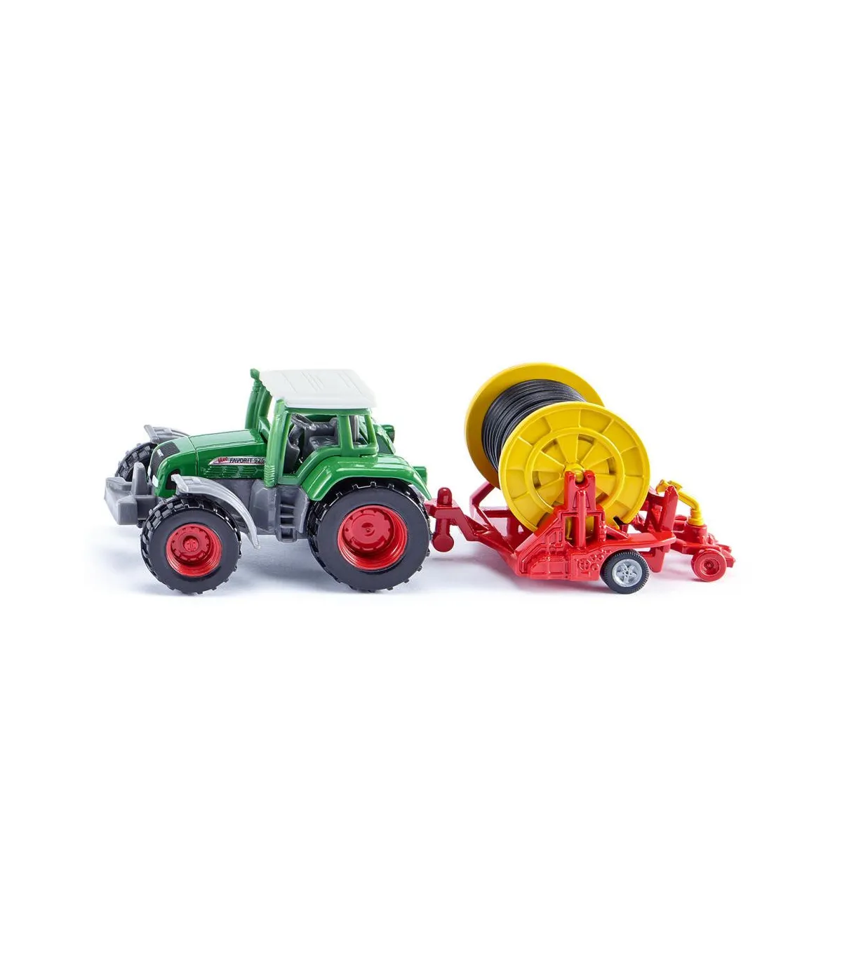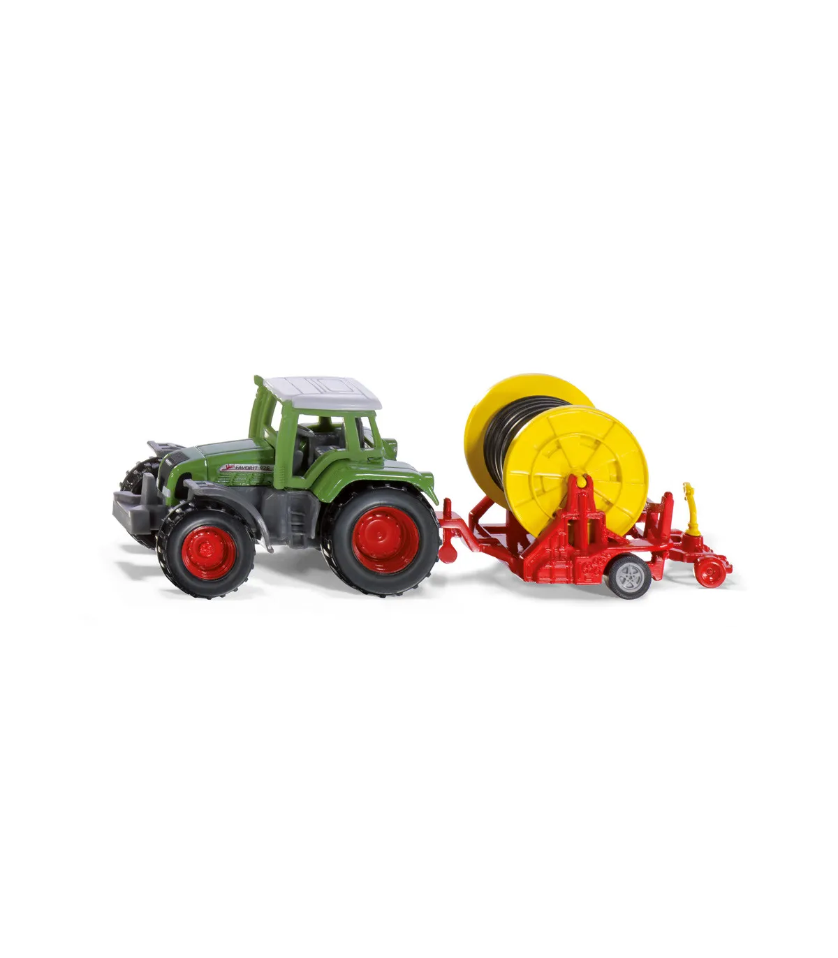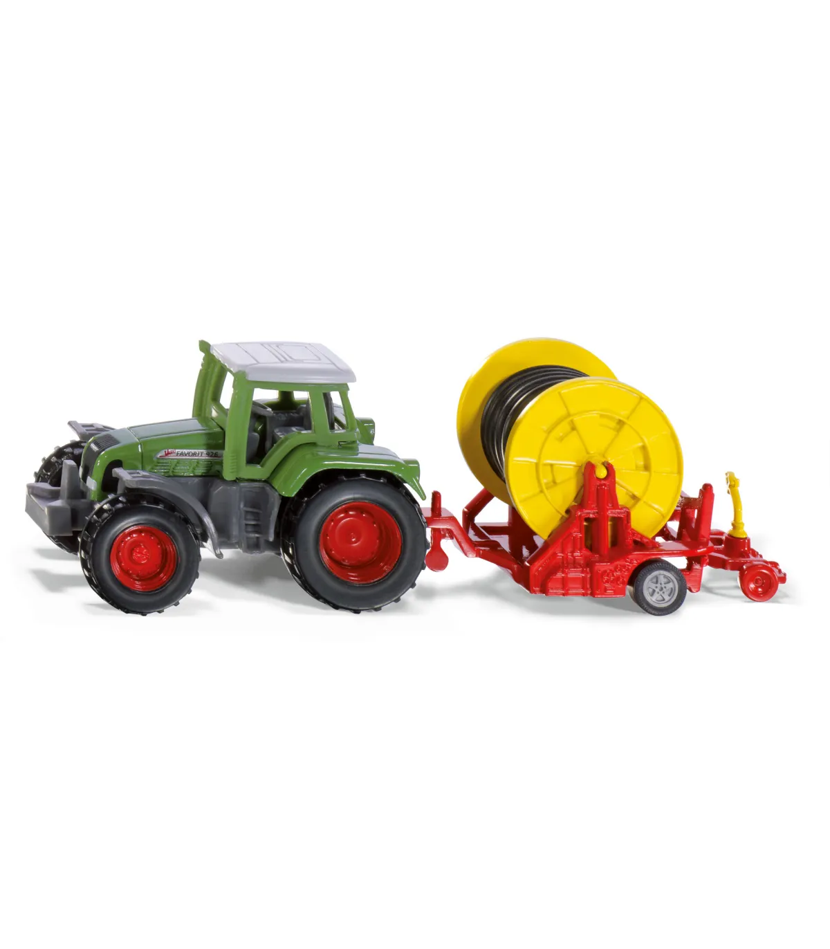 Los sistemas de riego móviles se utilizan para plantaciones con mayores necesidades de agua o en veranos secos. El tractor siku-Fendt con carrete de riego es la realización lúdica de esta parte de la cadena de recolección de hortalizas. La jeringa distribuidora se fija al carrete para el transporte por carretera. En el campo, la manguera se saca del carrete y se cuelga del pulverizador para poder abastecer de agua una gran superficie. Una vez finalizado el riego del campo, se vuelve a enrollar la manguera y se coloca el pulverizador.