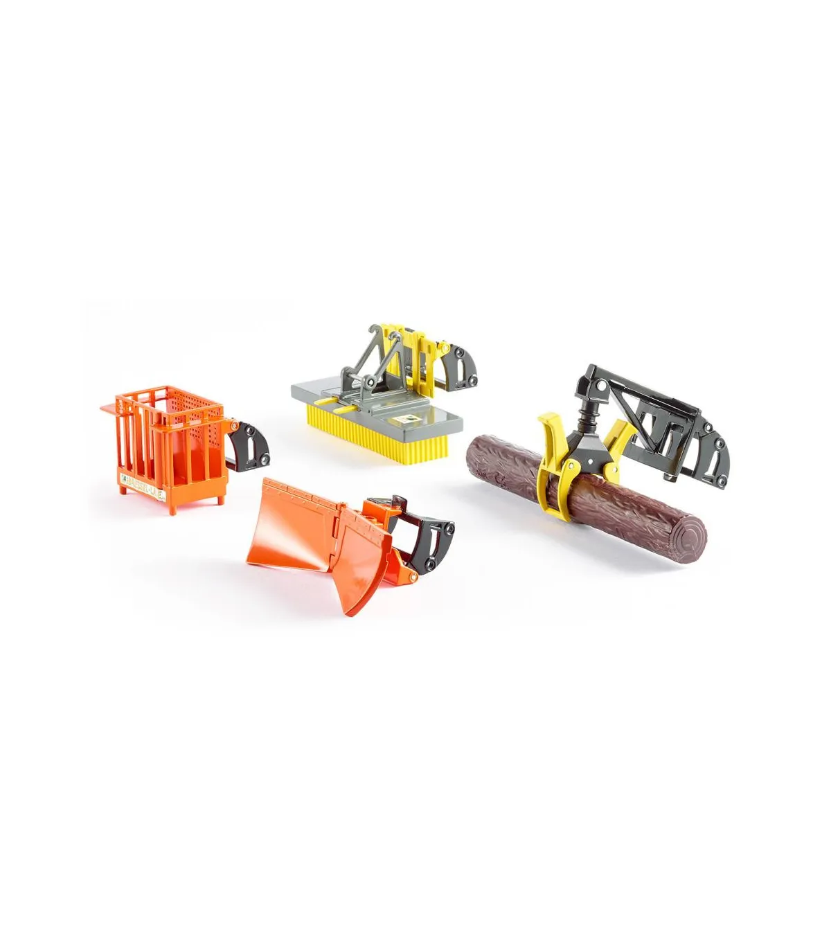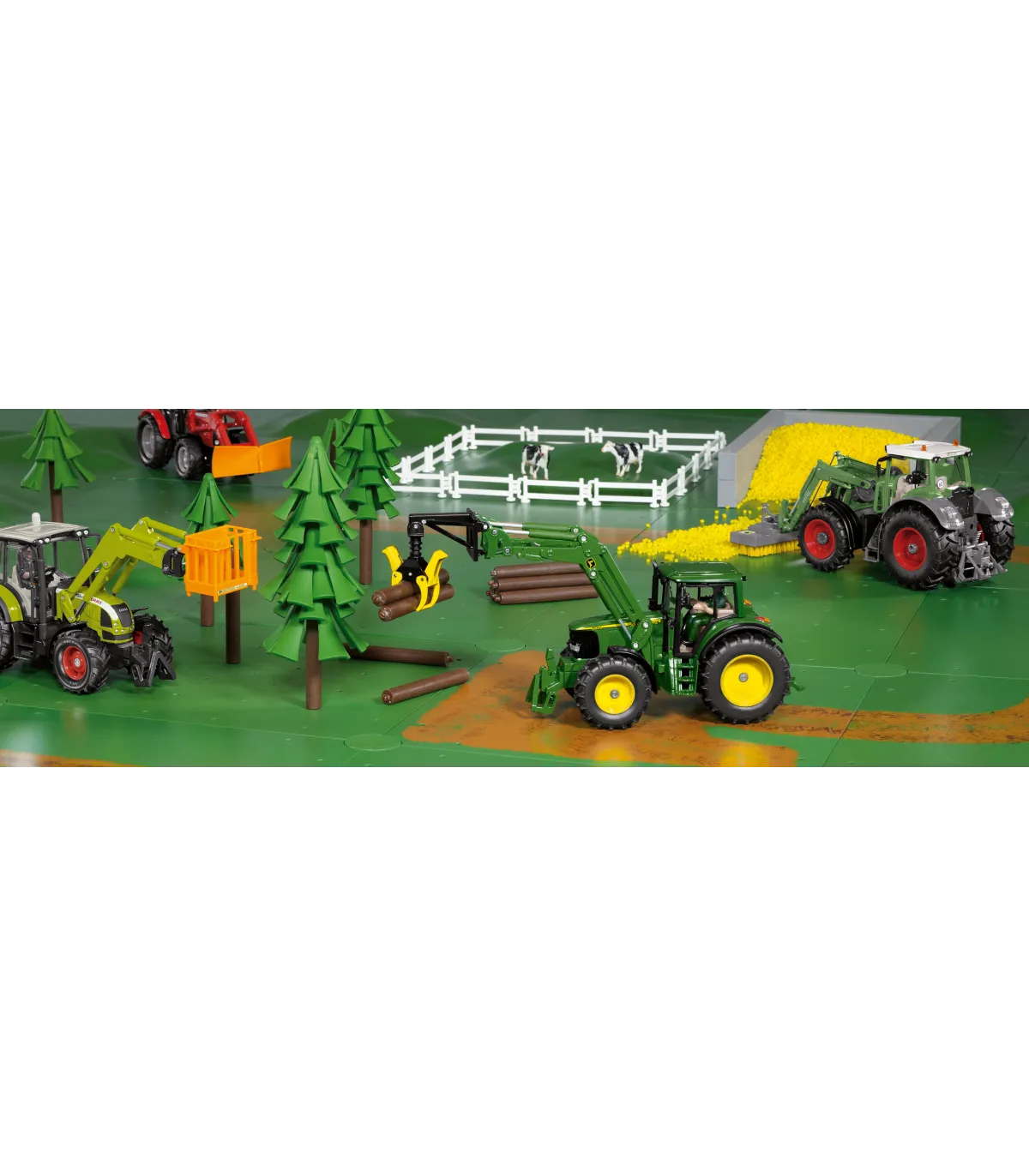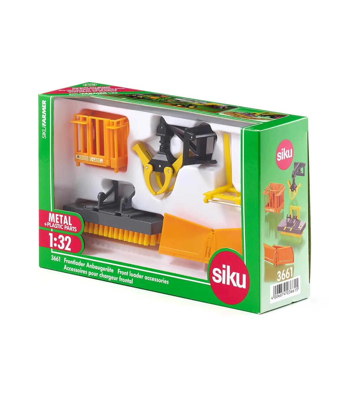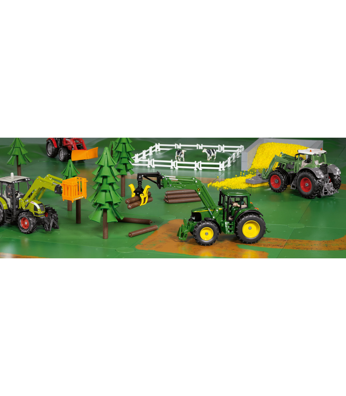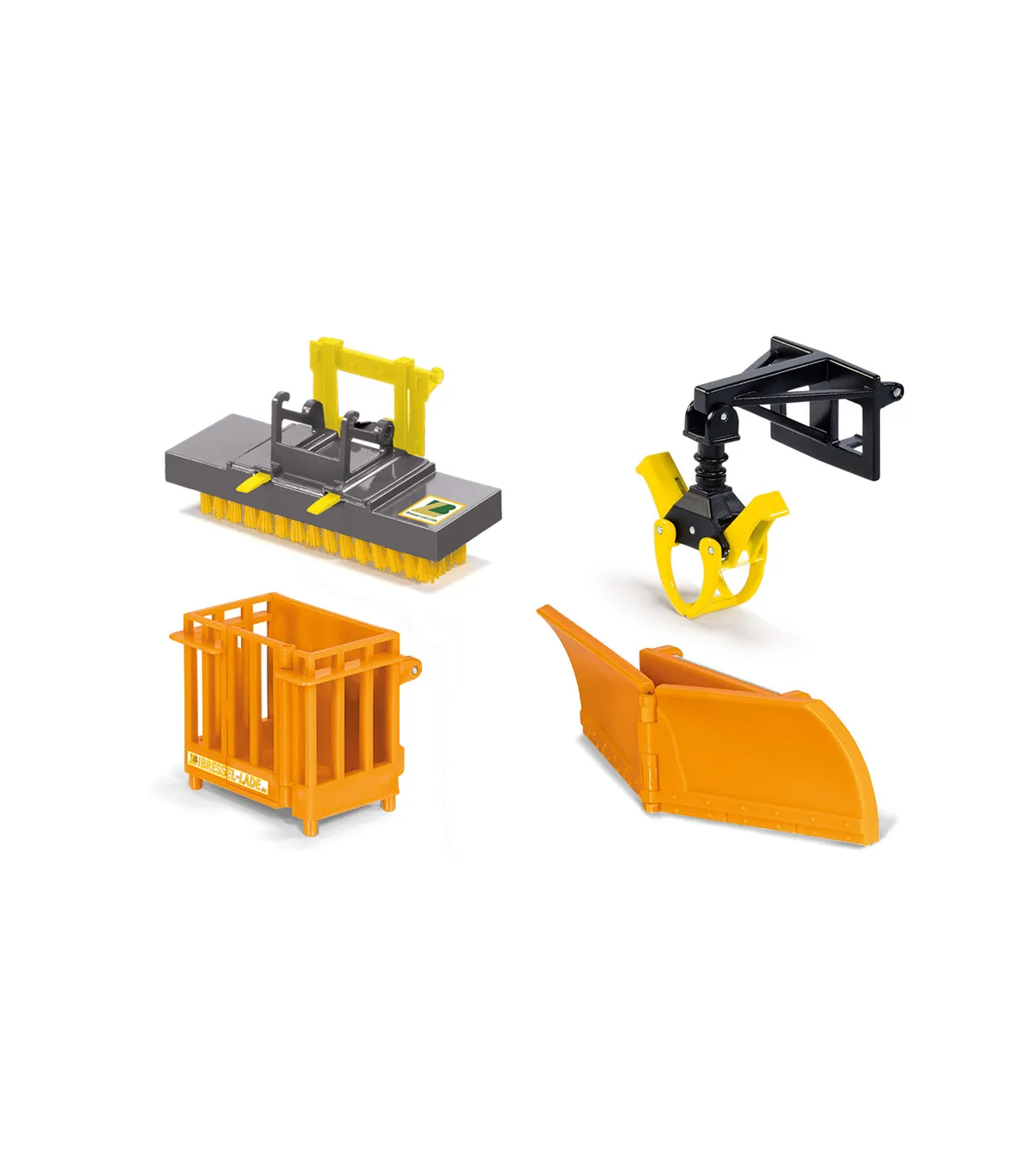 La serie de implementos para tractores SIKUFARMER32 con cargador frontal continúa con este excepcional set. Consta de plataforma de trabajo, pala quitanieves, escoba y recogedor de troncos. La plataforma de trabajo también está equipada con una puerta. La pala quitanieves se puede mover a derecha e izquierda y el agarrador de troncos tiene un elemento de agarre oscilante. La particularidad de la escoba es la horquilla para paletas incluida. Esto puede usarse para levantar la escoba. Las púas de la nueva horquilla para paletas del tractor de carga frontal Fendt 939 Vario (#6778) de la serie SIKUCONTROL también encajan en los soportes del cepillo.