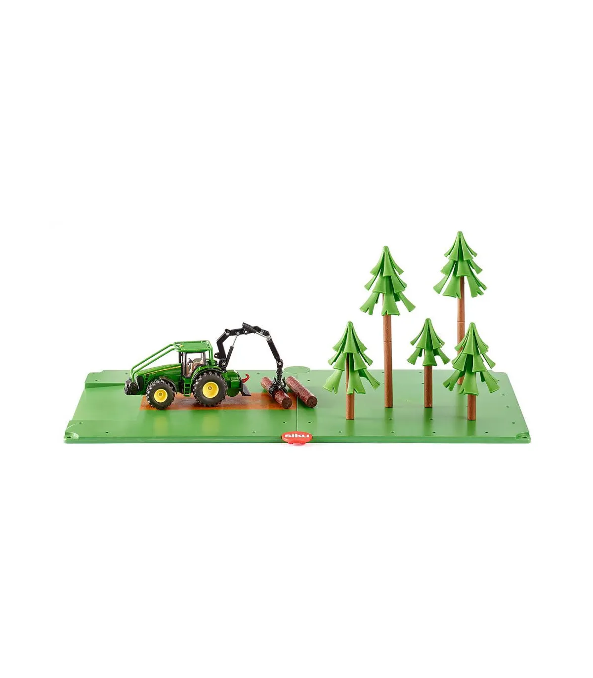 El tractor John Deere con el torno y la grúa está en el bosque vivero en su elemento. Este trabajador forestal se suministra con dos placas de base SIKUWorld 5 y árboles que se pueden variar en la construcción y la altura.