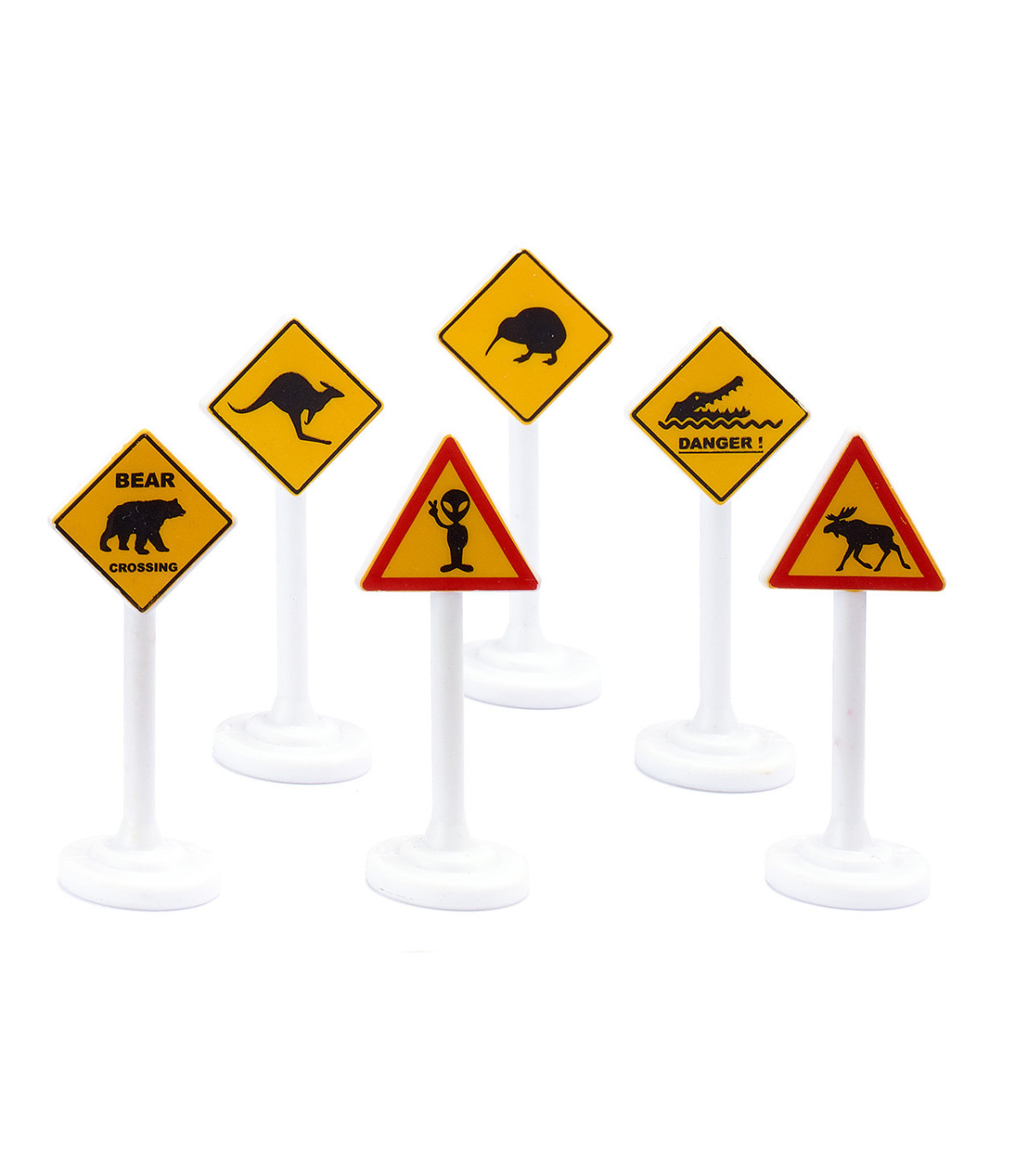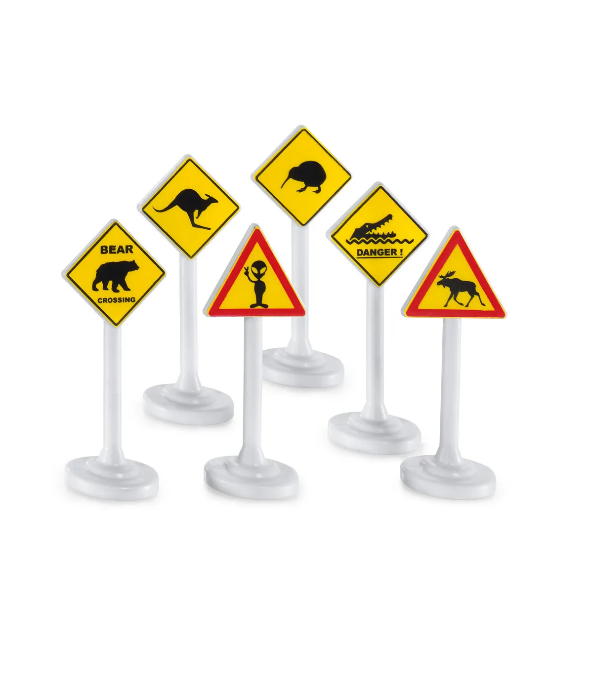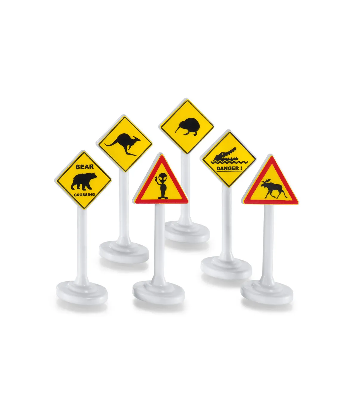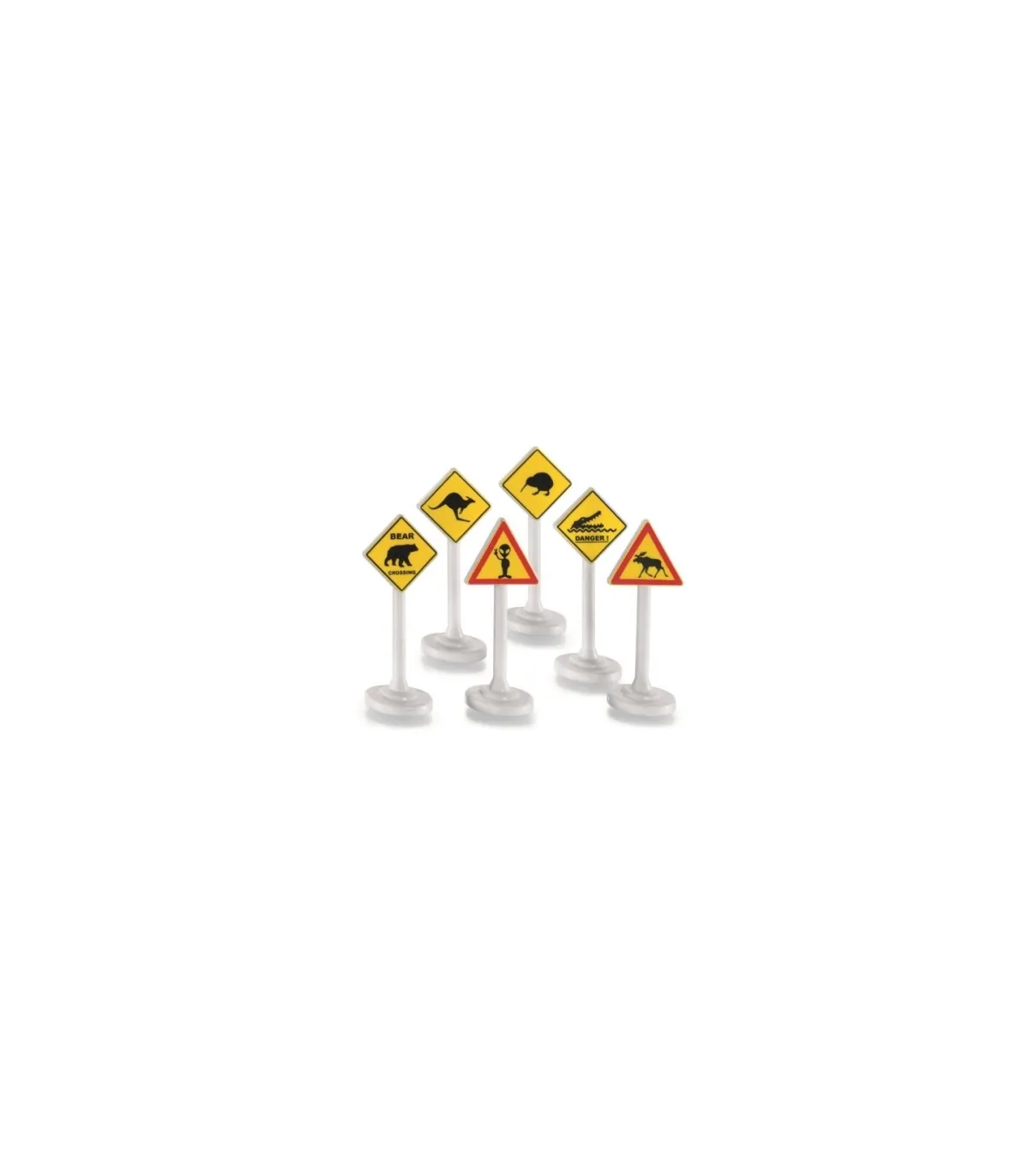 En las zonas rurales, las señales de tráfico piden a la gente que tenga más cuidado con el ganado o los animales salvajes en el bosque. Pero los vehículos SIKU se utilizan en todo el mundo. Por supuesto, hay advertencias sobre otros animales en la carretera o junto a ella: osos, alces, canguros, kiwis y cocodrilos. Y cuando un OVNI aterriza, el extraterrestre te saluda amistosamente. Los carteles fabricados en plástico de alta calidad con la calidad probada de SIKU son especialmente robustos y estables. Con las advertencias internacionales, los vehículos SIKU y SIKUWORLD emprenden viajes de descubrimiento a países extranjeros y continentes lejanos.