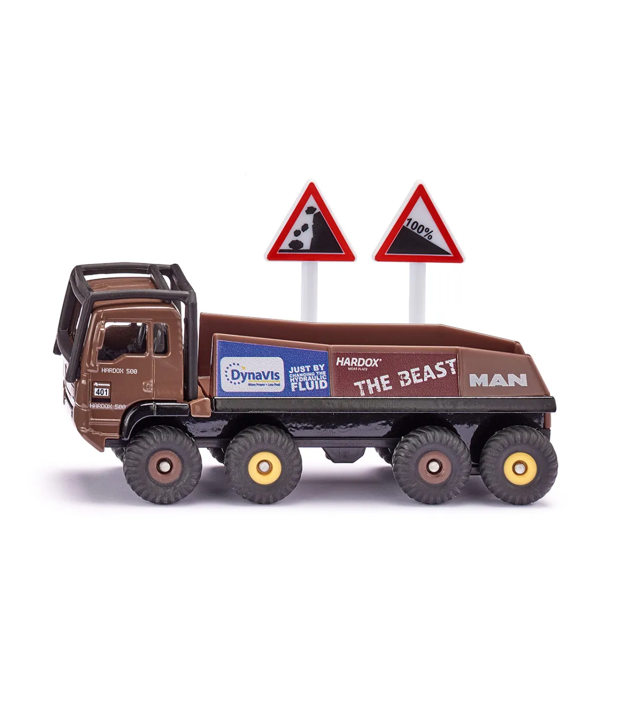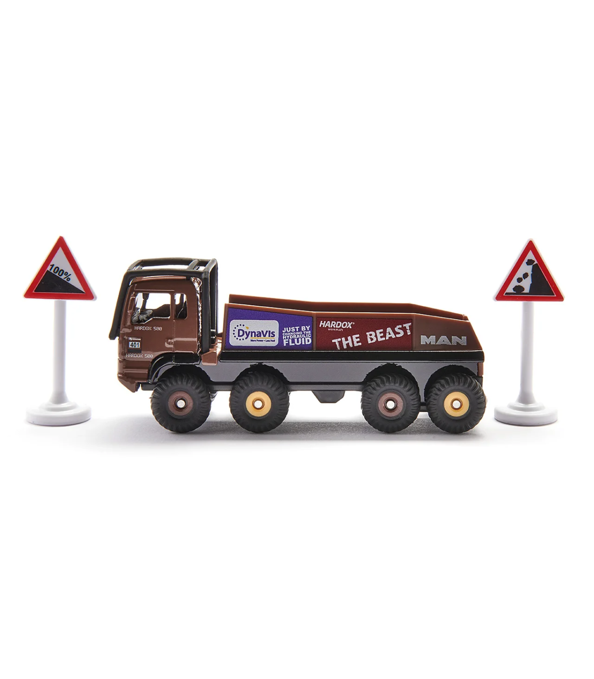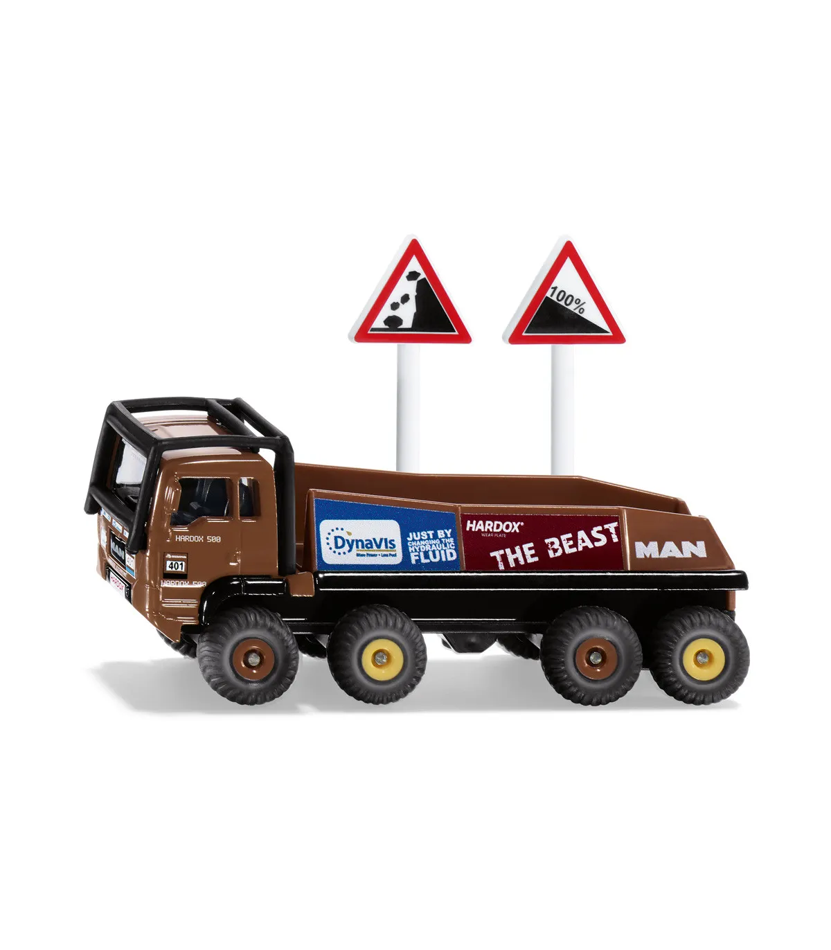 El camino es extremadamente empinado. Los gruesos neumáticos apenas tienen agarre a pesar del cambio todoterreno y la tracción total de cuatro ejes. Listo, ahora es el momento de pasar sobre la roca. Lo que es inimaginable para un camionero es el desafío especial y la emoción para el conductor y los espectadores en la prueba de camiones. El HS Schoch 8x8 MAN Truck Trial está desarrollado y diseñado para un uso todoterreno extremo en competición. El vehículo del ocho veces campeón de Europa de trial de camiones está revestido con los adhesivos originales del patrocinador y está equipado con la barra antivuelco exterior. Con los dos carteles incluidos en el paquete se puede transformar la habitación infantil en un campo de prueba.