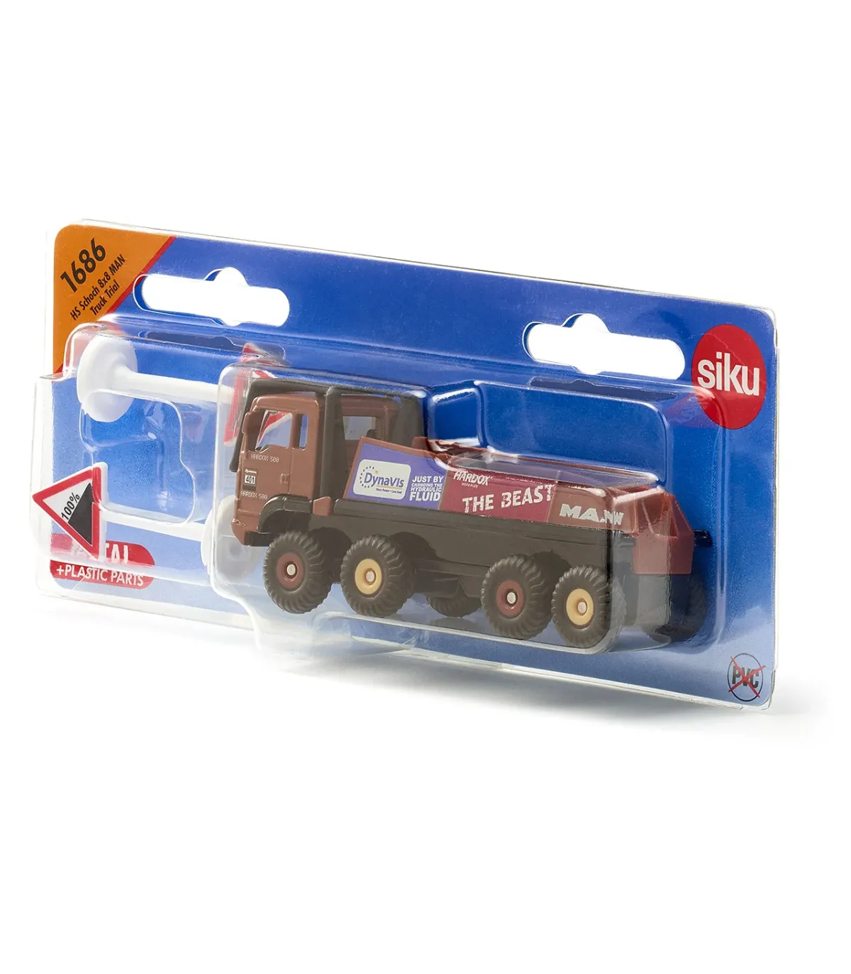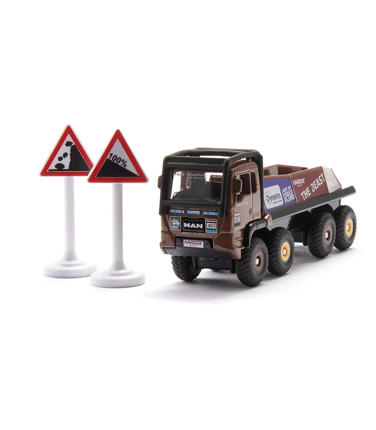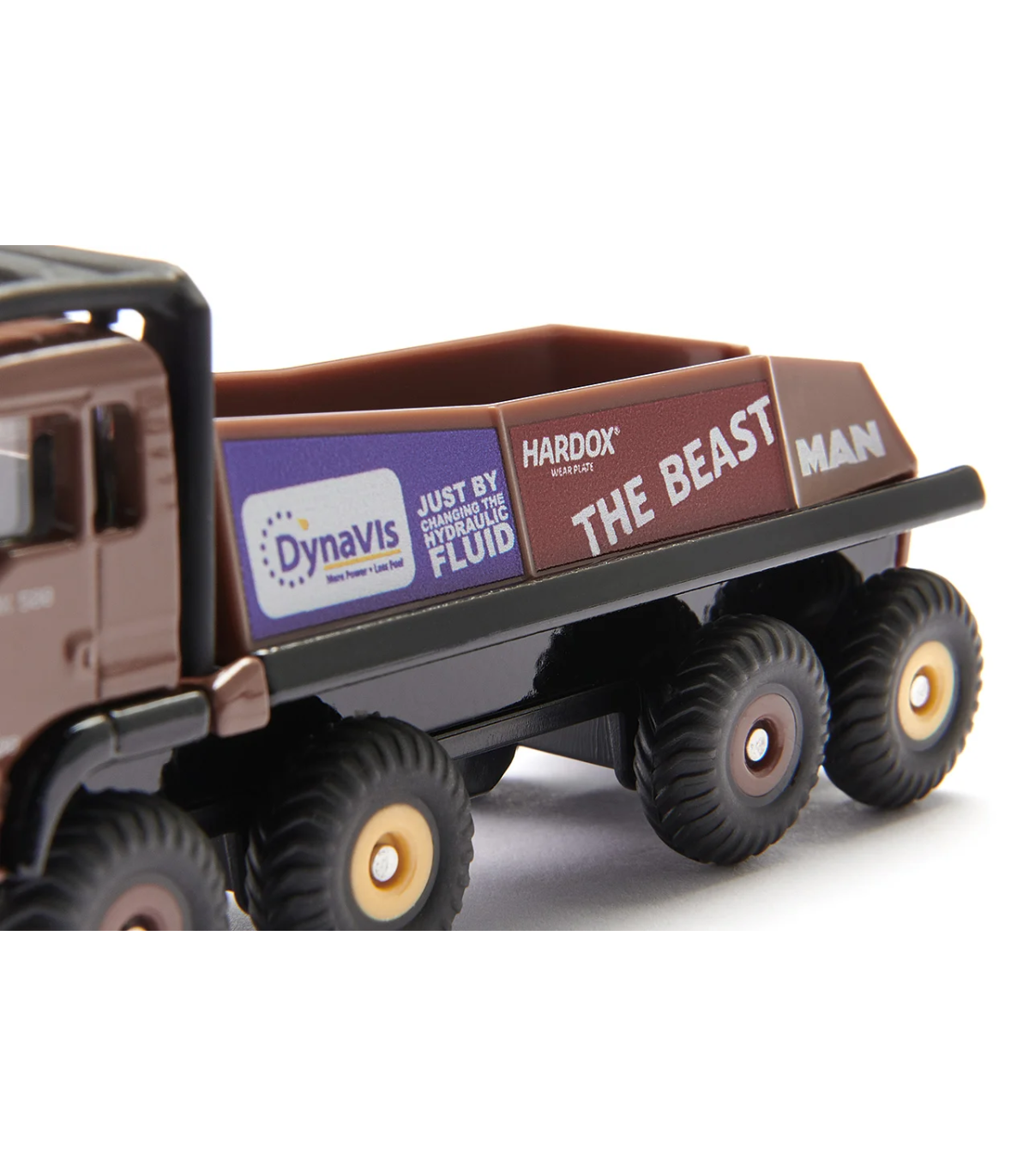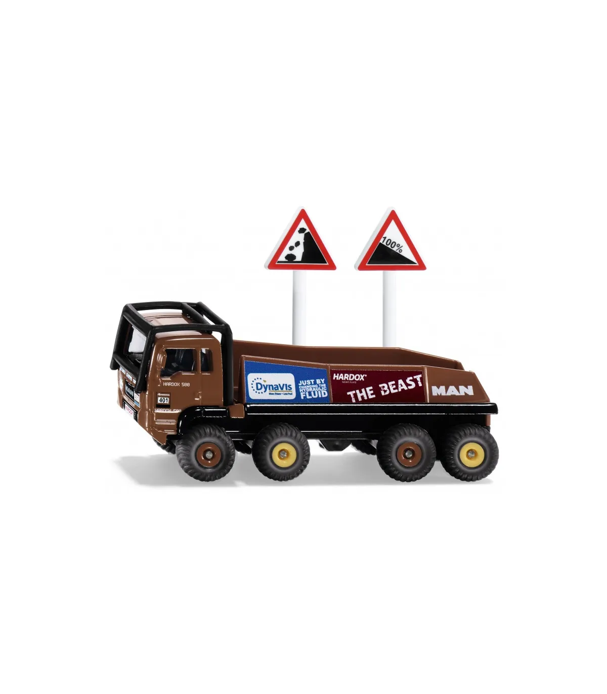 El camino es extremadamente empinado. Los gruesos neumáticos apenas tienen agarre a pesar del cambio todoterreno y la tracción total de cuatro ejes. Listo, ahora es el momento de pasar sobre la roca. Lo que es inimaginable para un camionero es el desafío especial y la emoción para el conductor y los espectadores en la prueba de camiones. El HS Schoch 8x8 MAN Truck Trial está desarrollado y diseñado para un uso todoterreno extremo en competición. El vehículo del ocho veces campeón de Europa de trial de camiones está revestido con los adhesivos originales del patrocinador y está equipado con la barra antivuelco exterior. Con los dos carteles incluidos en el paquete se puede transformar la habitación infantil en un campo de prueba.
