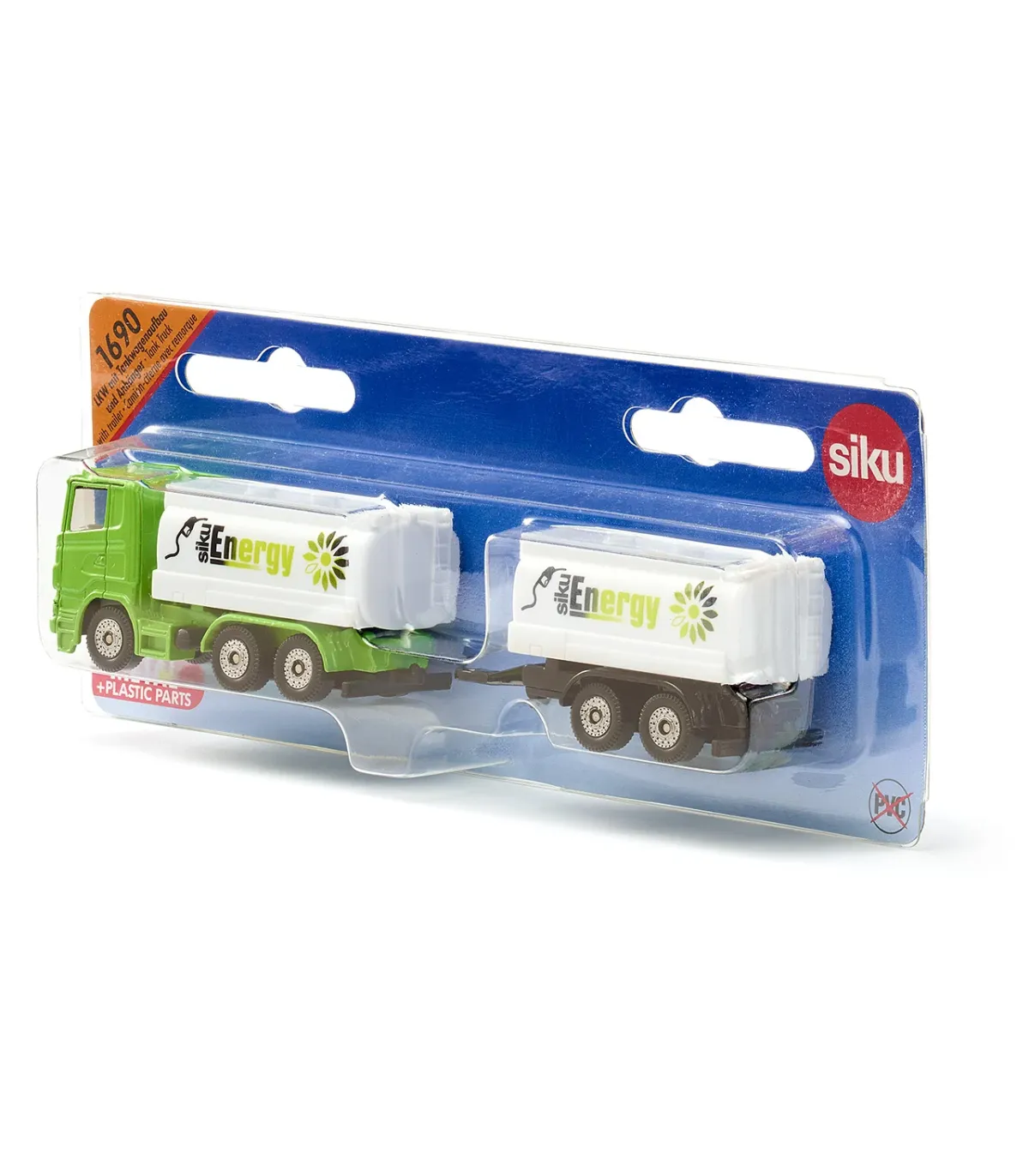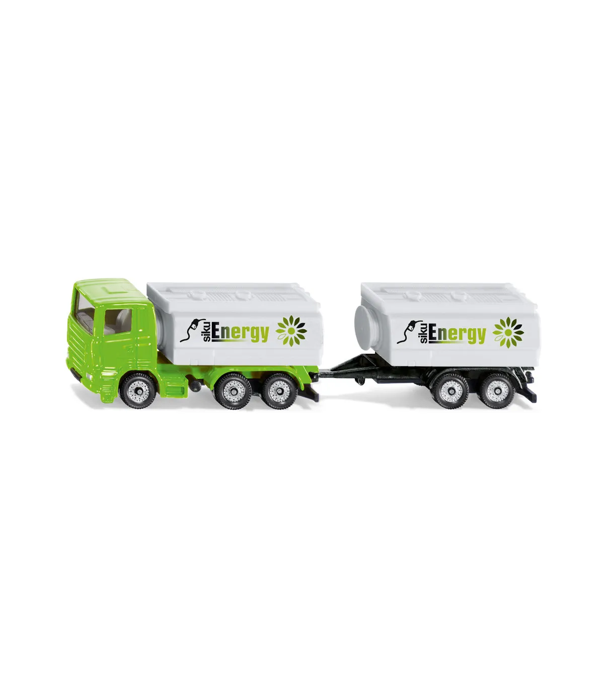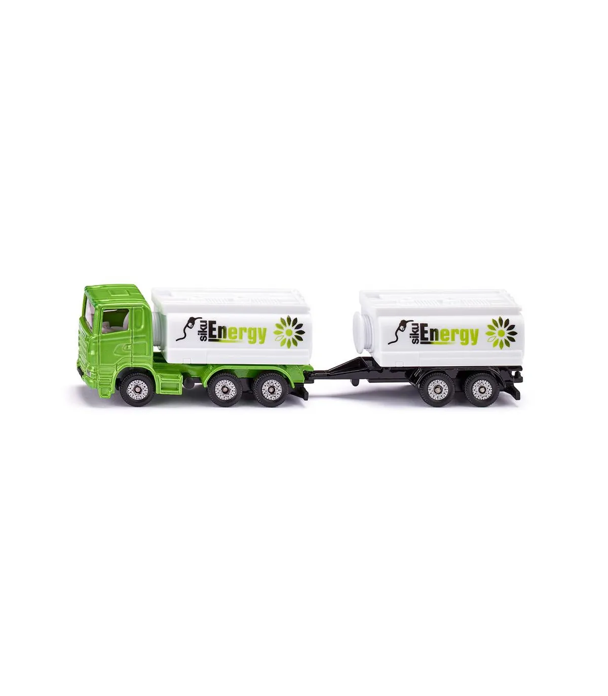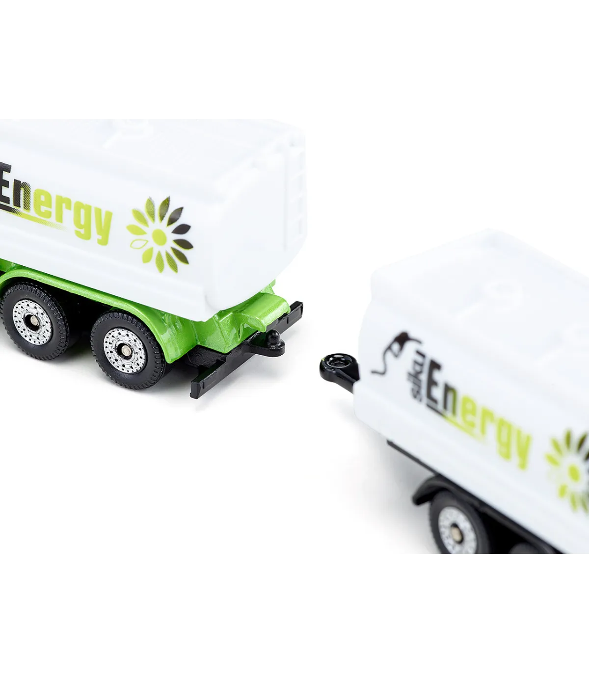 Cuando el indicador de combustible está en la zona roja, ya es hora de que los automóviles, camiones, tractores y autobuses SIKU hagan la siguiente parada para repostar combustible en la gasolinera SIKUWORLD. La gasolinera se abastece con el nuevo camión cisterna de energía SIKU: un camión cisterna de tres ejes con cabina del conductor de color verde brillante y un remolque tándem con carrocería de plástico.