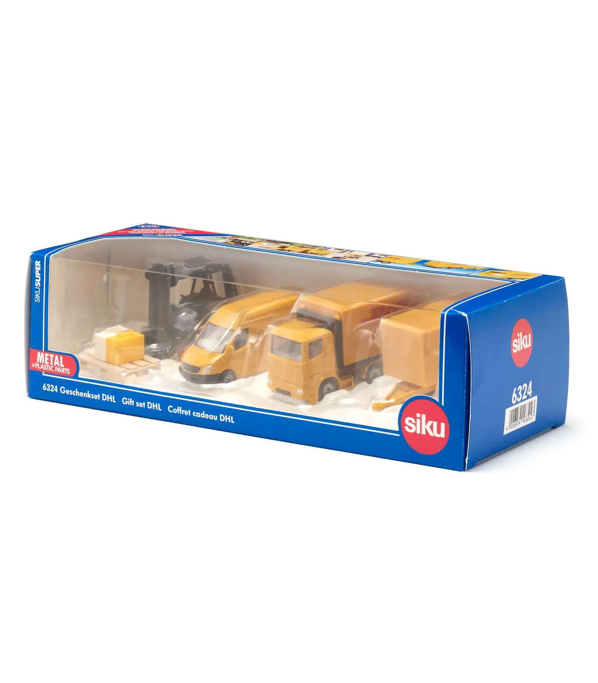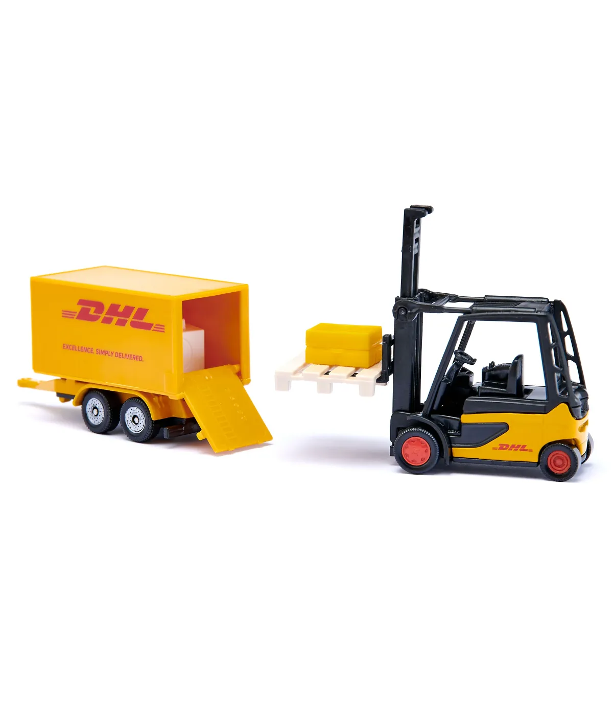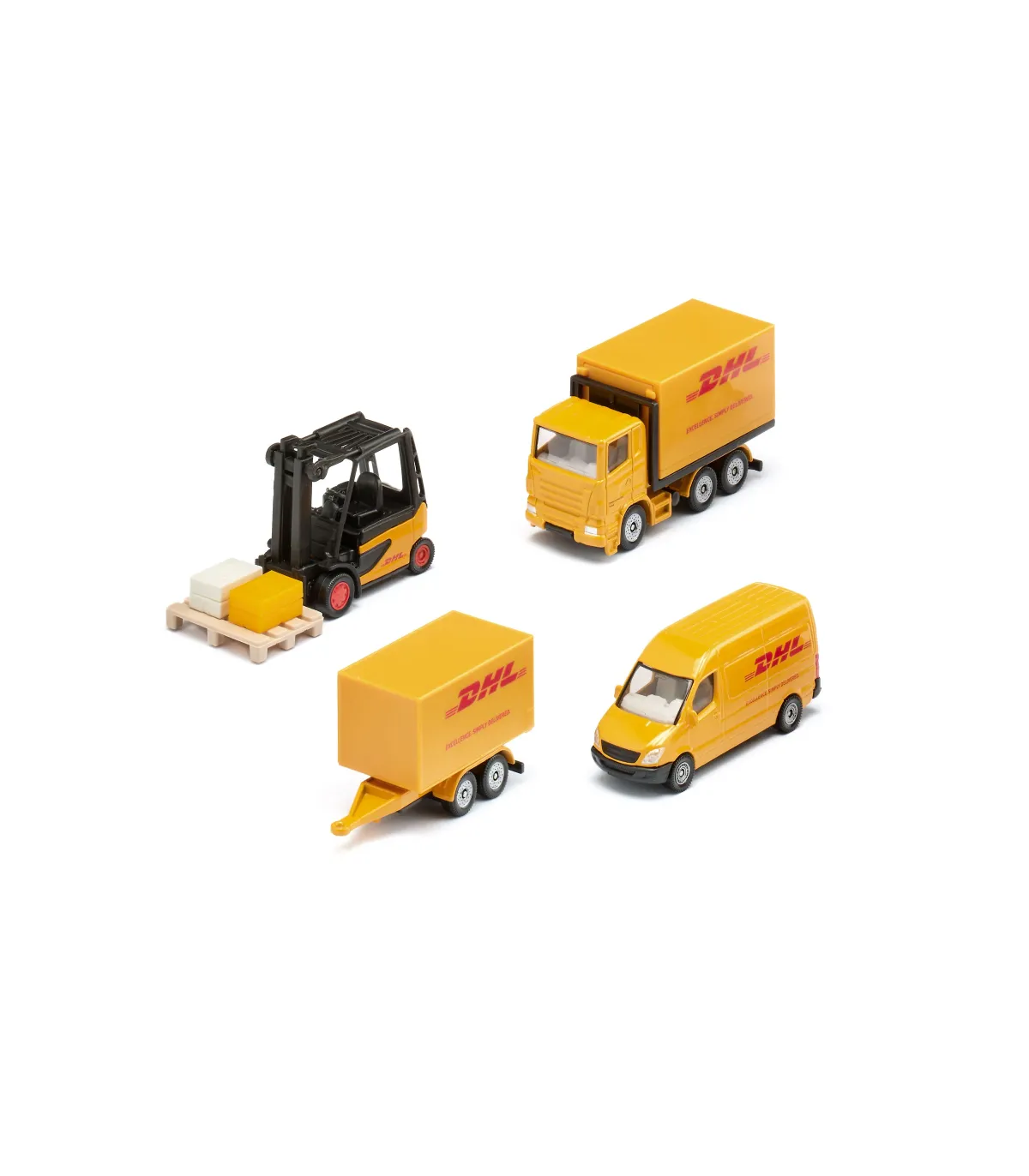 No importa si se trata de una gran ciudad o de un tranquilo pueblo de provincia: los vehículos de reparto amarillos con las tres grandes letras rojas del servicio de paquetería y envío urgente DHL se encuentran en todas partes y en todas partes. El servicio de paquetería se fundó en San Francisco en 1969 como empresa de transporte de fondos: los tres fundadores entregaban documentos de envío de barcos y otros documentos importantes en avión desde San Francisco a Honolulu. Las primeras letras de sus apellidos formaban el nombre de la empresa: Adrian Dalsey, Larry Hillblom y Robert Lynn. Por supuesto, DHL y sus característicos vehículos de reparto no pueden faltar en la habitación de ningún niño en las ciudades y pueblos de juegos, donde entregan diligentemente cartas, paquetes y encomiendas. El set de regalo de DHL, compuesto por un camión con remolque, una carretilla elevadora y un transportador, garantiza que todo funcione lo mejor posible. Por supuesto, cada uno de los vehículos se puede reconocer inmediatamente por su pintura amarilla de DHL con el logotipo de licencia de DHL. También hay una amplia gama de paquetes que quieren ser entregados. Entonces vamos…