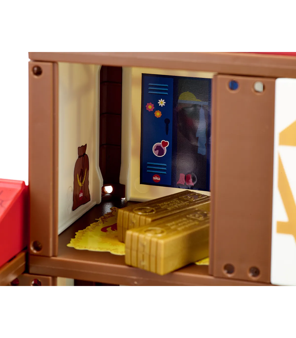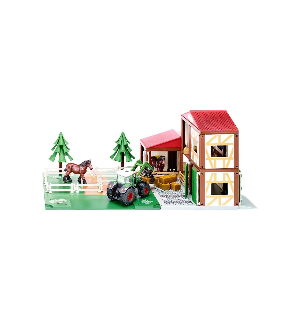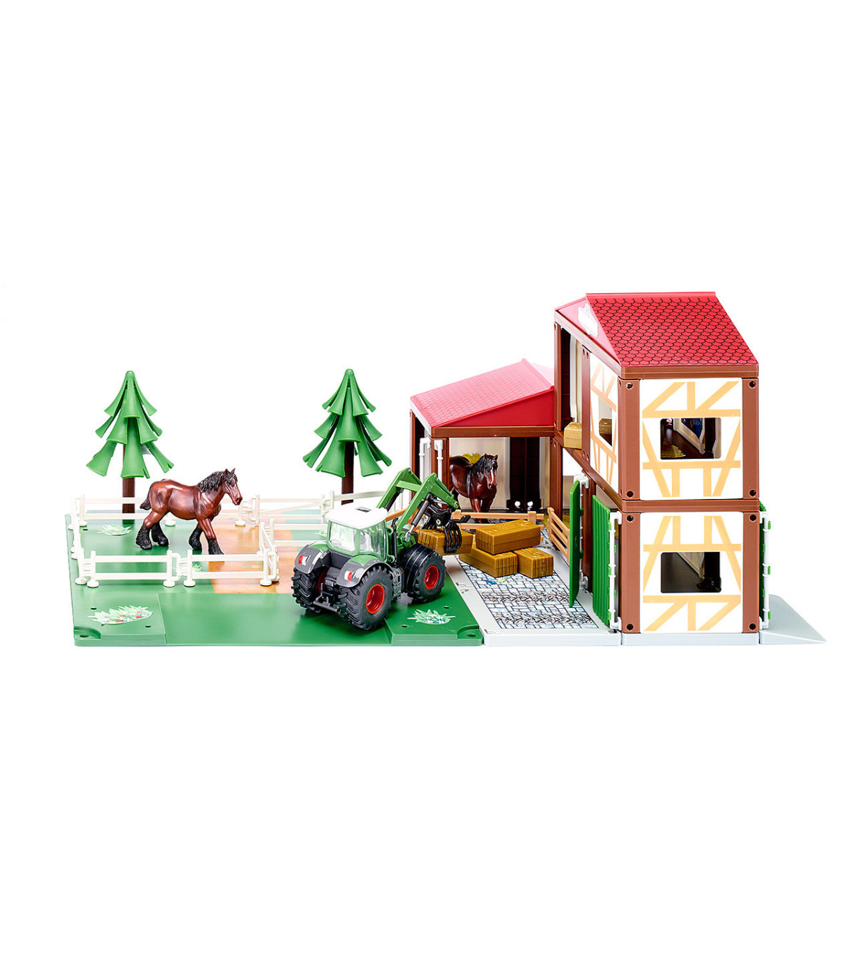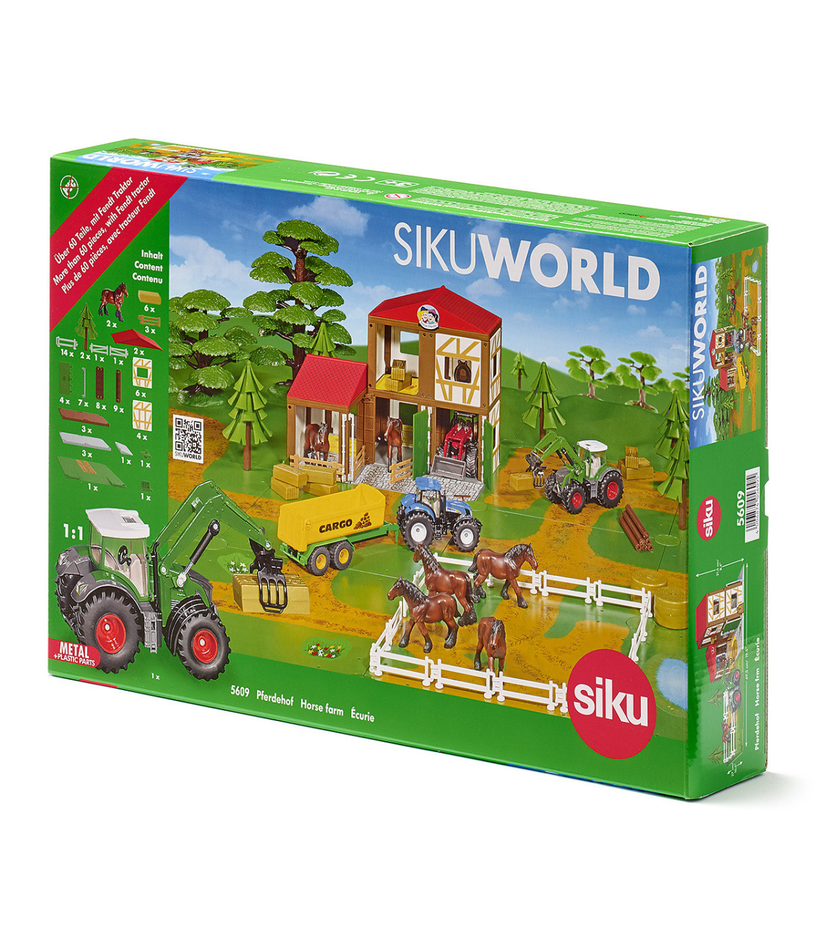 El set es una extensión ideal de SIKUWORLD, pero también ofrece la diversión de su propio mundo de juego. La granja de caballos SIKUWORLD inspira a los niños a un nuevo mundo de juego con animales y la vida rural en la granja. Los caballos que se encuentran en el prado saludan a sus amantes con un fuerte relincho: el próximo paseo es inminente. Pero primero todavía queda mucho por hacer en la granja. El tractor Fendt 939 incluido y la pinza para balas se utilizan para almacenar las balas de heno en el pajar. Los elementos de construcción con entramado de madera se pueden montar de forma intuitiva y sencilla para los niños mediante el sistema enchufable, y también se pueden ampliar y transformar según sus propias ideas. El edificio de dos plantas tiene un pasillo y también se pueden utilizar los establos de caballos y el pajar.