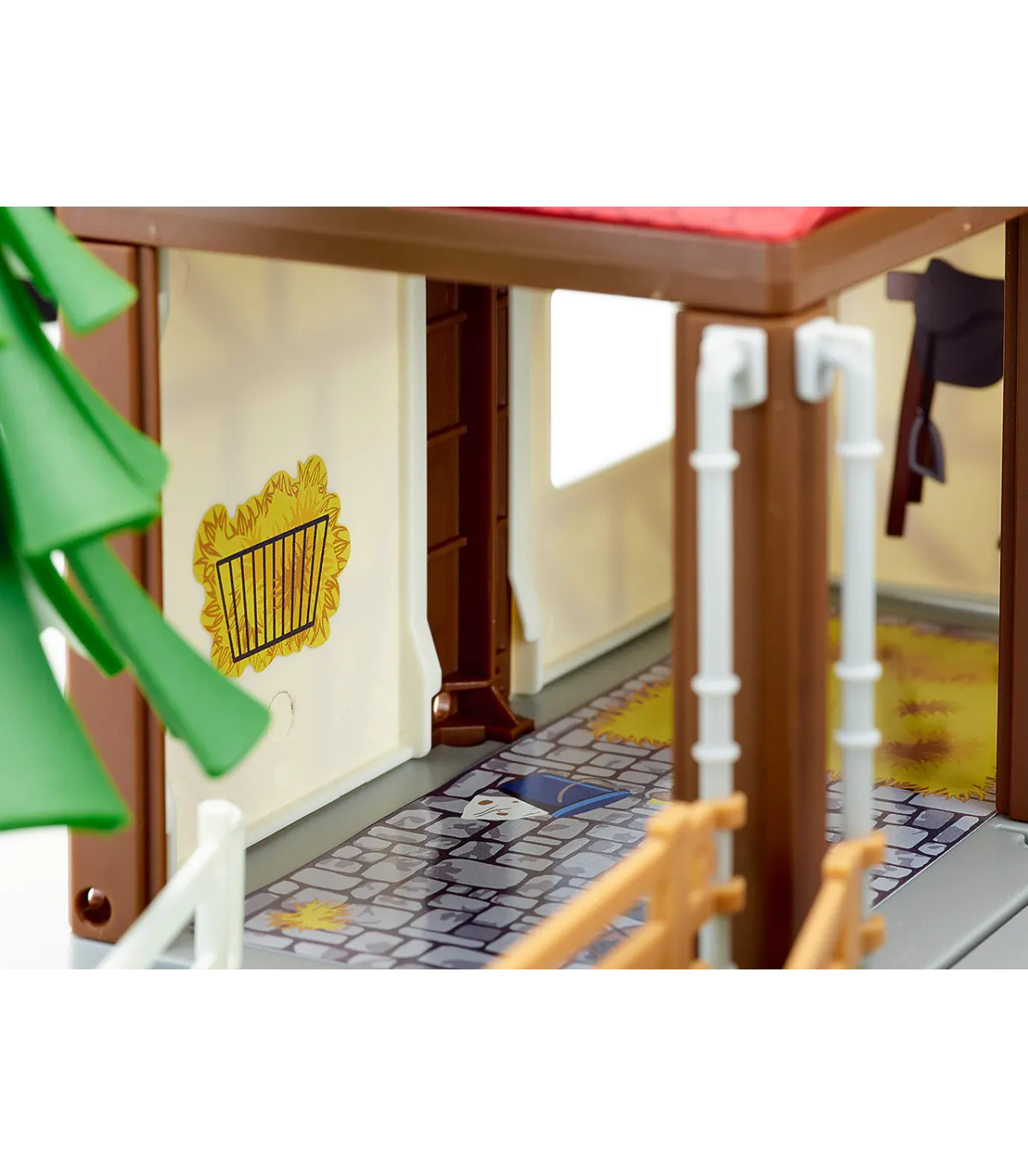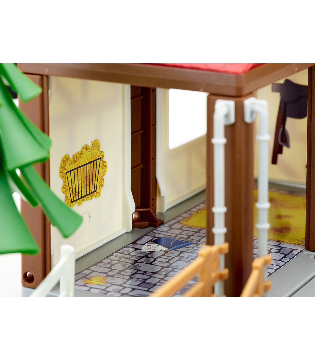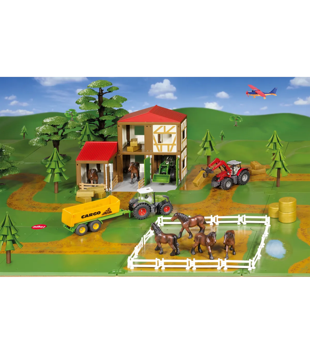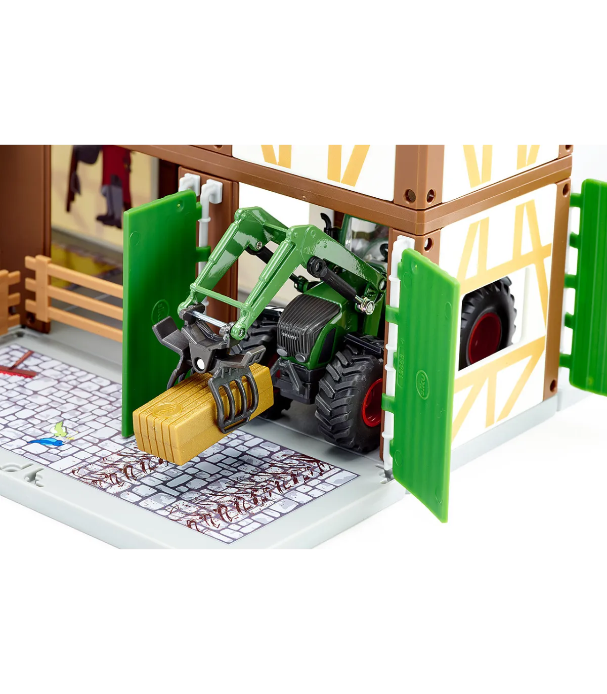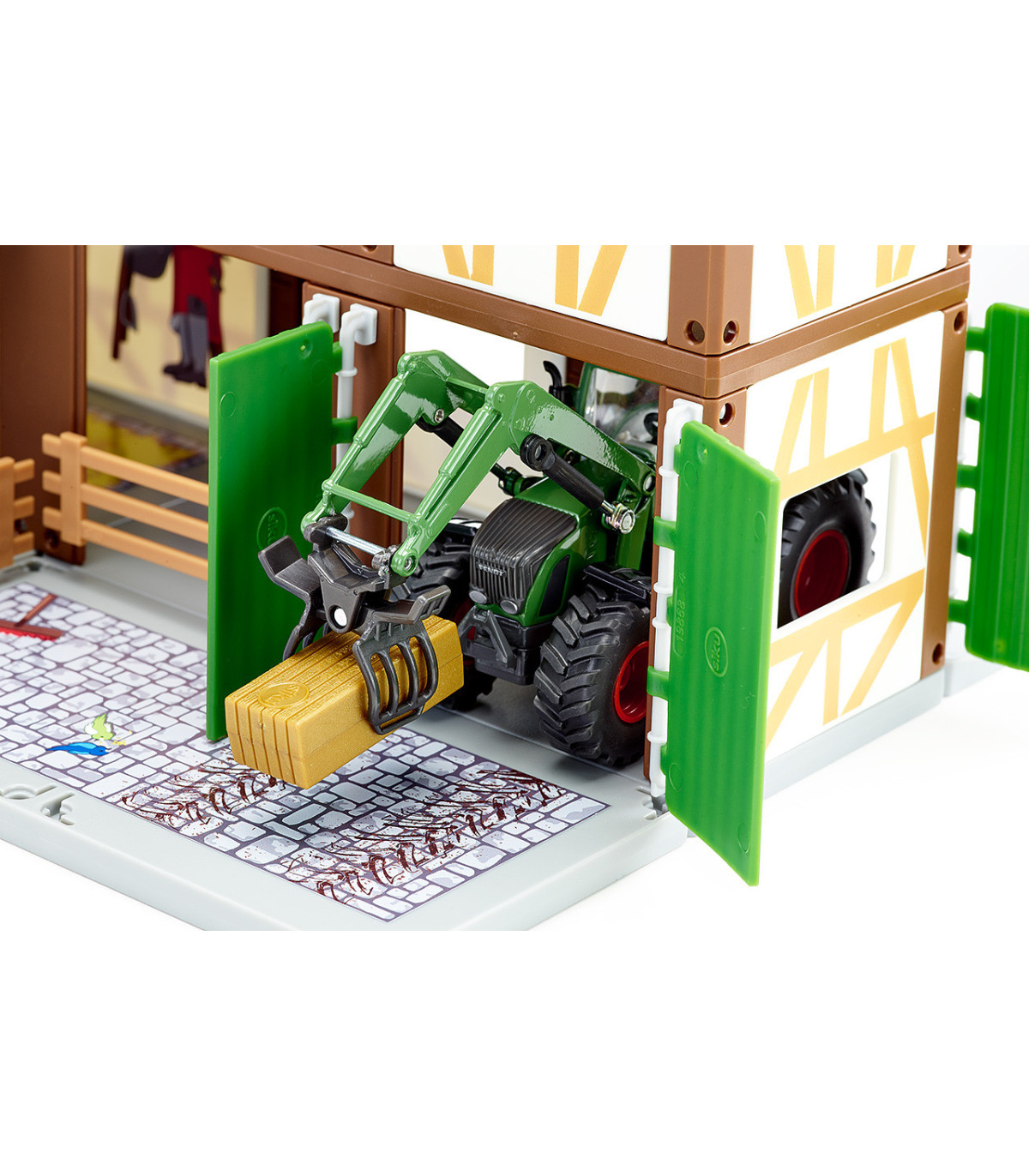 El set es una extensión ideal de SIKUWORLD, pero también ofrece la diversión de su propio mundo de juego. La granja de caballos SIKUWORLD inspira a los niños a un nuevo mundo de juego con animales y la vida rural en la granja. Los caballos que se encuentran en el prado saludan a sus amantes con un fuerte relincho: el próximo paseo es inminente. Pero primero todavía queda mucho por hacer en la granja. El tractor Fendt 939 incluido y la pinza para balas se utilizan para almacenar las balas de heno en el pajar. Los elementos de construcción con entramado de madera se pueden montar de forma intuitiva y sencilla para los niños mediante el sistema enchufable, y también se pueden ampliar y transformar según sus propias ideas. El edificio de dos plantas tiene un pasillo y también se pueden utilizar los establos de caballos y el pajar.