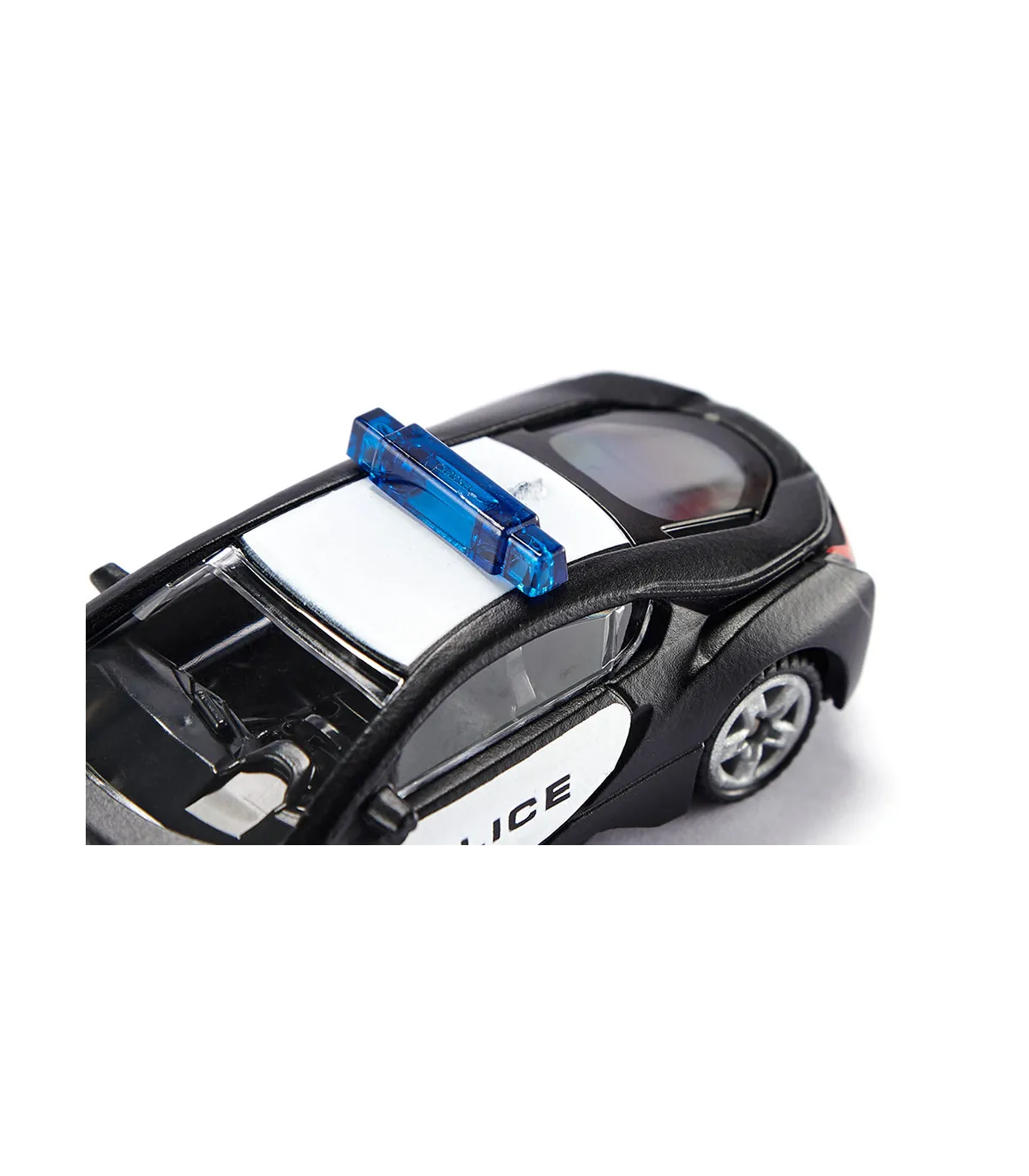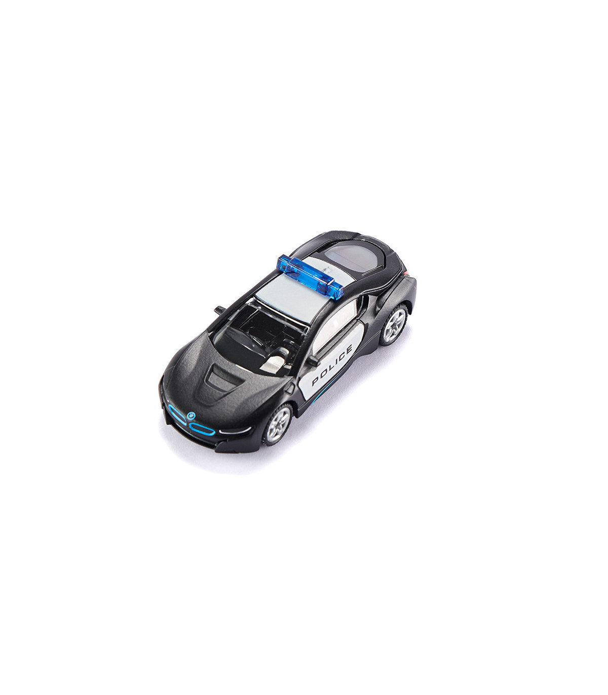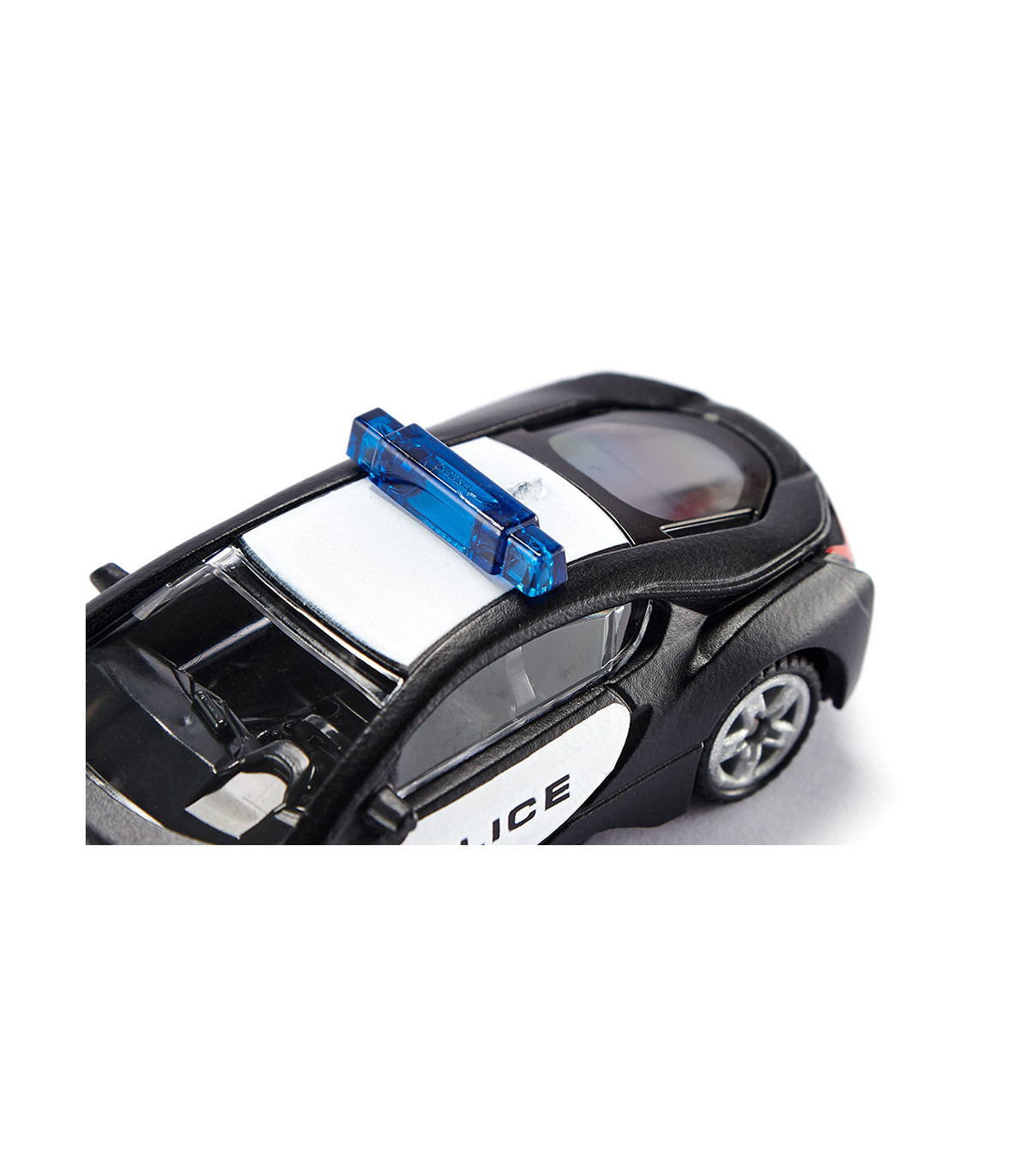 En silencio en la carretera Antes los policías conducían motores V8, ahora los agentes de policía persiguen a los infractores de velocidad casi en silencio con el BMW i8 en las autopistas de Los Ángeles. El deportivo híbrido circula por la carretera a velocidades de hasta 250 km/h sobre llantas deportivas con neumáticos de material engomado. Con la barra de señales en el techo y la llamativa pintura blanca y negra, los policías son los jefes en la carretera. Mientras que la carrocería del original está hecha predominantemente de carbono, la versión siku está hecha de metal.