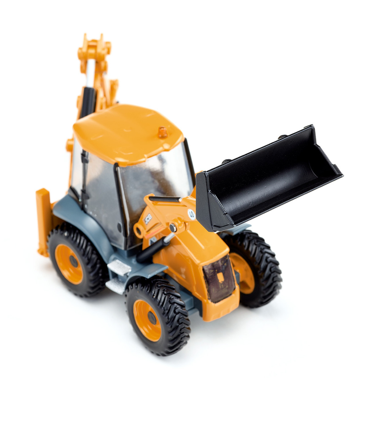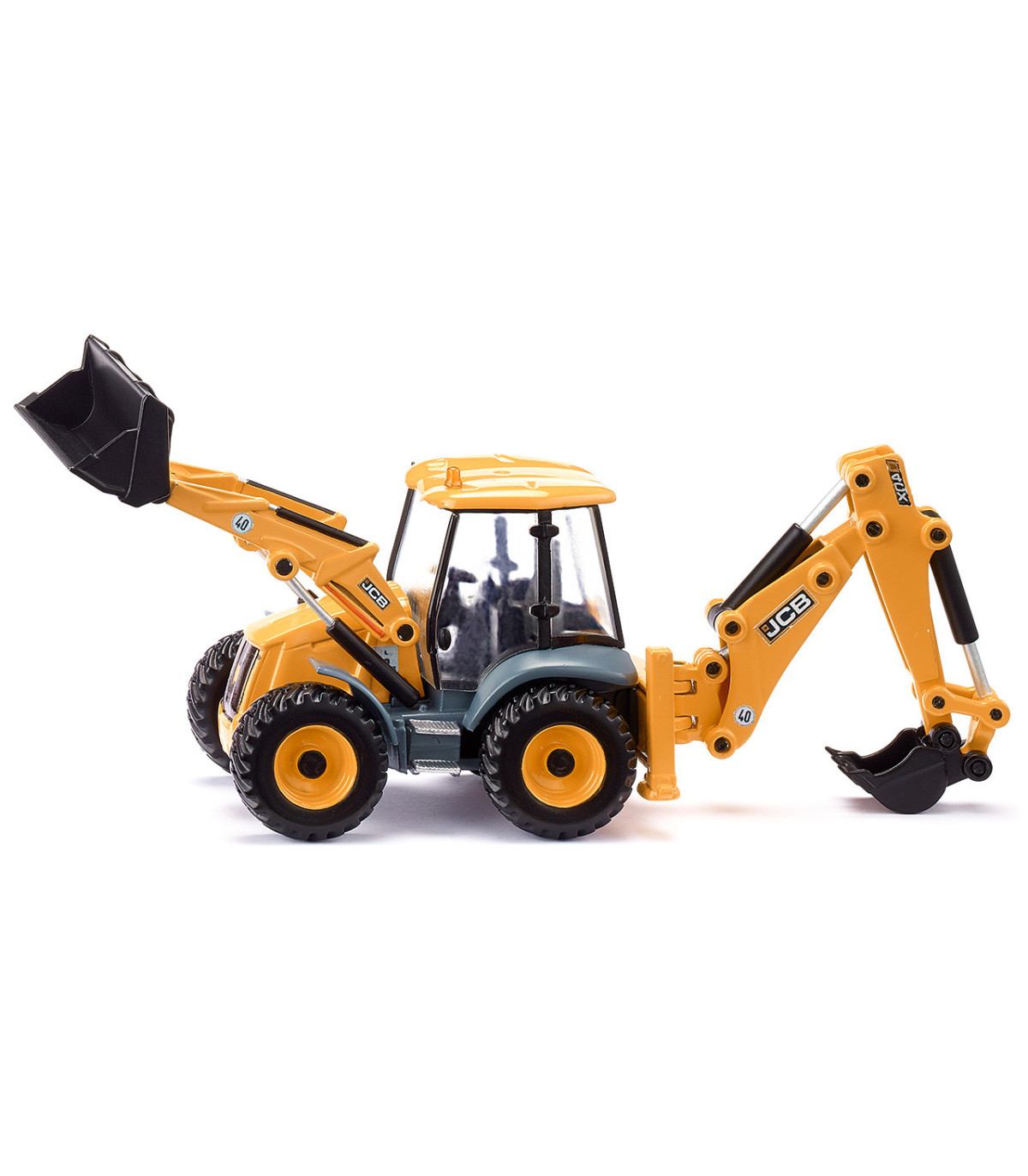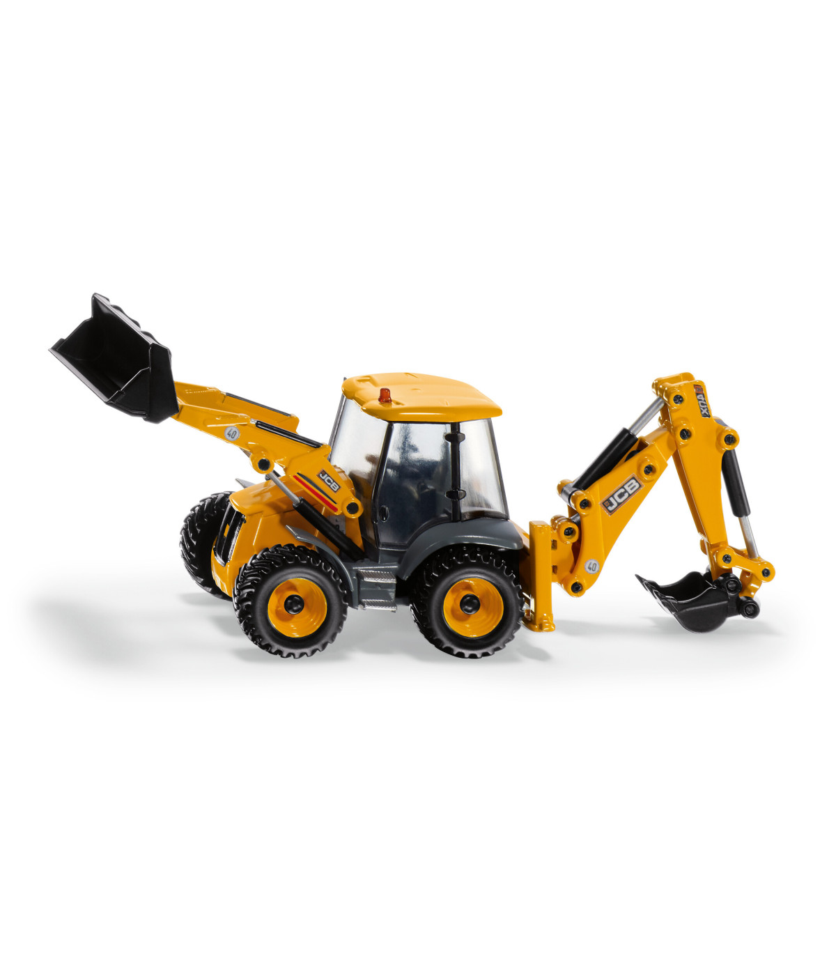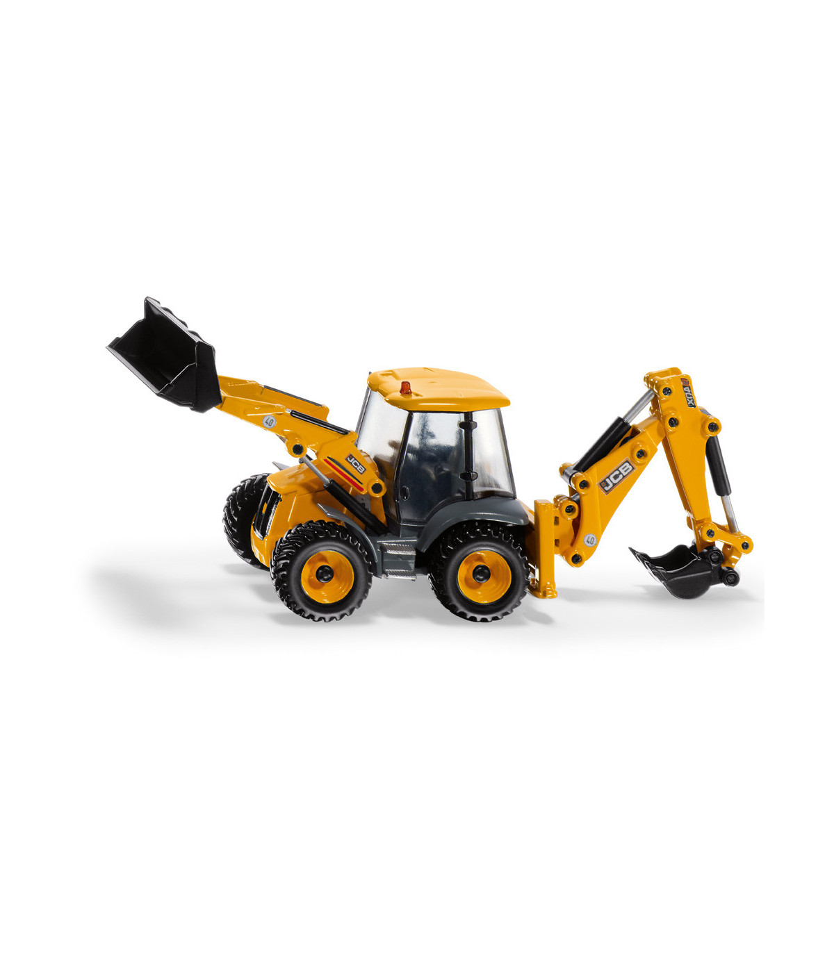 Un todoterreno para la obra Las retroexcavadoras son un todoterreno en la obra: cargadoras sobre ruedas delante y excavadoras detrás. Esto permite utilizar las máquinas de construcción compactas de diversas formas en la obra. La retroexcavadora JCB 4CX es el todoterreno para los pequeños constructores en la habitación de los niños. El vehículo a escala 1:50 cuenta con un cargador frontal móvil, una excavadora trasera y palas. El brazo de la excavadora en la parte trasera también se puede girar hacia la derecha y hacia la izquierda.