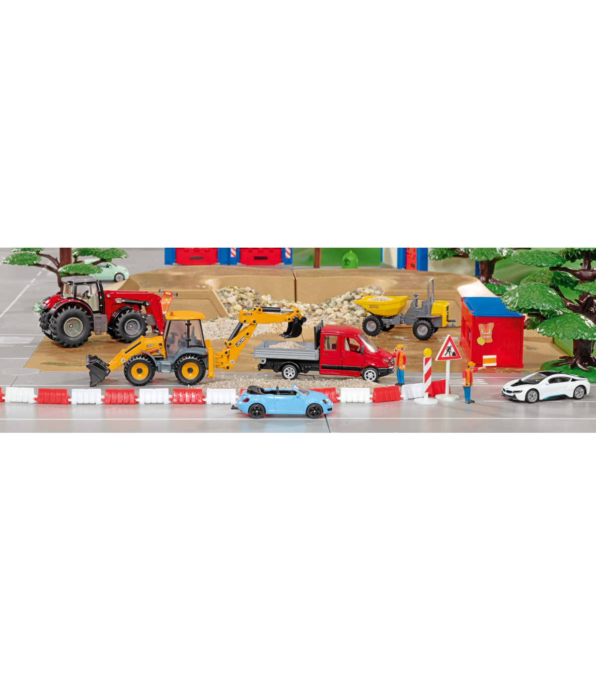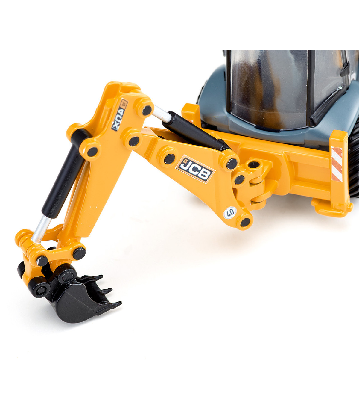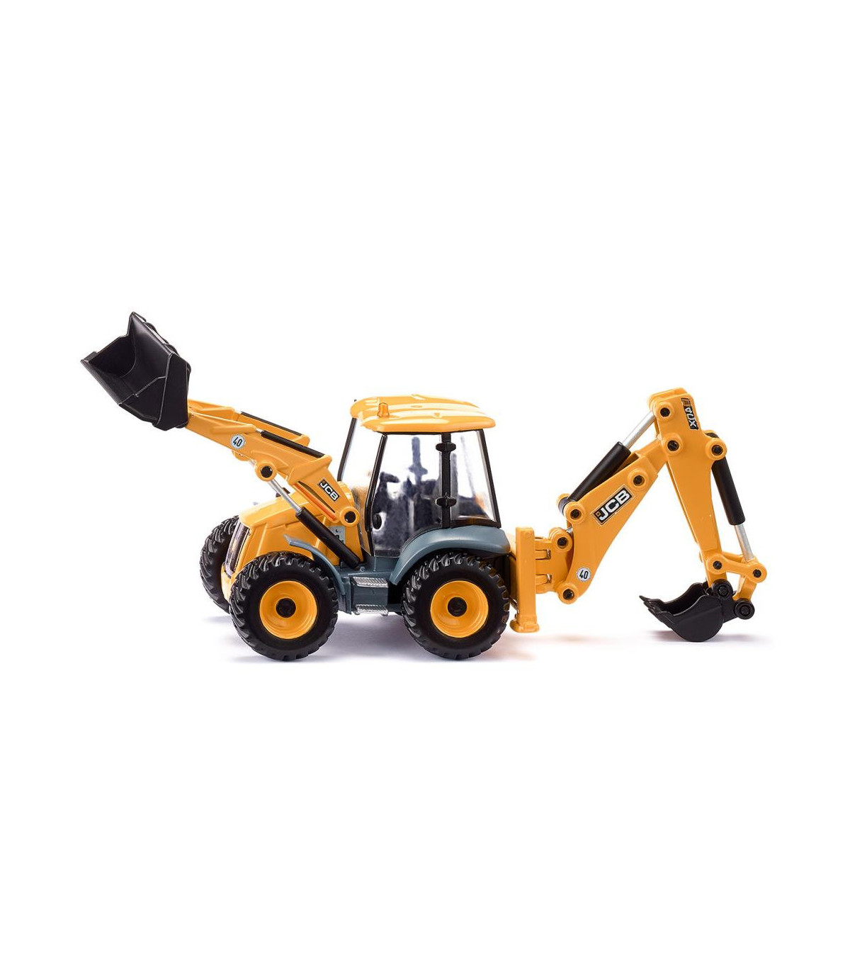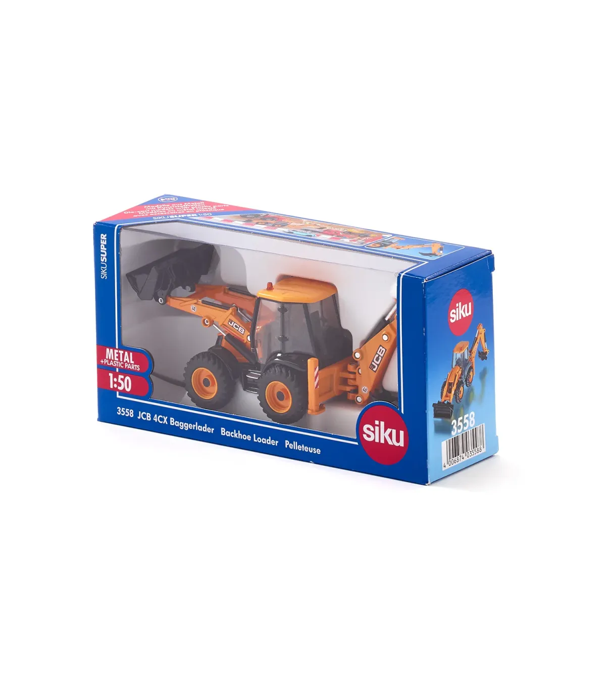 Un todoterreno para la obra Las retroexcavadoras son un todoterreno en la obra: cargadoras sobre ruedas delante y excavadoras detrás. Esto permite utilizar las máquinas de construcción compactas de diversas formas en la obra. La retroexcavadora JCB 4CX es el todoterreno para los pequeños constructores en la habitación de los niños. El vehículo a escala 1:50 cuenta con un cargador frontal móvil, una excavadora trasera y palas. El brazo de la excavadora en la parte trasera también se puede girar hacia la derecha y hacia la izquierda.