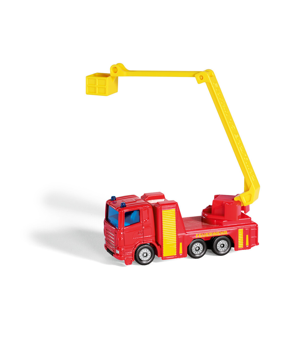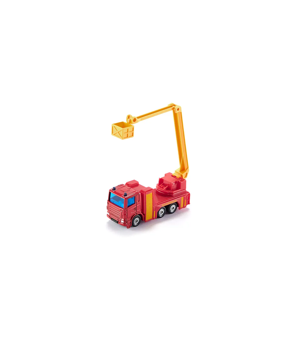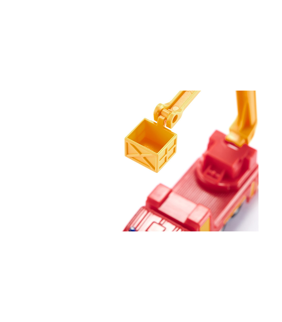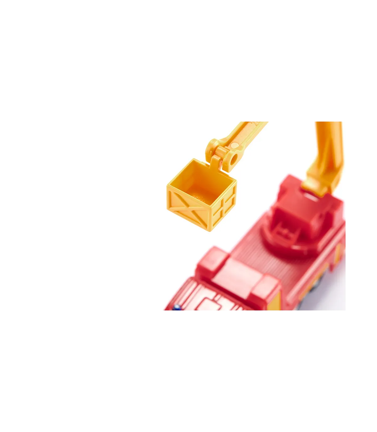 Rescate desde altura Incendio en el cuarto piso, no es posible realizar rescate a través de la escalera, entonces la plataforma aérea de rescate de los bomberos se encuentra en el lugar. Al igual que en el modelo más grande, el mástil se puede girar, la cesta de transporte se puede girar y la plataforma aérea de rescate se puede desplegar. La plataforma aérea de salvamento para bomberos siku se utiliza sobre un chasis de 3 ejes con cabina de conductor de metal.