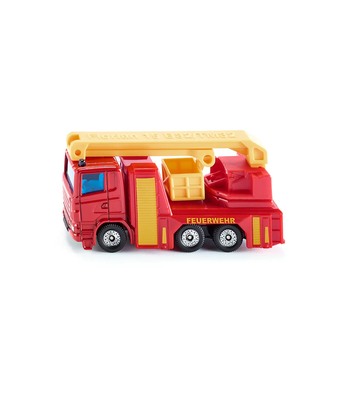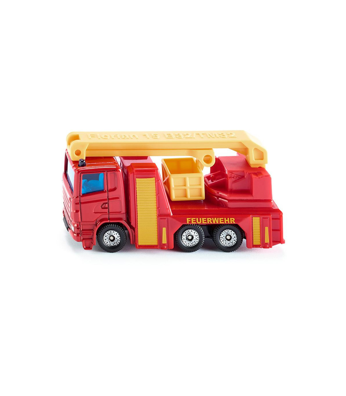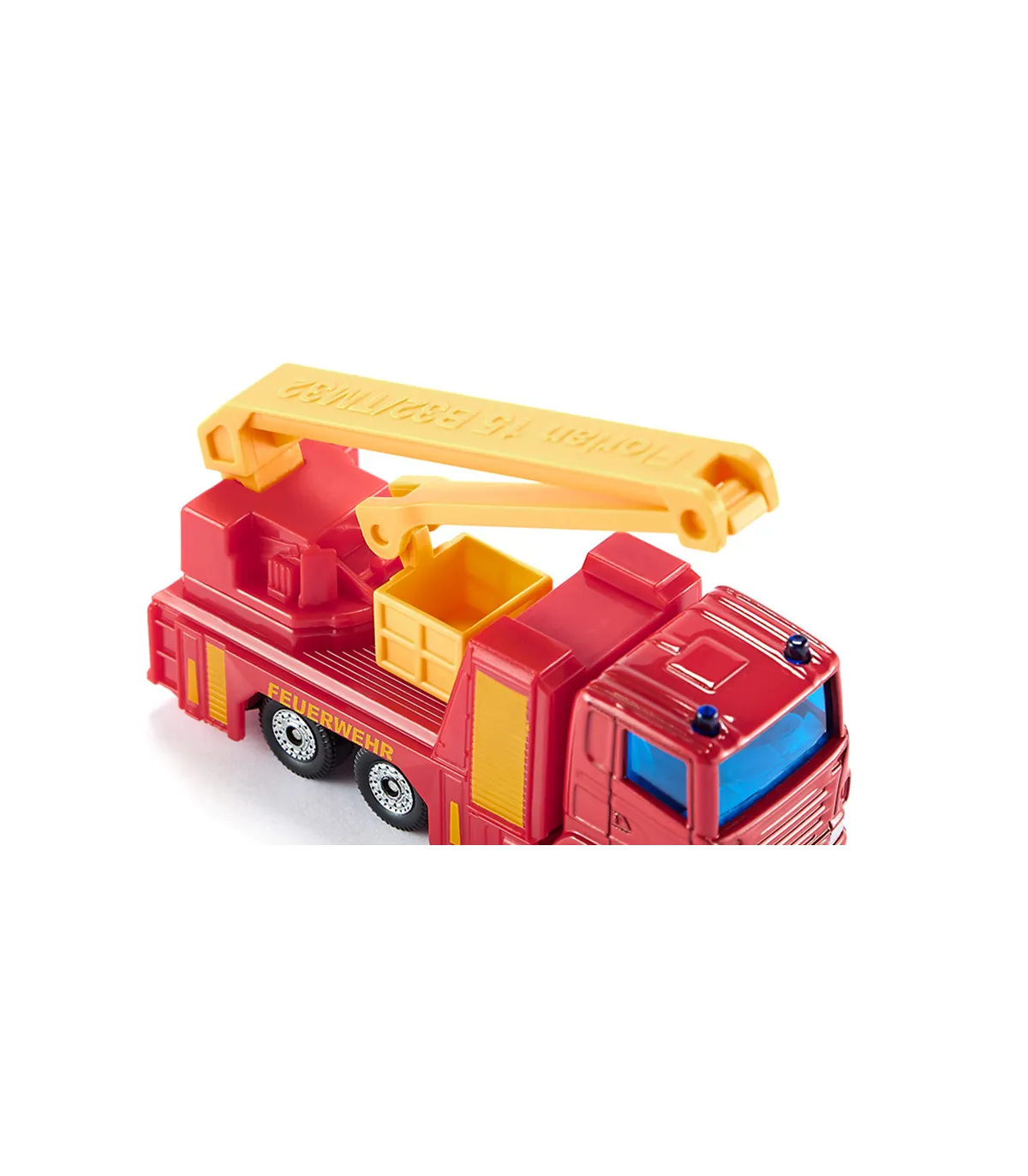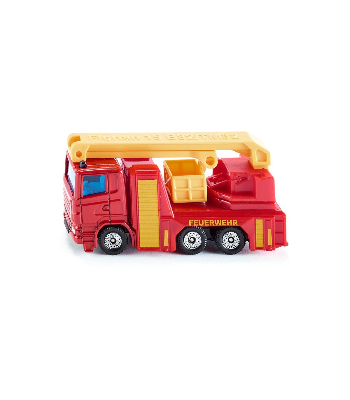 Rescate desde altura Incendio en el cuarto piso, no es posible realizar rescate a través de la escalera, entonces la plataforma aérea de rescate de los bomberos se encuentra en el lugar. Al igual que en el modelo más grande, el mástil se puede girar, la cesta de transporte se puede girar y la plataforma aérea de rescate se puede desplegar. La plataforma aérea de salvamento para bomberos siku se utiliza sobre un chasis de 3 ejes con cabina de conductor de metal.