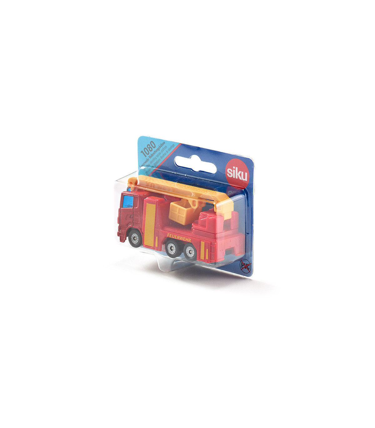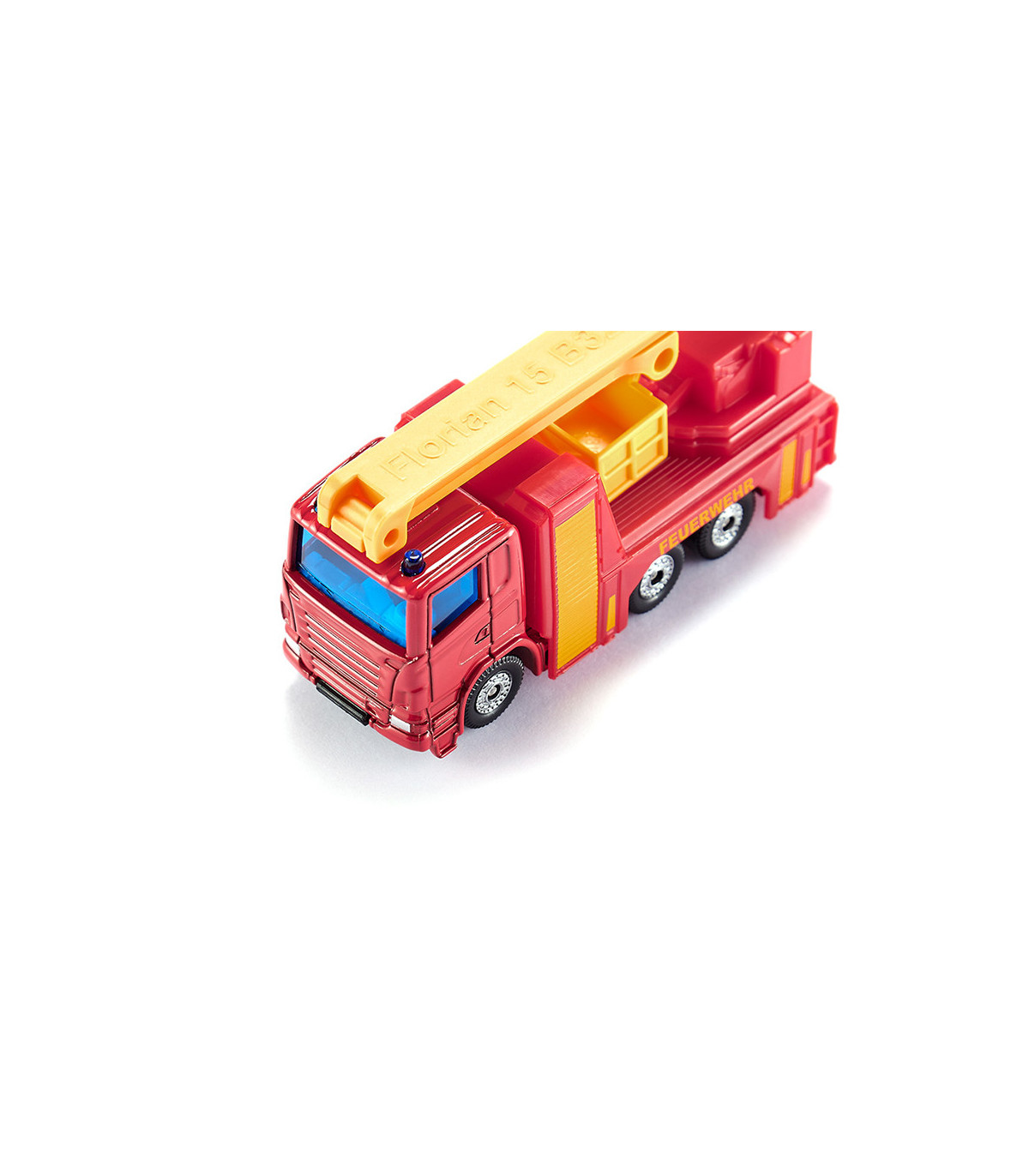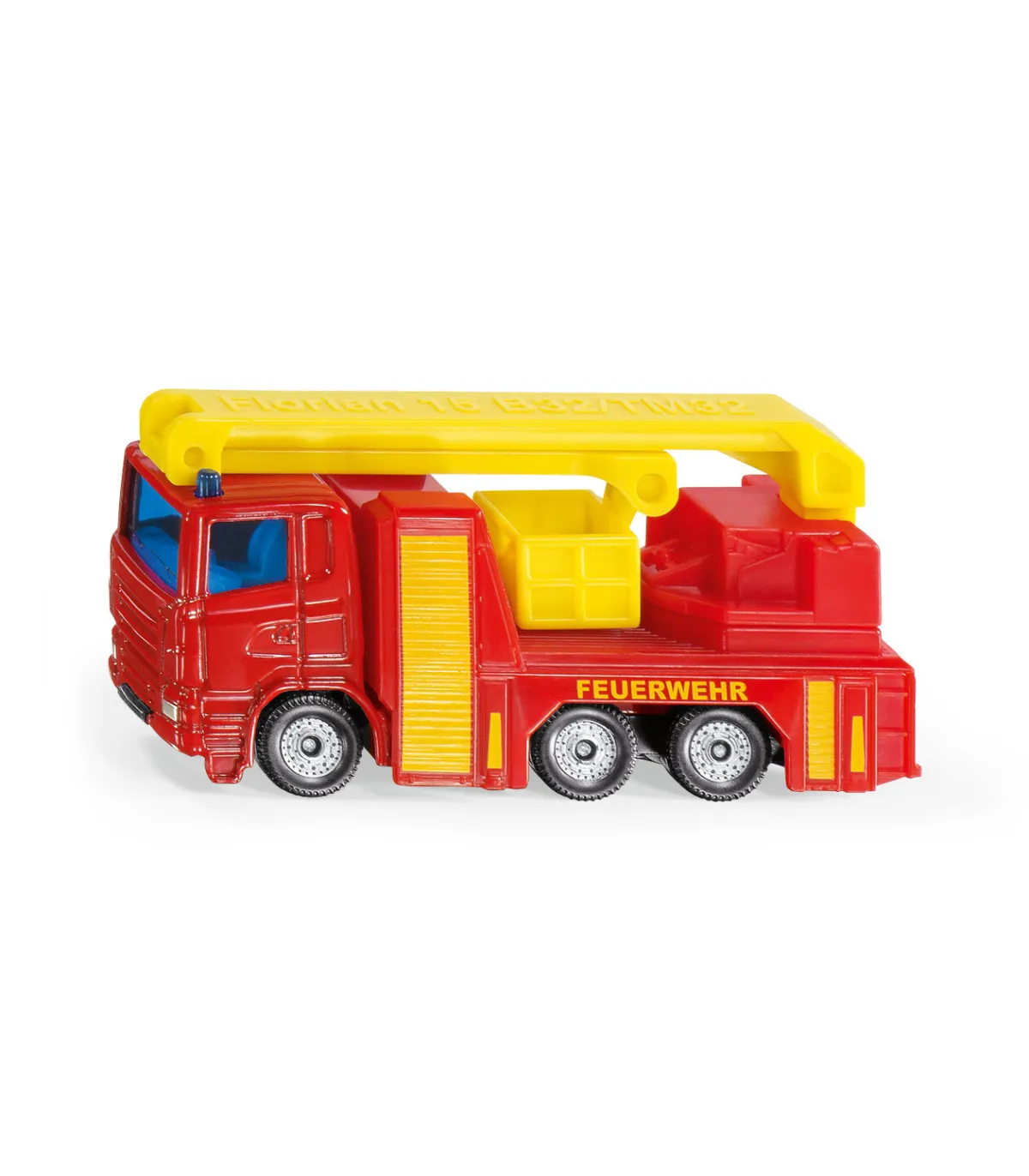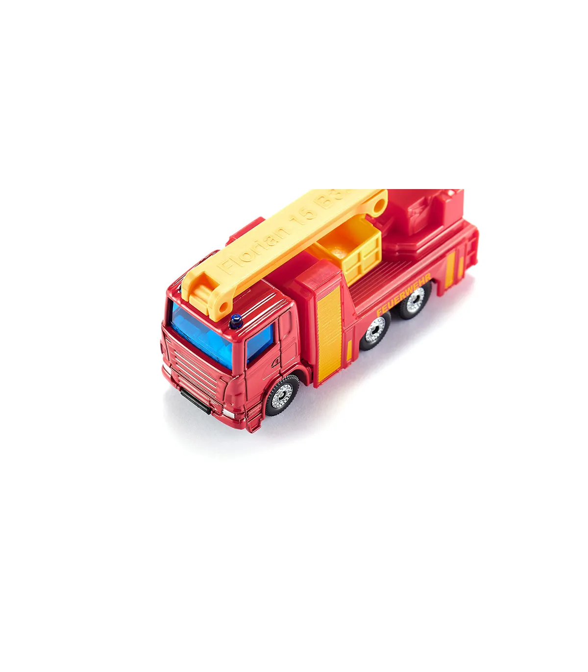 Rescate desde altura Incendio en el cuarto piso, no es posible realizar rescate a través de la escalera, entonces la plataforma aérea de rescate de los bomberos se encuentra en el lugar. Al igual que en el modelo más grande, el mástil se puede girar, la cesta de transporte se puede girar y la plataforma aérea de rescate se puede desplegar. La plataforma aérea de salvamento para bomberos siku se utiliza sobre un chasis de 3 ejes con cabina de conductor de metal.