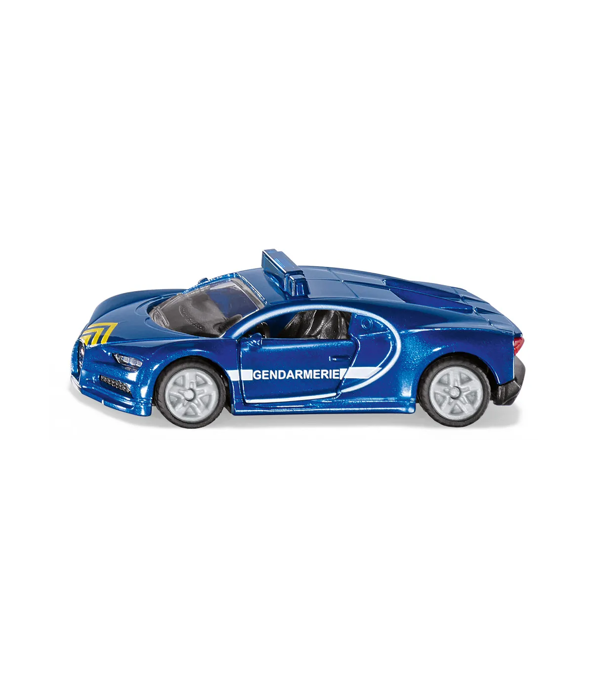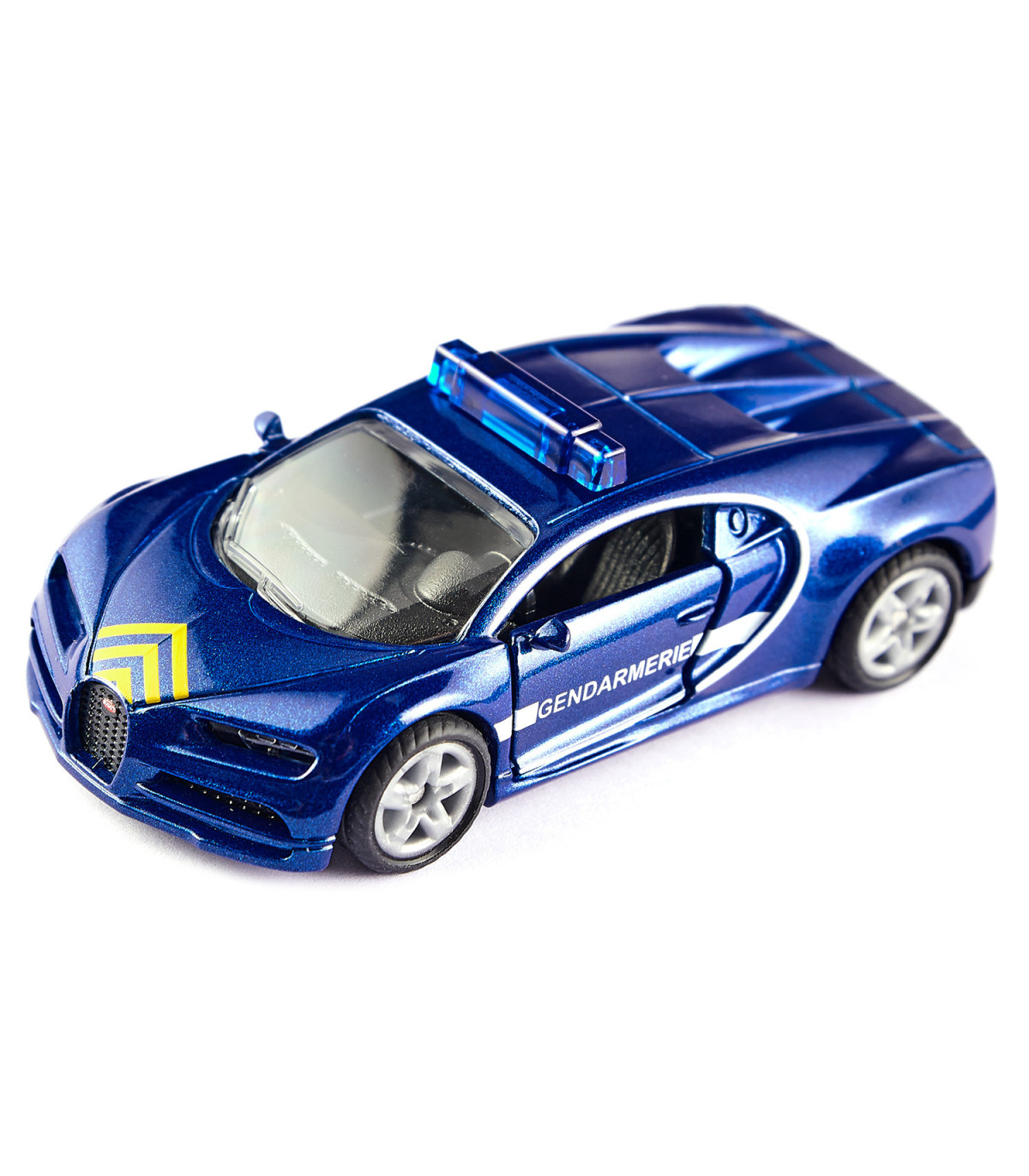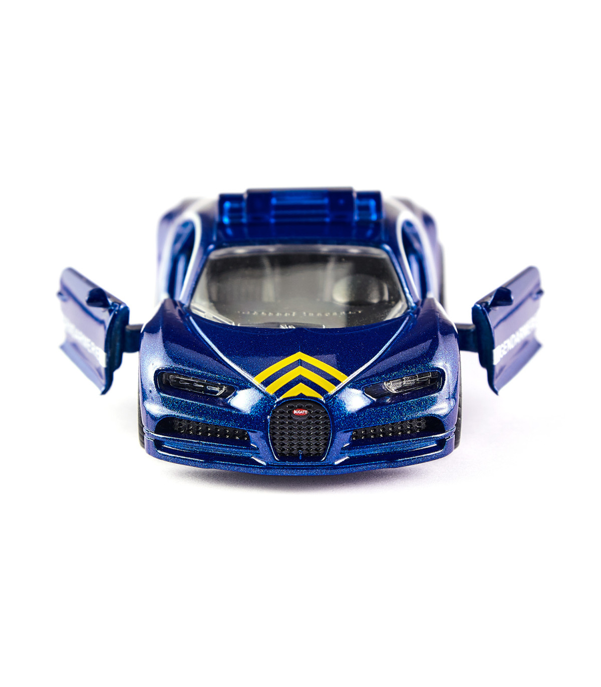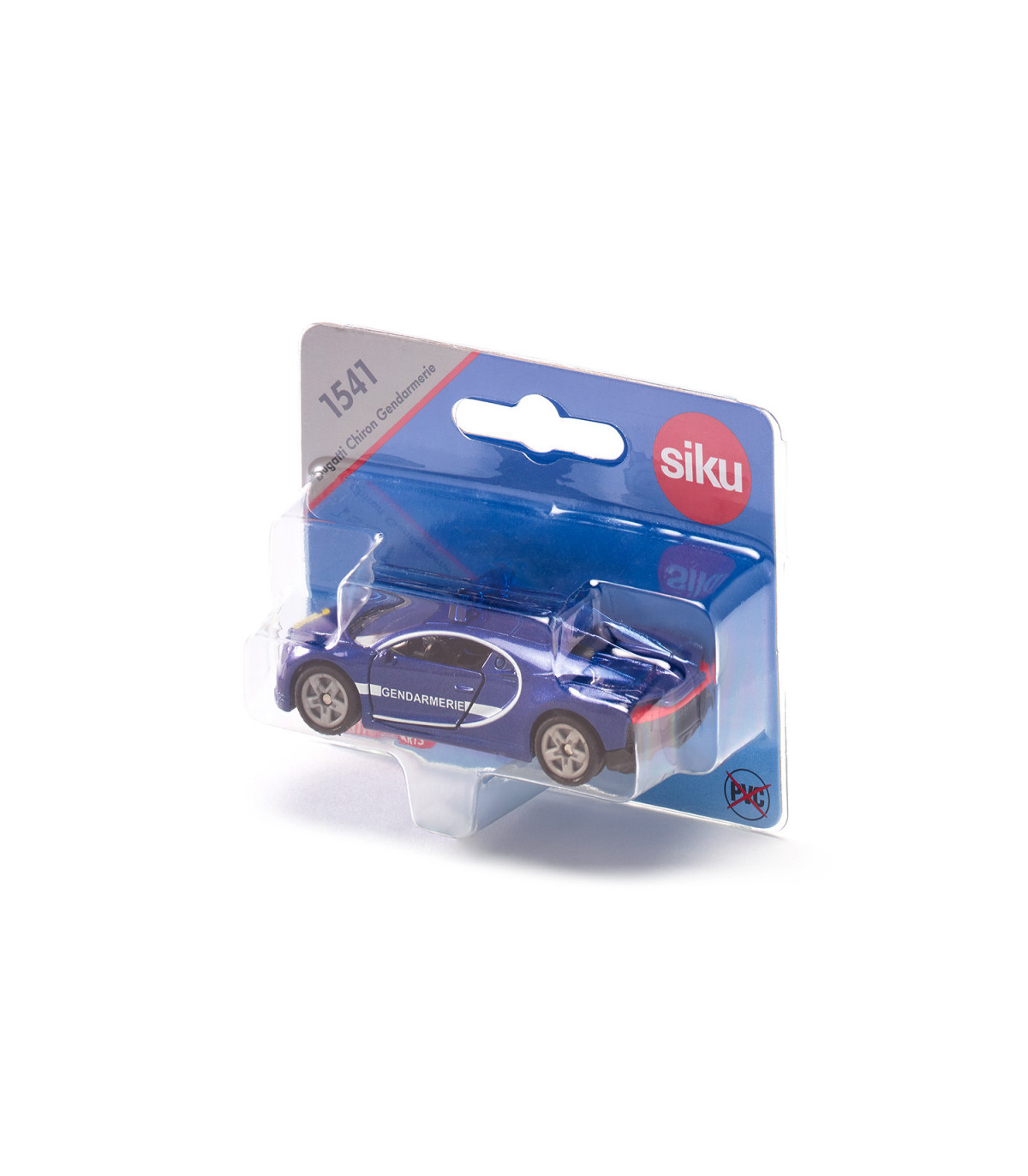 Más rápido de lo que permite la policíaUno, dos: el coche de policía más rápido del mundo alcanza los 100 km/h en 2,3 segundos y circula a 420 km/h. En Francia, el Bugatti Chiron sólo lo conducen funcionarios especialmente formados. La policía utiliza neumáticos especiales de material engomado en las llantas deportivas para perseguir a los infractores. El superdeportivo está pintado por siku con un diseño fiel al original.