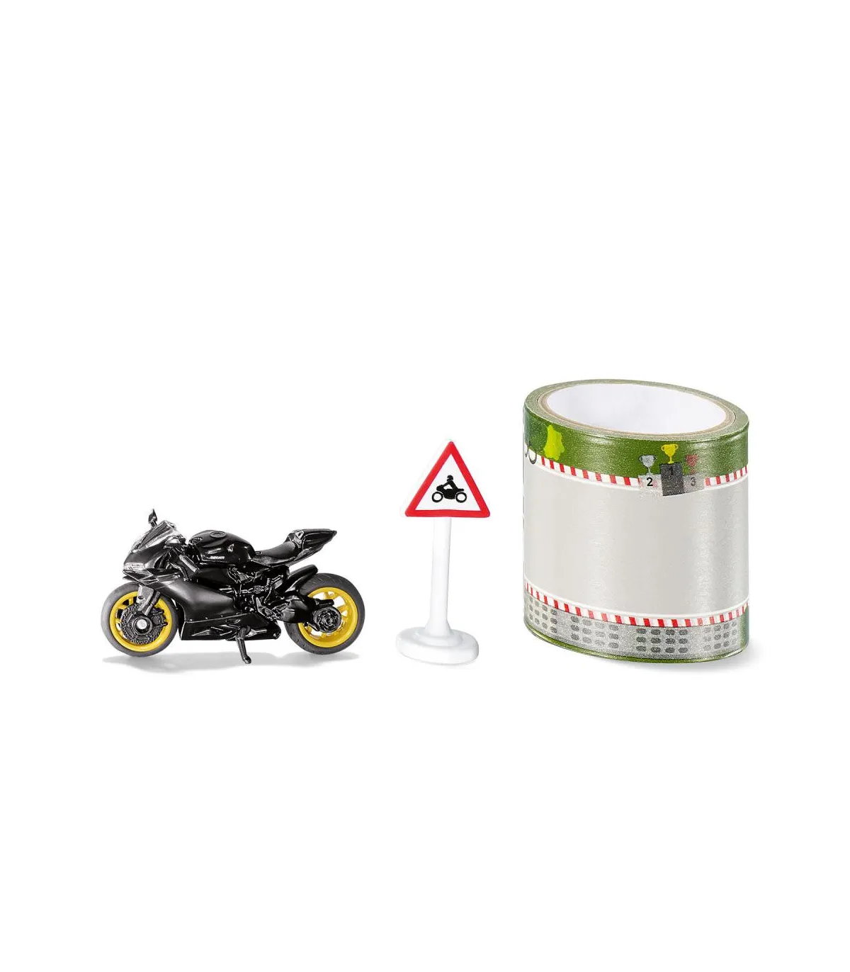 Qué aspecto: el Ducati Panigale 1299 en pintura negra mate y con bordes dorados. Casi demasiado bueno para montar la súper bicicleta. Pero, ¿quién puede resistirse cuando una pista de carreras se puede desenrollar tan fácilmente como en un siku: cinco metros de cinta con el aspecto de una pista de carreras? La cinta se adhiere a superficies lisas y alfombras de pelo corto. Póngase el casco, gire el acelerador y experimente 205 hp mientras avanzan. Es bueno que se incluya la señal de tráfico "Motocicleta de advertencia".