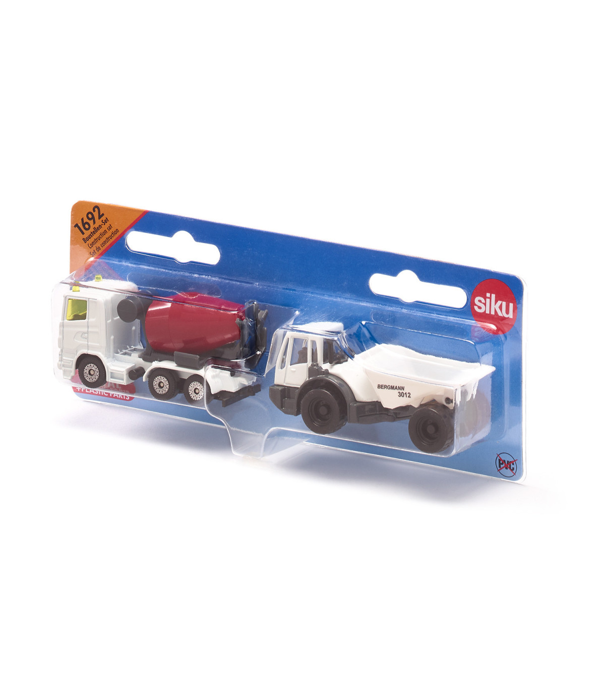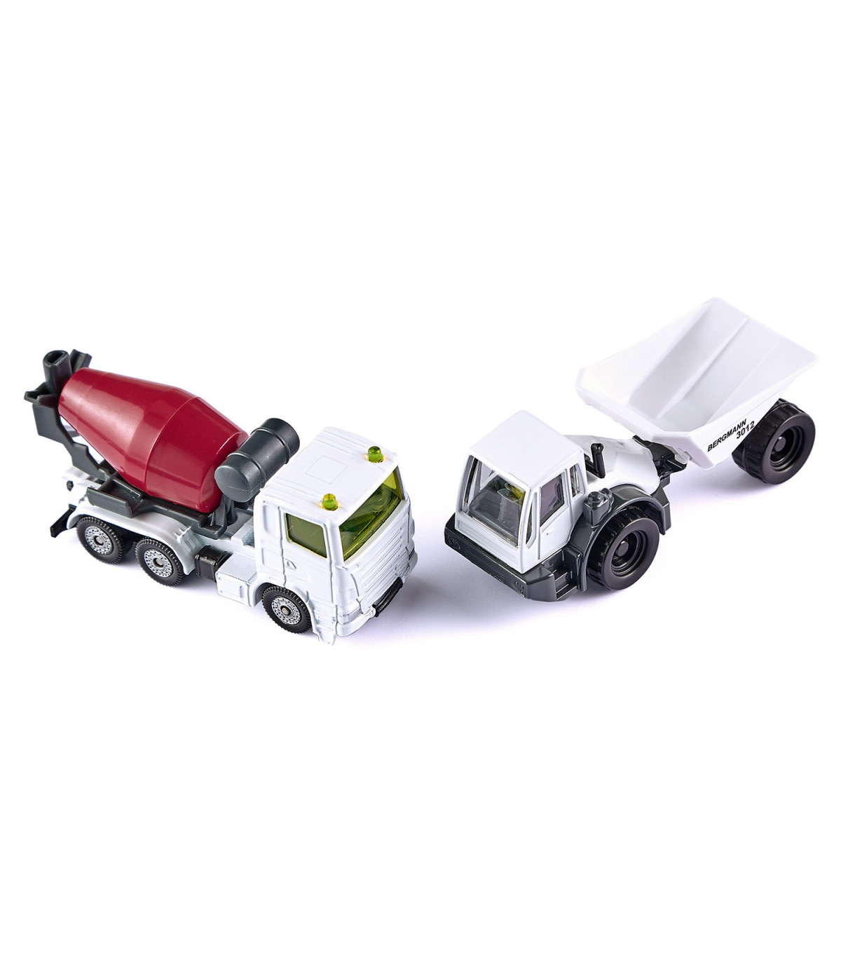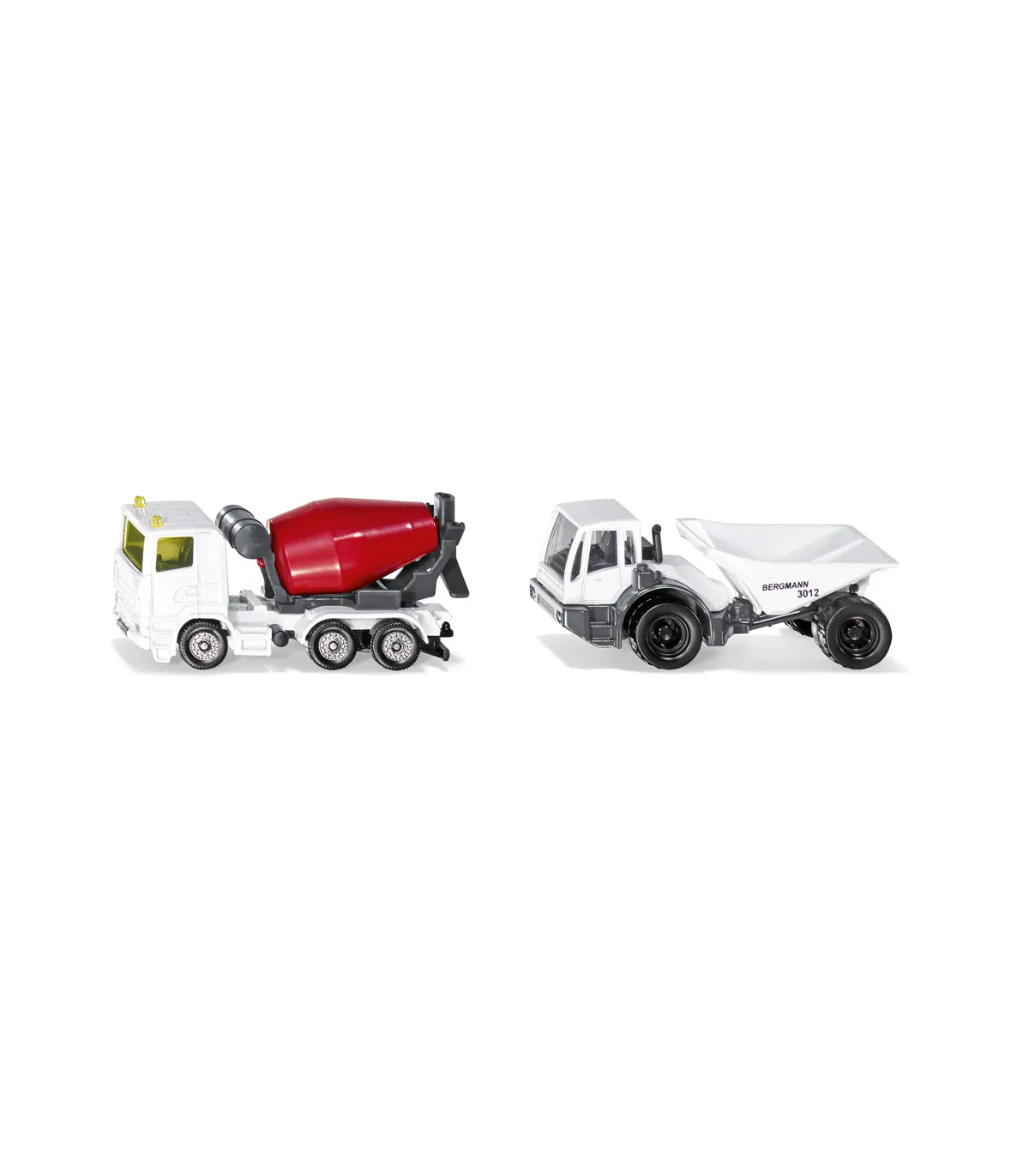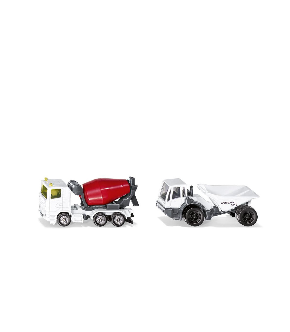 Hacia el pozo de construcción. El sitio de construcción está ocupado. El volcador siku arroja la gran cubeta de tierra. La hormigonera con el gran tambor giratorio ya se encuentra en posición de descarga. Con su cabina y chasis de metal, la hormigonera siku también es adecuada para trabajos duros en obras de construcción.