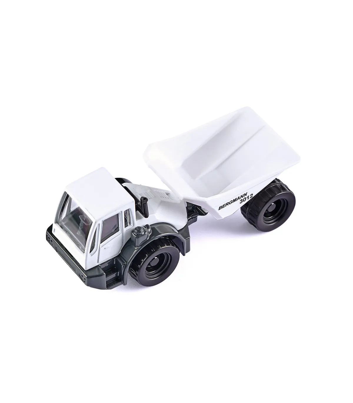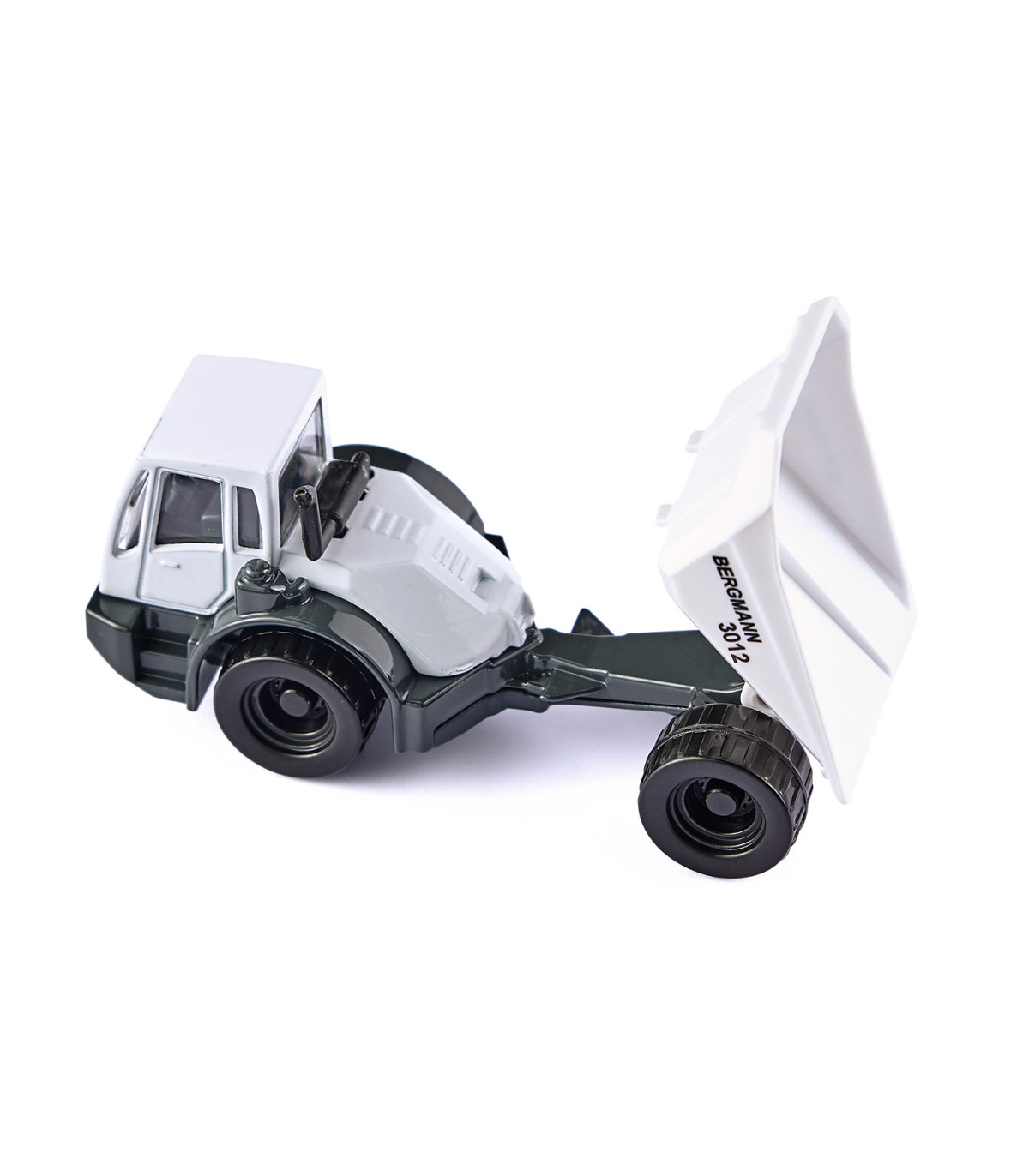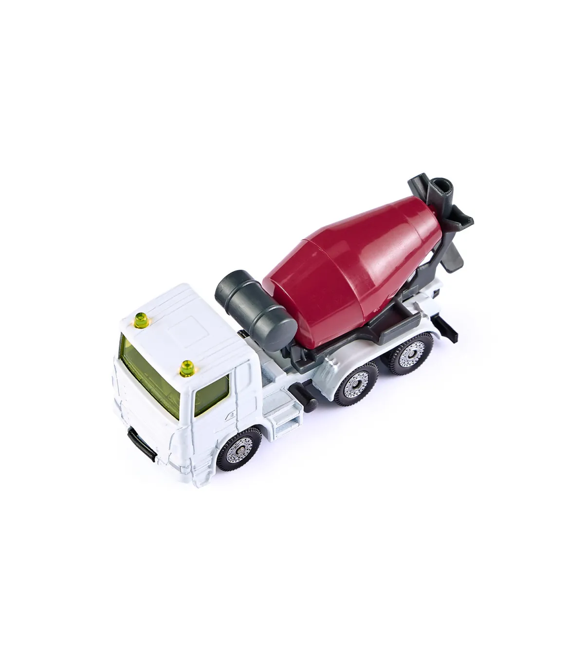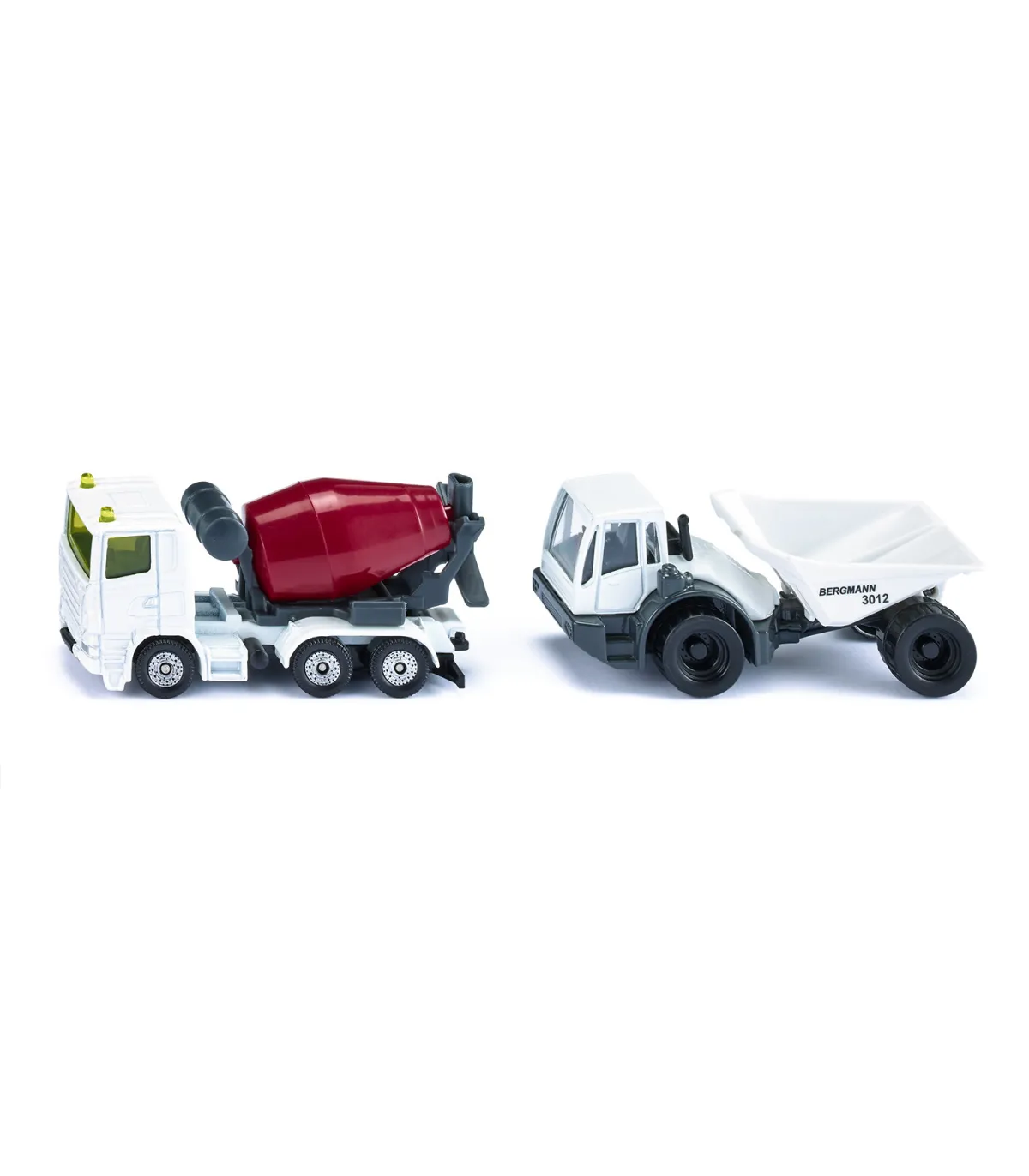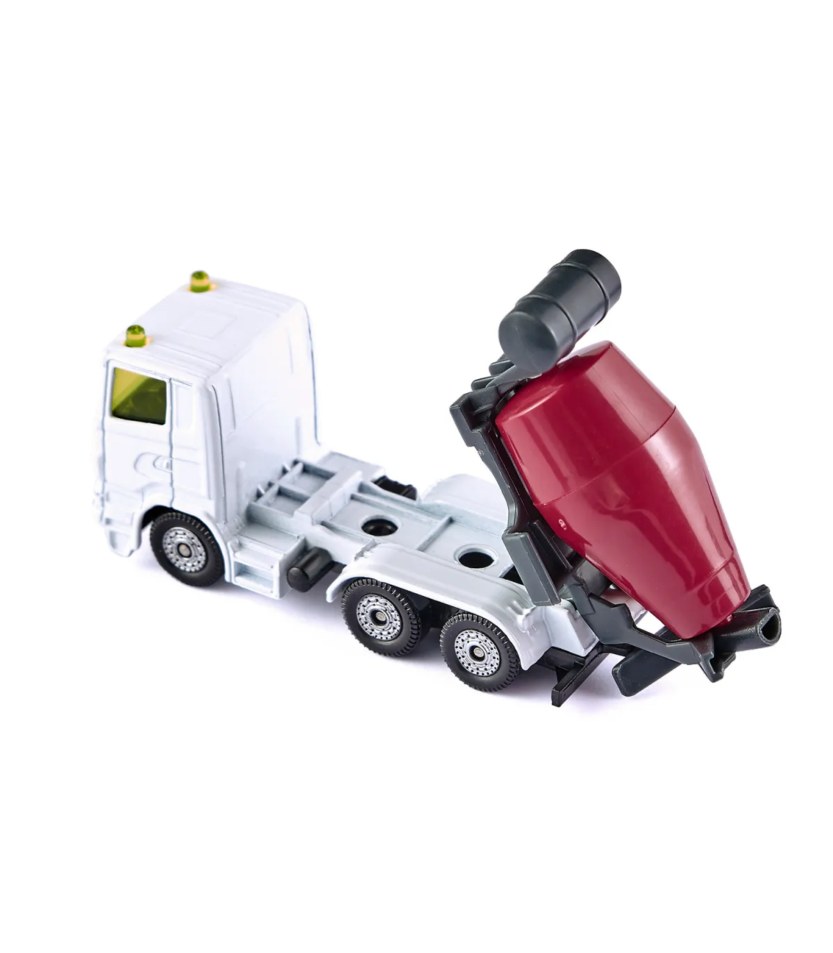 Hacia el pozo de construcción. El sitio de construcción está ocupado. El volcador siku arroja la gran cubeta de tierra. La hormigonera con el gran tambor giratorio ya se encuentra en posición de descarga. Con su cabina y chasis de metal, la hormigonera siku también es adecuada para trabajos duros en obras de construcción.