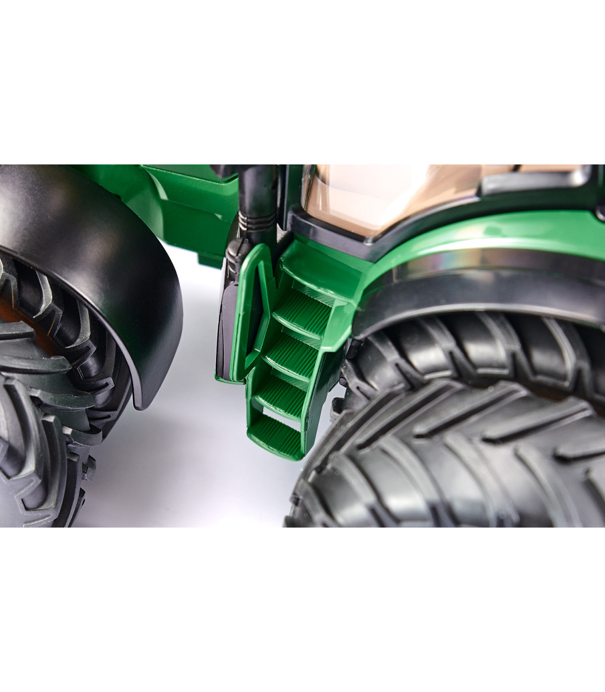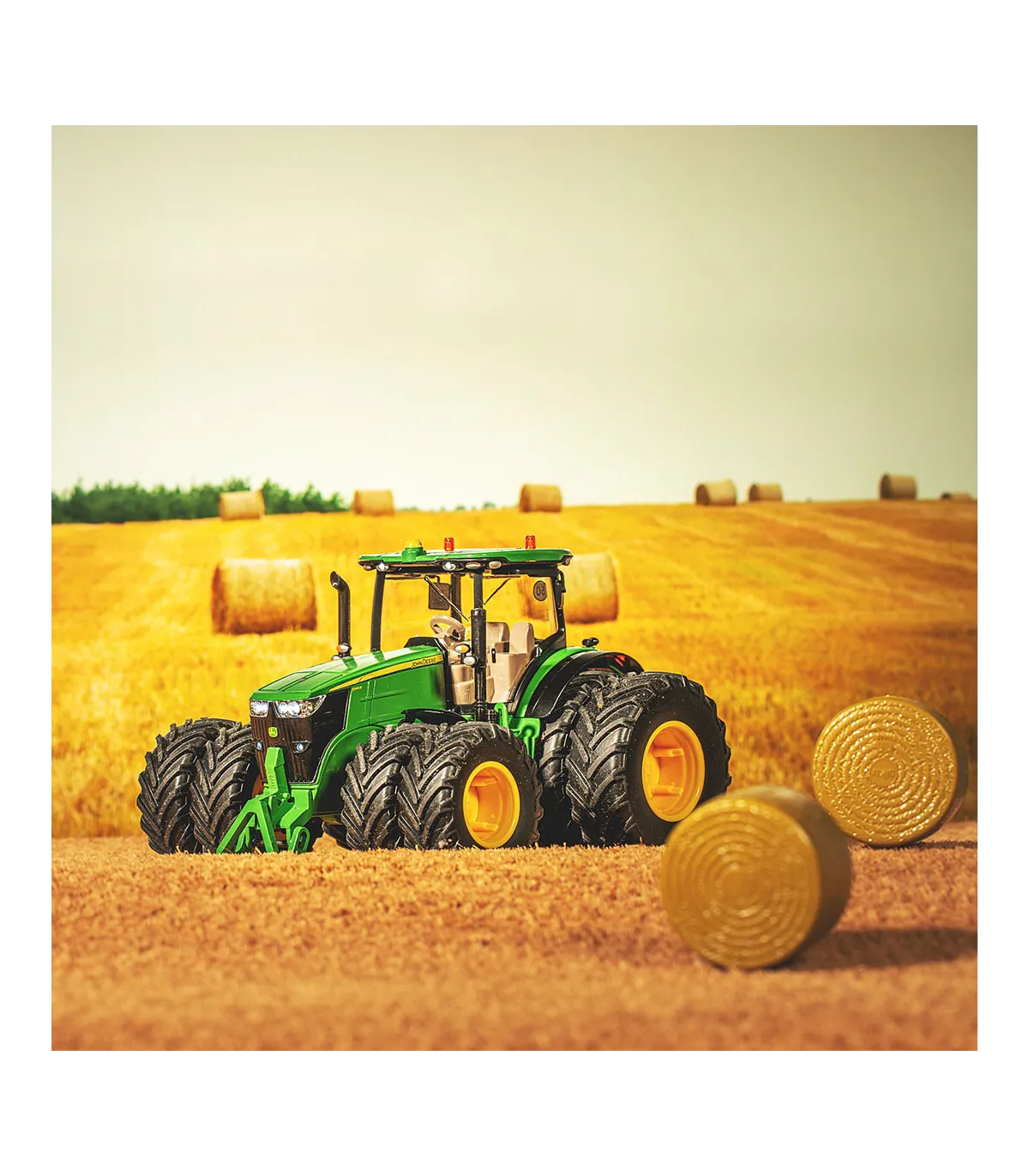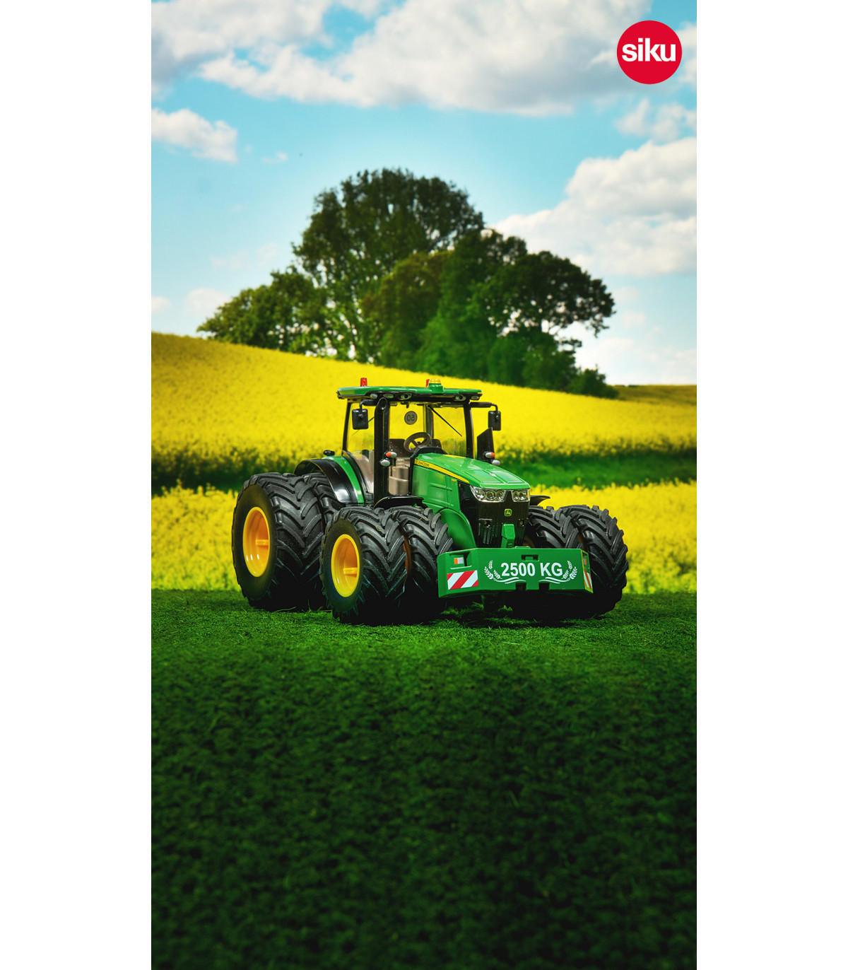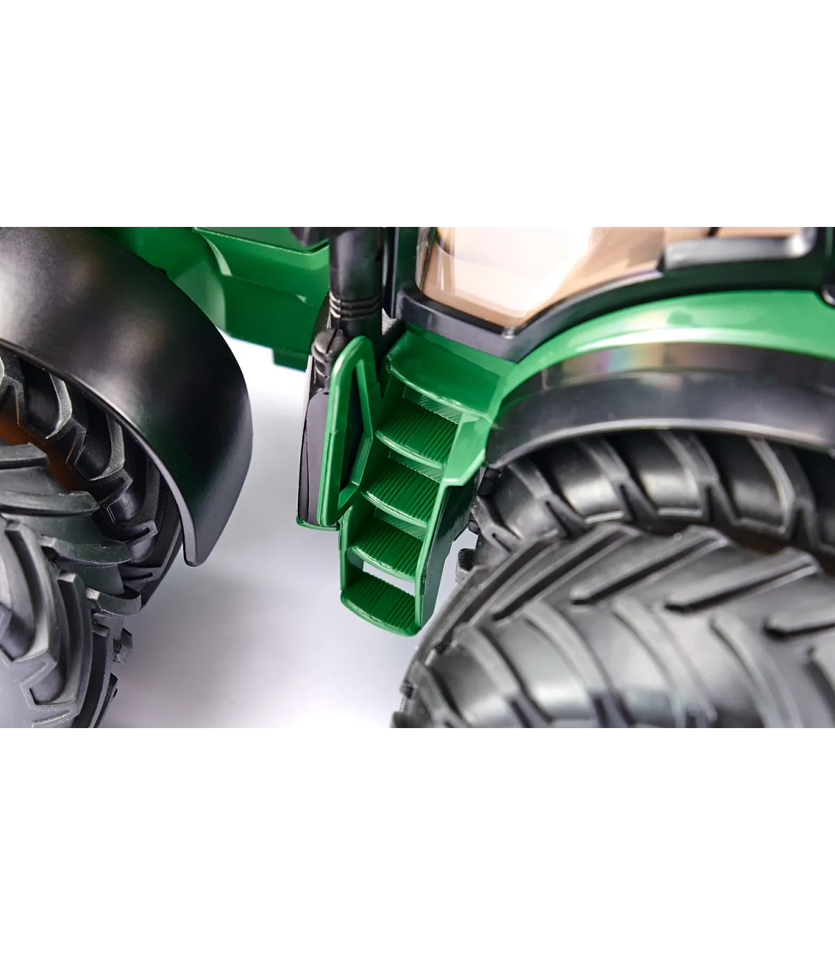 El poderoso representante de la última serie 7R de John Deere tiene una apariencia impresionante con sus neumáticos dobles. Los neumáticos gemelos reducen la presión del tractor sobre el suelo en terrenos blandos. Los neumáticos están conectados con imanes que están integrados de forma segura en las llantas y los conectan firmemente. Esta tecnología es hasta ahora única en los tractores teledirigidos. Esto significa que los neumáticos se pueden montar y desmontar muy rápidamente y sin herramientas. El John Deere 7290R se puede conducir con neumáticos convencionales, con neumáticos gemelos en los ejes delantero y trasero o con neumáticos dobles sólo en el eje trasero. El tractor SIKUCONTROL de metal y plástico se caracteriza no sólo por sus numerosas funciones, sino también por el cuidado por el detalle que tanto aprecian los aficionados. Todas las funciones y las tres transmisiones del tractor se controlan a través de la aplicación. Ya sea a través del control del joystick virtual o de los sensores de movimiento e inclinación de los dispositivos móviles. Esta característica intuitiva es un cambio bienvenido.