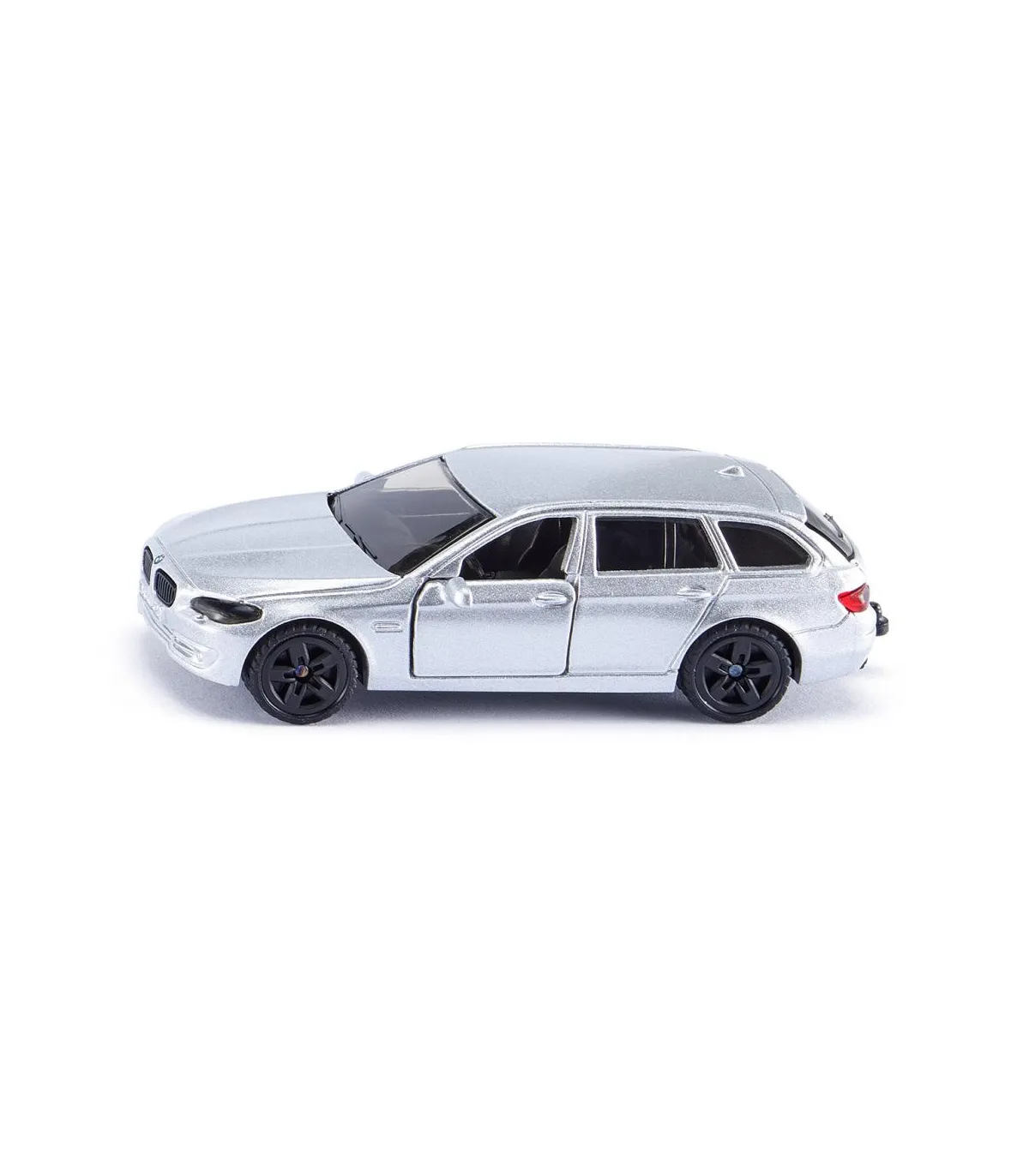 El BMW 520i Touring impresiona por su aspecto dinámico y su amplia gama de posibles usos debido al acoplamiento del remolque instalado de serie. Las puertas del BMW se pueden abrir, las llantas en negro deportivo y forman un excelente contraste con el cuerpo de metal plateado.