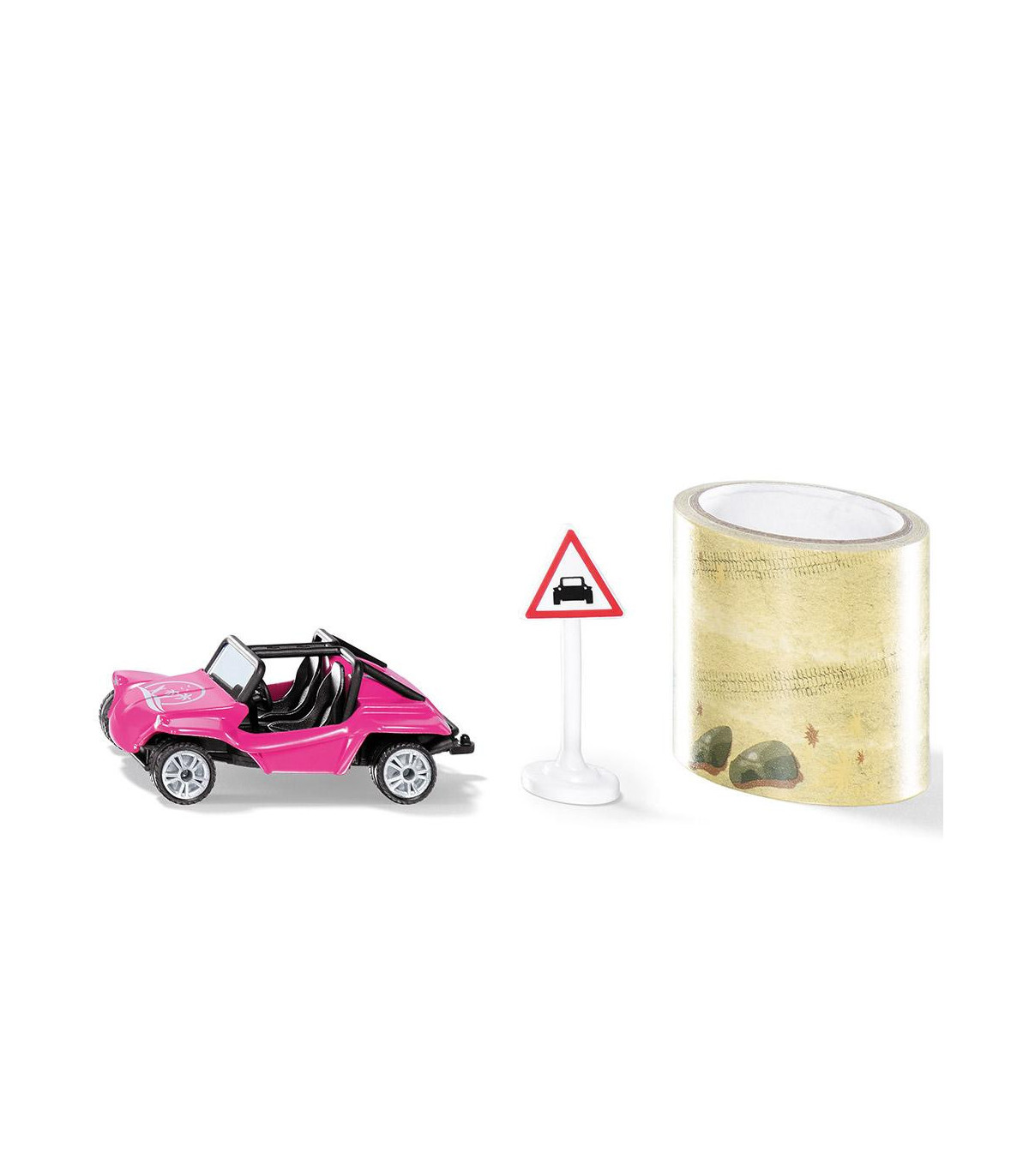 verano, sol y buggy. En las décadas de 1960 y 1970, ese era el automóvil de estilo de vida más popular en la costa oeste de Estados Unidos. Se crearon muchos kits de automóviles basados en el VW Beetle. Un cuerpo de plástico ligero, la ausencia de techo, puertas y ventanas hicieron que los autos de baja potencia fueran vehículos realmente divertidos. Con neumáticos de goma en llantas deportivas y barras antivuelco, el viaje en el tiempo en el buggy rosa puede comenzar: ¡Sí! Es genial cuando una duna de arena se puede extender como siku. La cinta con una longitud de cinco metros se adhiere a superficies lisas y alfombras de pelo corto.