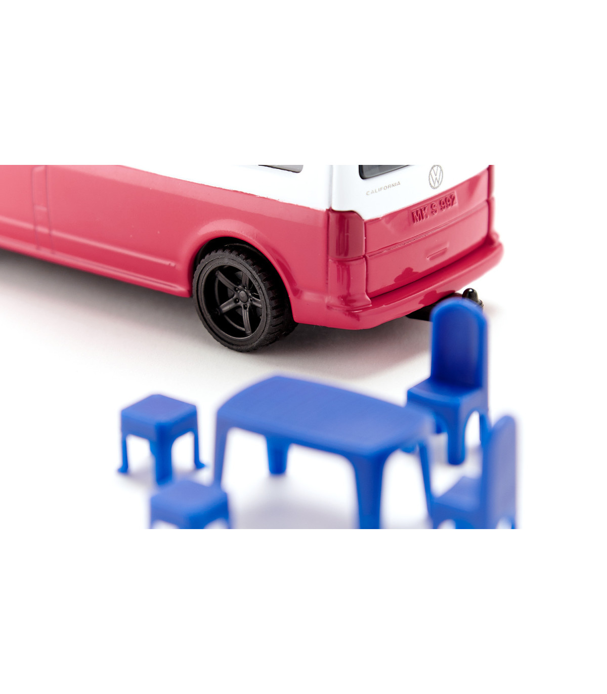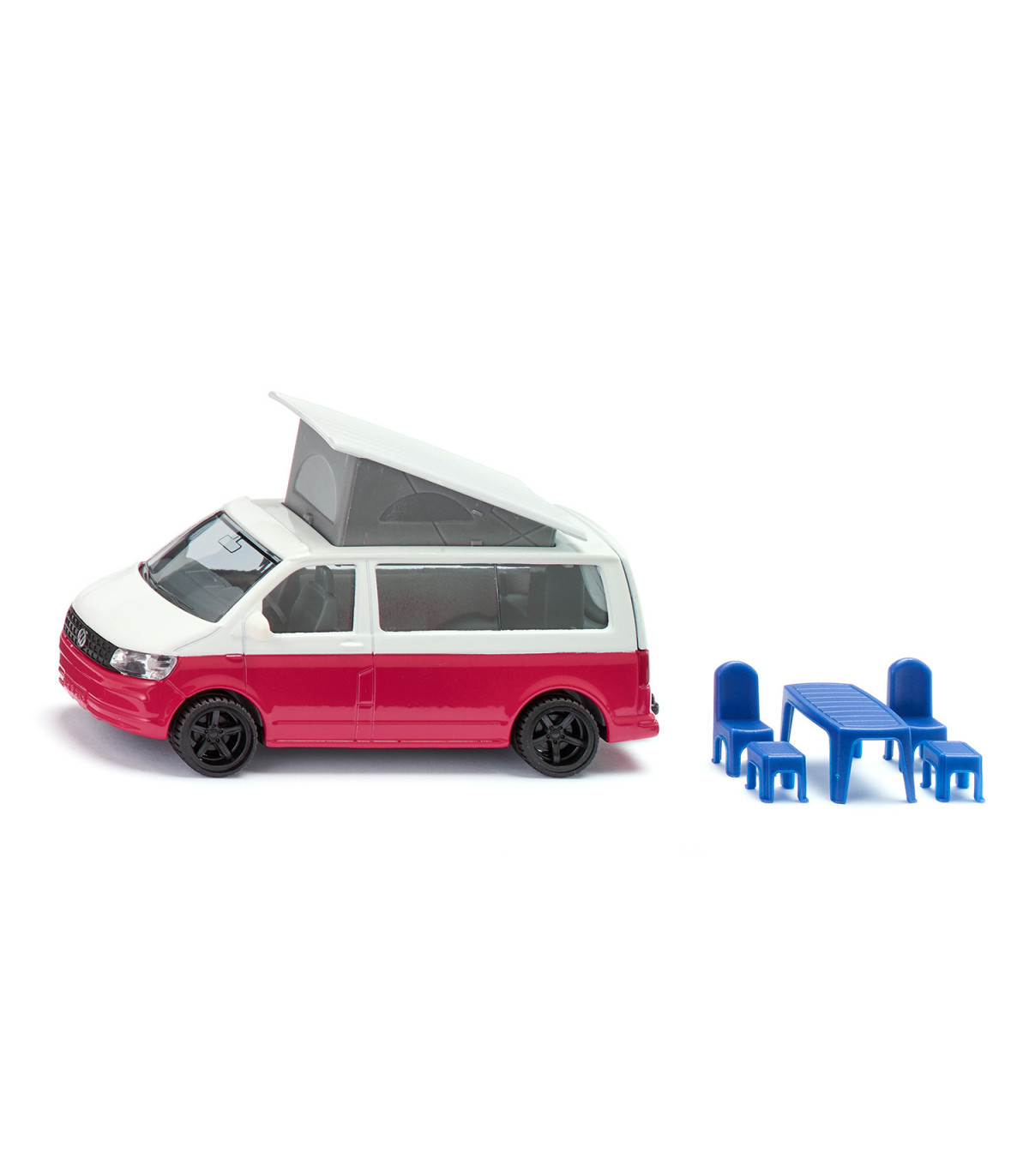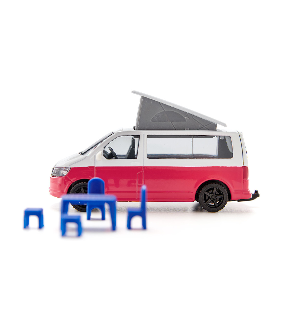 Libertad sobre cuatro ruedas: Duerme bajo las estrellas y despiértate con el sonido del mar, todo desde la comodidad de tu propio coche. Esto es lo que representa el VW California desde hace 30 años. La furgoneta de camping es cómoda para largas distancias, lo suficientemente compacta para excursiones por la ciudad y la montaña y lo suficientemente independiente para acampar en cualquier lugar. Levante el techo, abra el portón trasero, coloque la mesa, las sillas y los taburetes y disfrute de la libertad. Siku entrega esta autocaravana de culto con una moderna pintura bicolor y con enganche para remolque y con ruedas también desmontables.