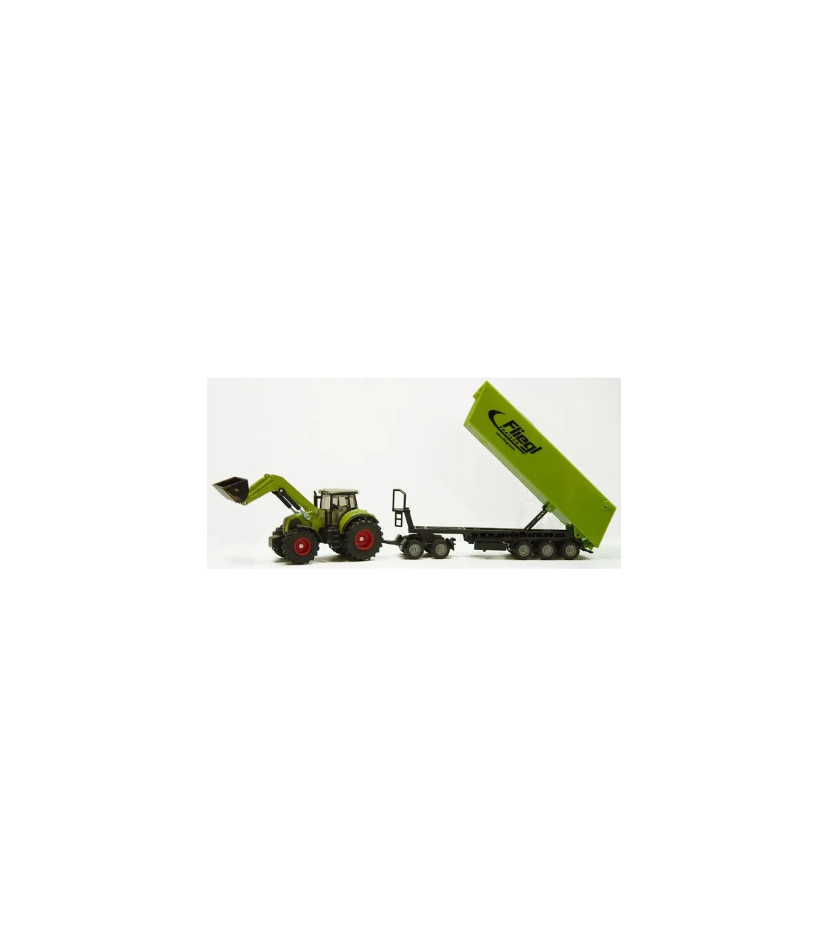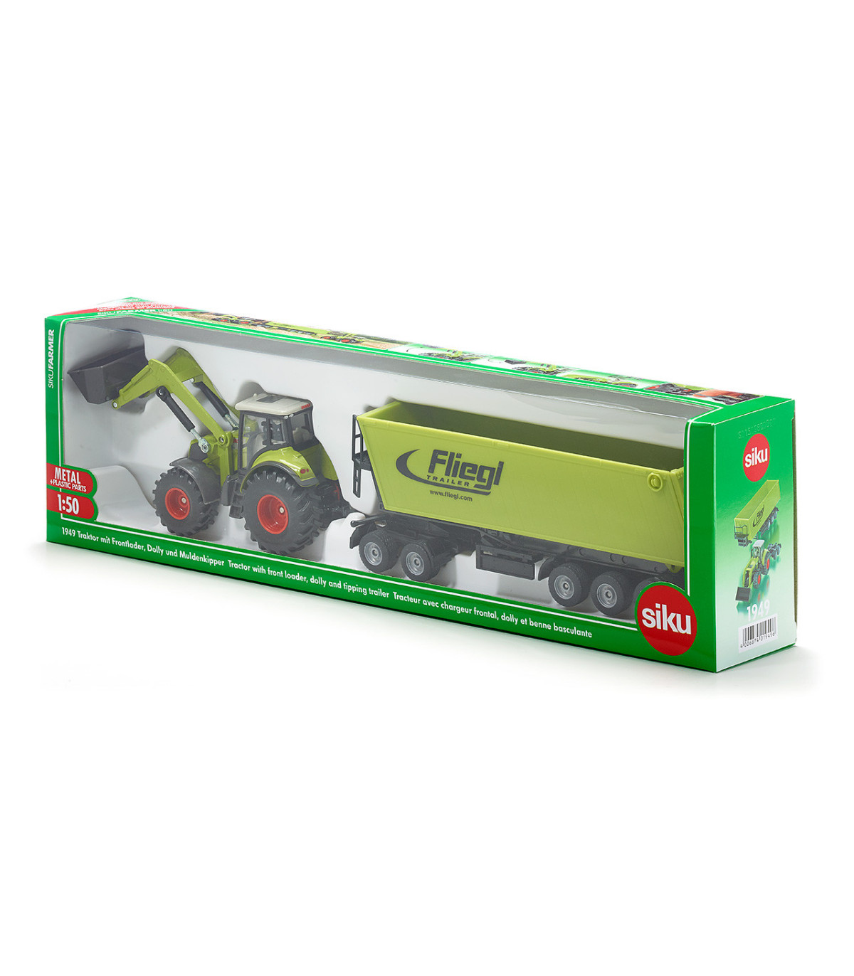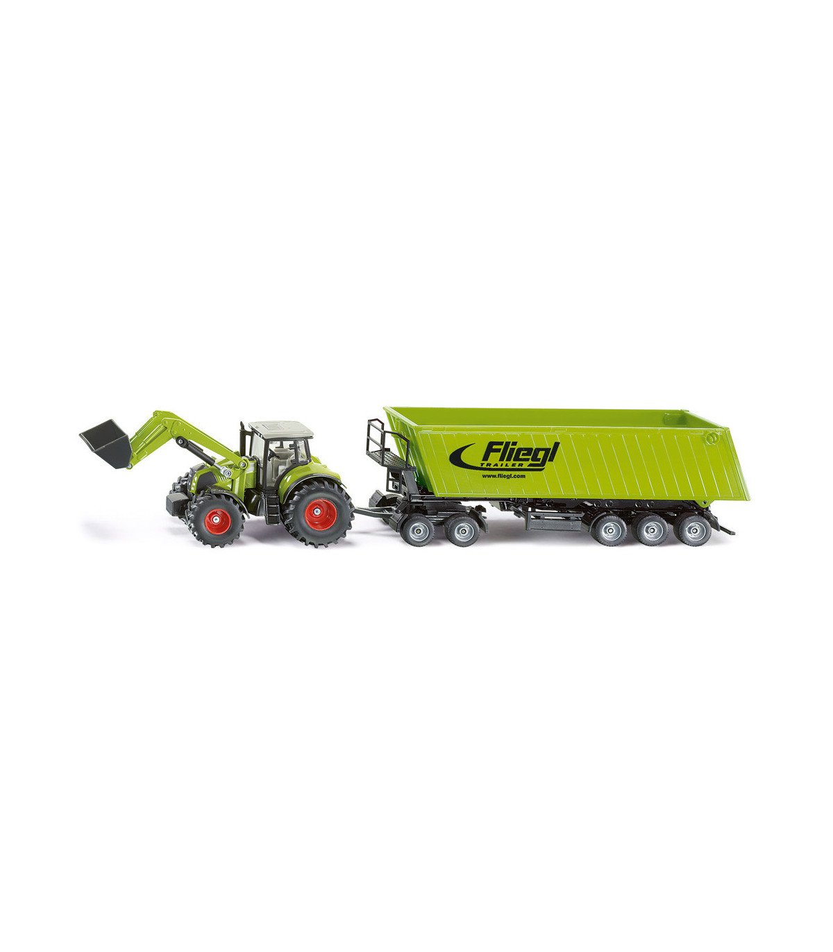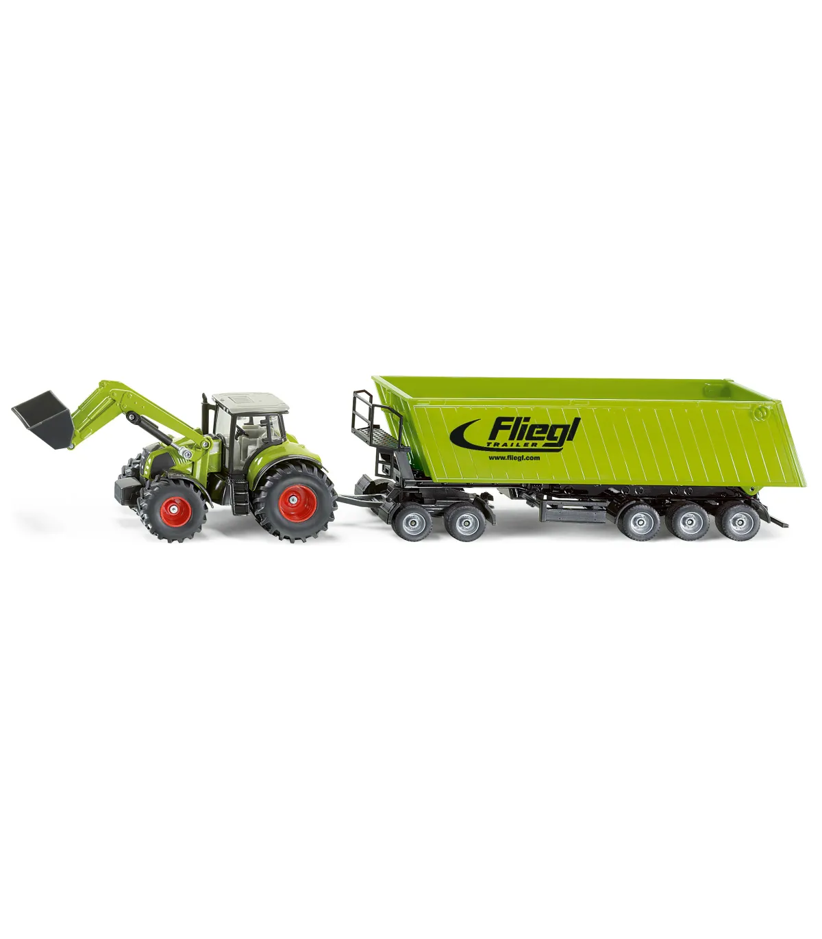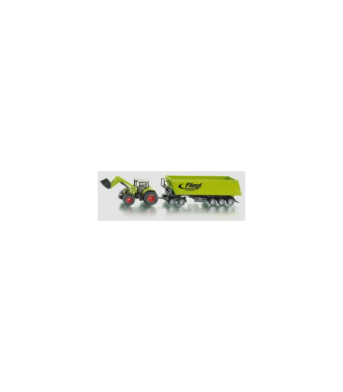 Divertido set en color verde semilla como complemento de la exitosa serie agrícola SIKU en escala 1:50. El Claas Axion 850 con pala móvil y basculante de carga frontal arrastra un carro de eje tándem con un camión volquete Fliegl de 3 ejes acoplado. Esta combinación independiente de piezas de metal y plástico de alta calidad se puede utilizar tanto para la carga como para el transporte. El camión volquete con plataforma rodante se puede combinar con cualquier tractor SIKU a escala 1:50 y se puede utilizar en la cadena de recolección para descargar una cosechadora. El comedero es inclinable. El portón trasero se puede abrir. Pata de apoyo plegable para aparcar el camión volquete. El Dolly también se puede utilizar con los modelos de la serie SIKU Super en escala 1:50.