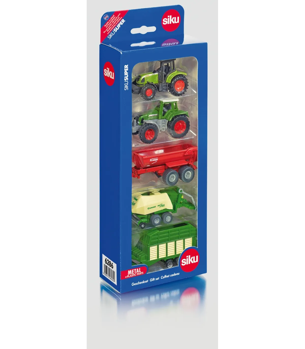 Set de regalo con 2 modelos de tractores y remolques 3. El conjunto consta de un tractor Fendt y Claas y se complementa con un camión de volteo, una empacadora y un Heuladewagen. En una caja de regalo.
