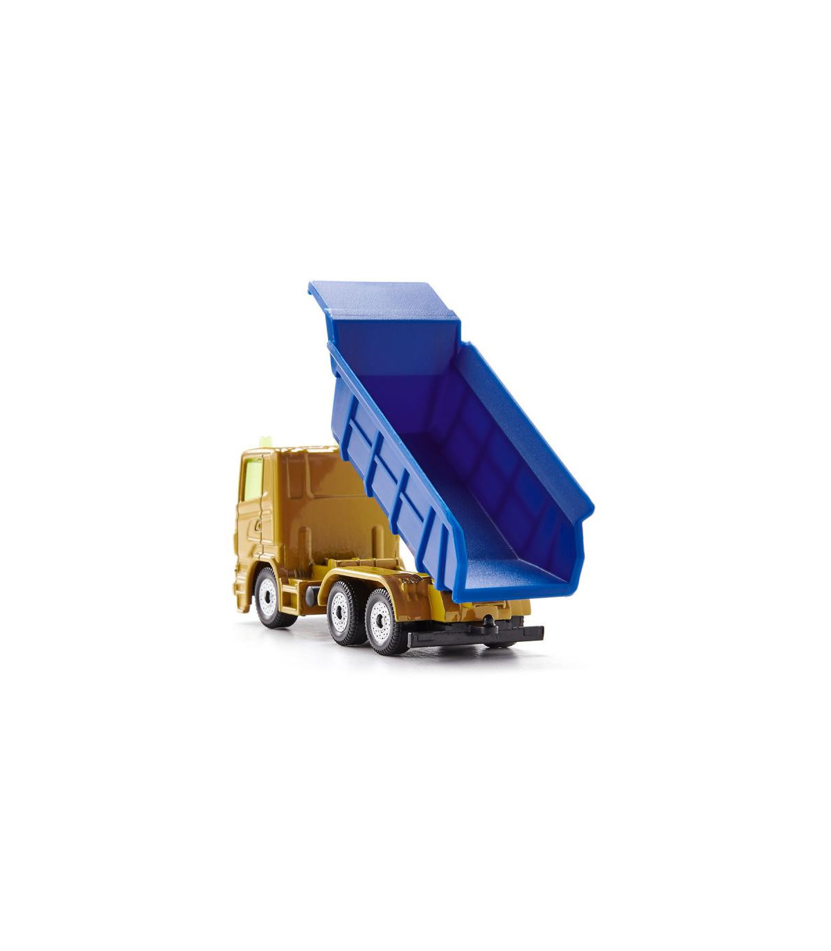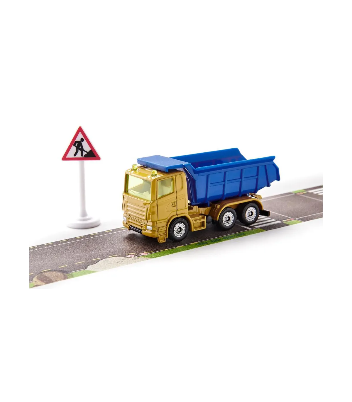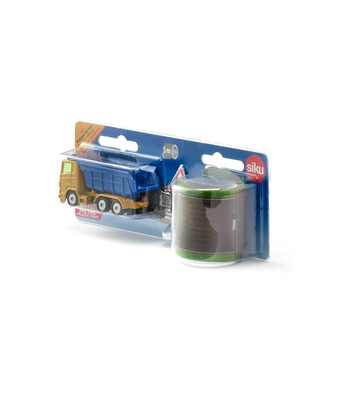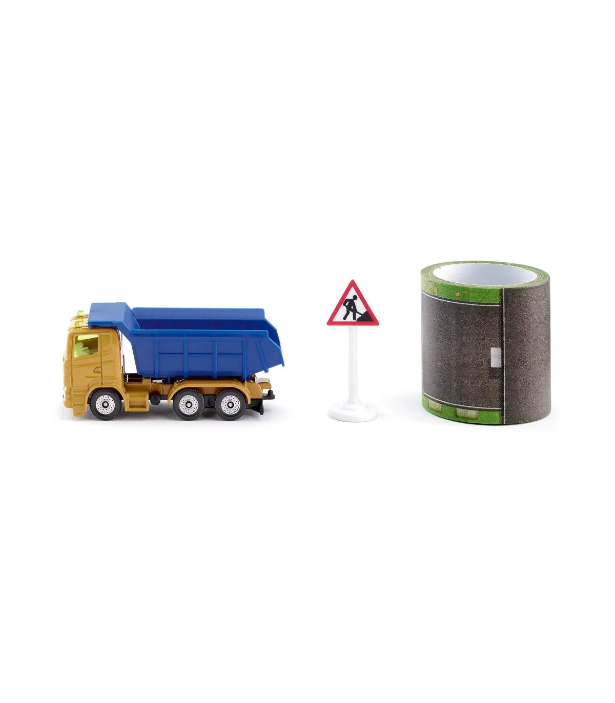 El camión pesado sube y vuelca el canal con grava. El volquete siku con su cabina y chasis de metal también es adecuado para aplicaciones difíciles en sitios de construcción. El volquete de obra con enganche para remolque, la señal de tráfico y la cinta en la obra y el aspecto de la calle transforman la habitación de los niños en una obra de construcción. La cinta con una longitud de cinco metros se adhiere a superficies lisas y alfombras de pelo corto.