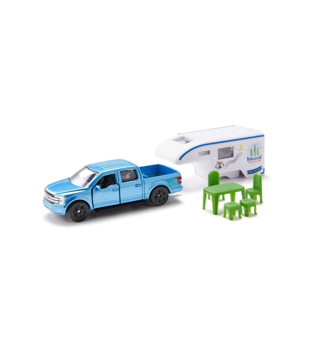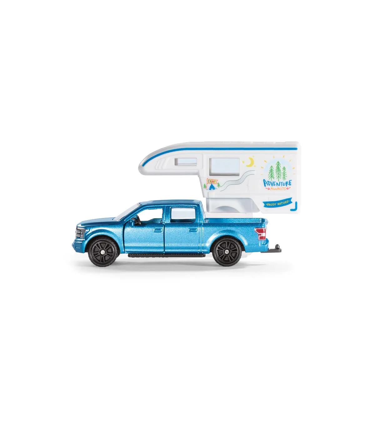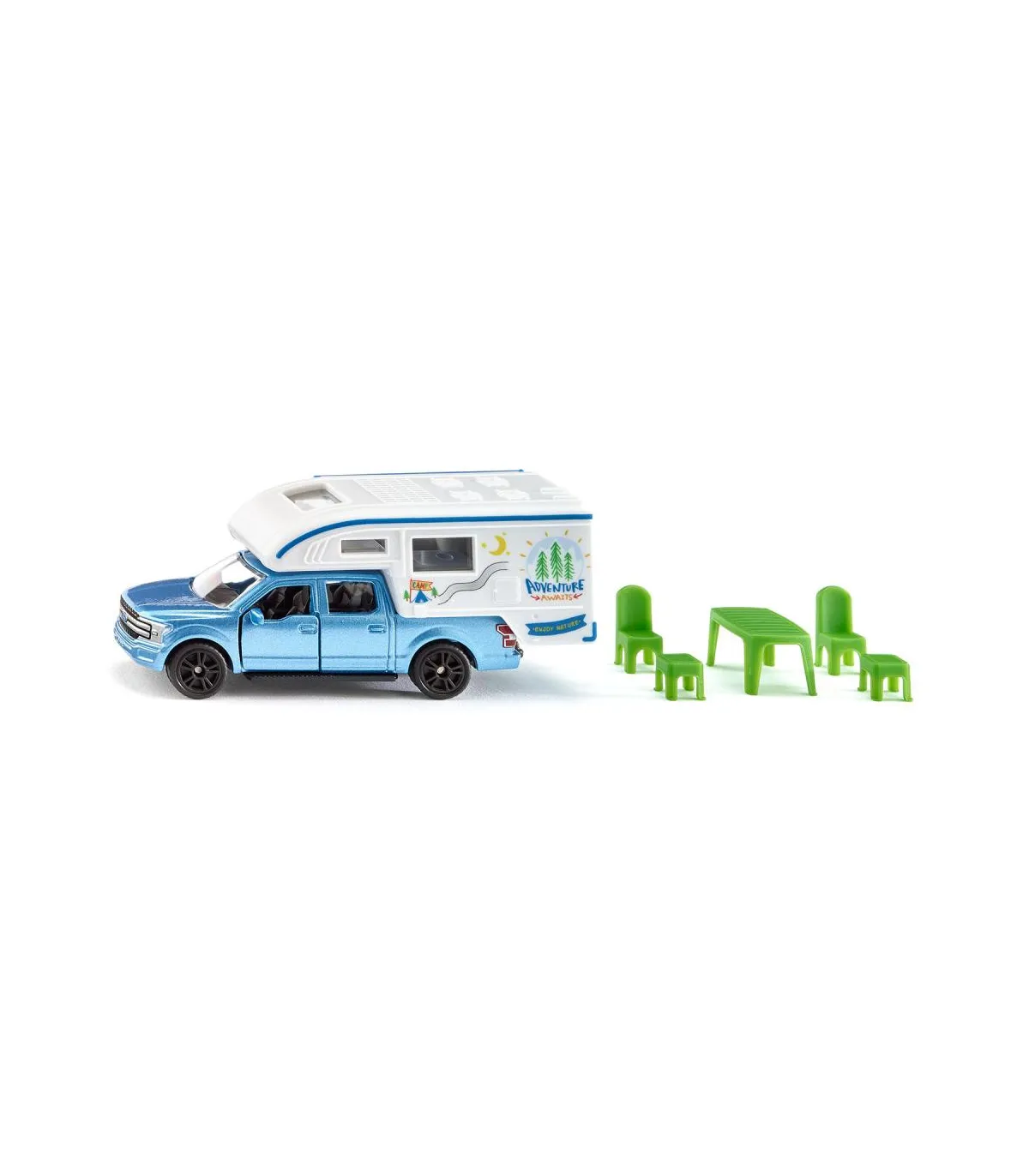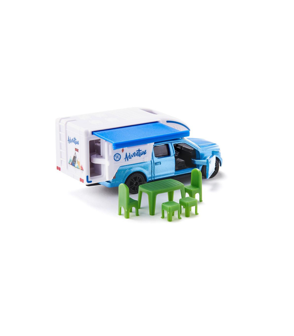 Ve de acampada con el todoterreno: el Ford F150 es el coche más vendido en EE. UU. Este pick-up es un objeto de culto en Estados Unidos, sobre todo con su gran motor V8. El Ford F150 es un coche familiar, mula de carga, tractor y también una caravana. La cabina habitable se puede cargar fácilmente para un viaje de fin de semana todoterreno. Se puede abrir la puerta de la cabina, sacar el toldo y todo está preparado para una barbacoa al aire libre con dos sillas, dos taburetes y una mesa.