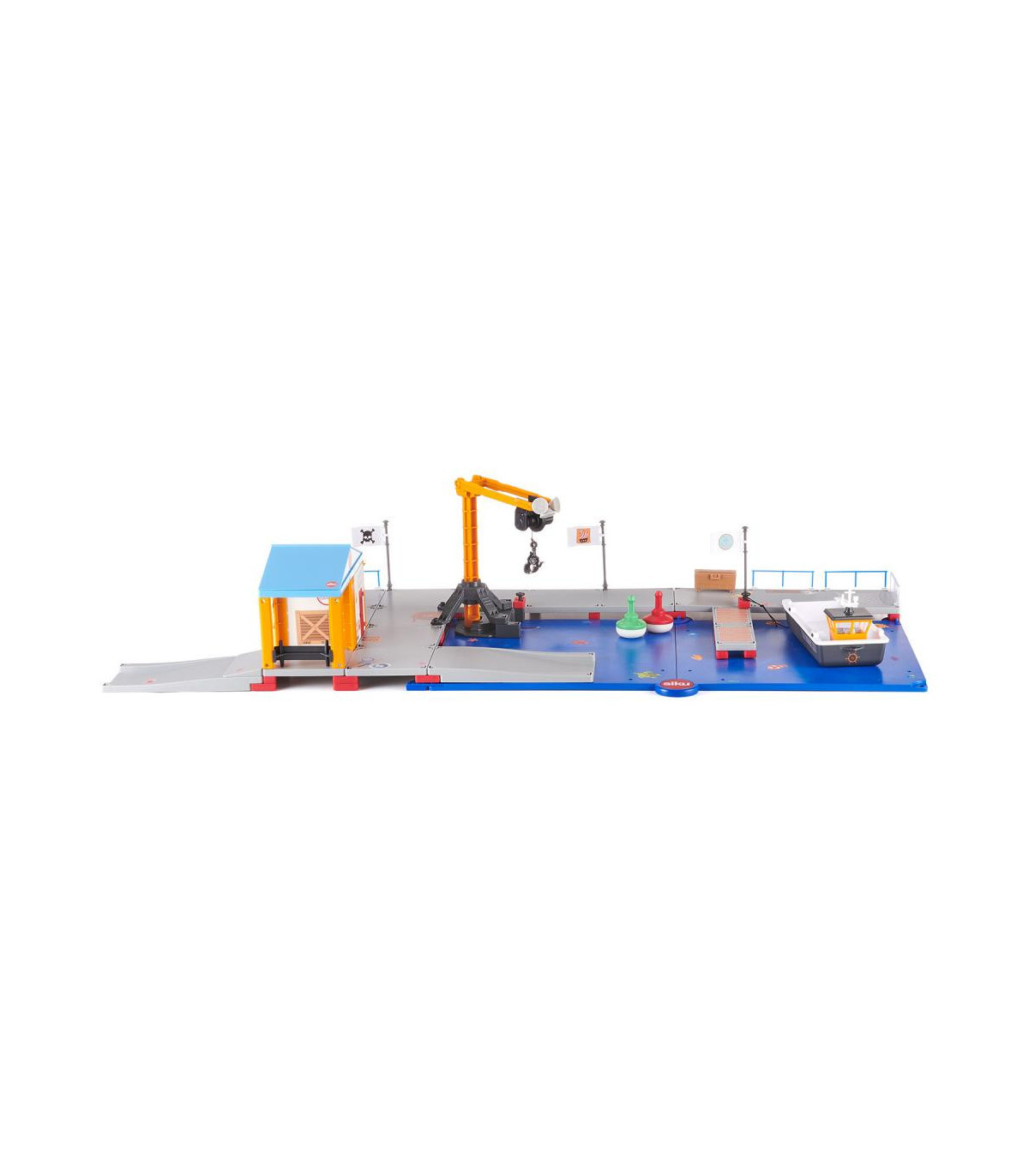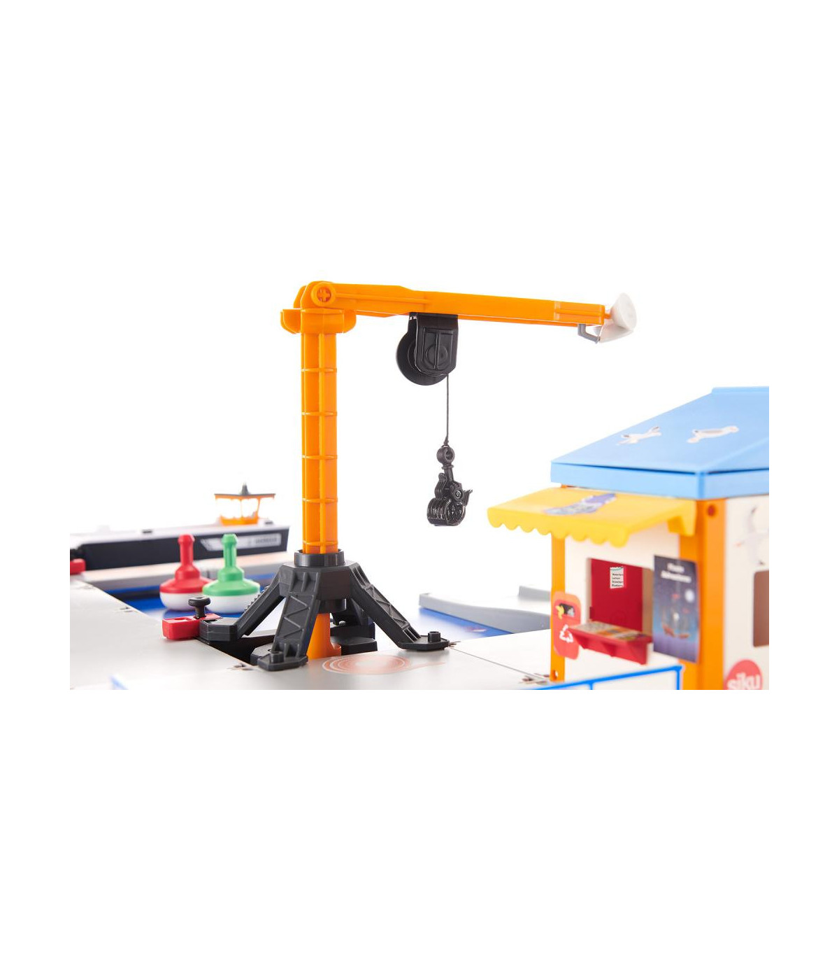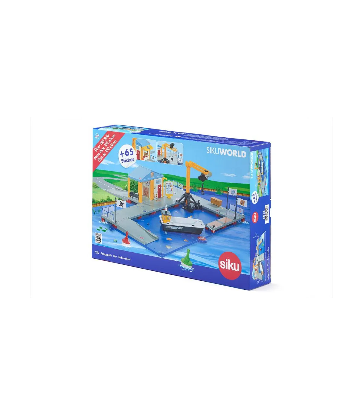 Estación de abastecimiento para barcos: siempre hay algo que hacer en el nuevo muelle de SIKUWORLD. El muelle se puede construir de diversas formas utilizando piezas individuales y diseñarlo individualmente con pegatinas. Los barcos se pueden botar y sacar mediante la rampa. El rugido sordo de la bocina del barco anuncia el final de la pausa para el almuerzo de los trabajadores portuarios. El sándwich de pescado se come rápidamente en el snack bar y allí atraca el barco de trabajo. Se puede fijar de forma segura a los bolardos del muro del muelle con tan solo unos sencillos pasos. Entonces la grúa pórtico con el carro comienza a moverse. Hay que descargar la carga del barco de trabajo, como dicen los trabajadores del puerto, porque el capitán quiere volver a partir rápidamente. El embarcadero SIKUWORLD consta del barco de trabajo, boyas, dos banderas, snack bar y un embarcadero con entradas y salidas, dos paneles de plástico con diseño azul, grúa y cajones. Las cajas se pueden abrir, llenar y vaciar. El muelle SIKUWORLD se puede utilizar solo y es el complemento ideal para el mundo acuático SIKUWORLD y el barco portacontenedores SIKUWORLD.