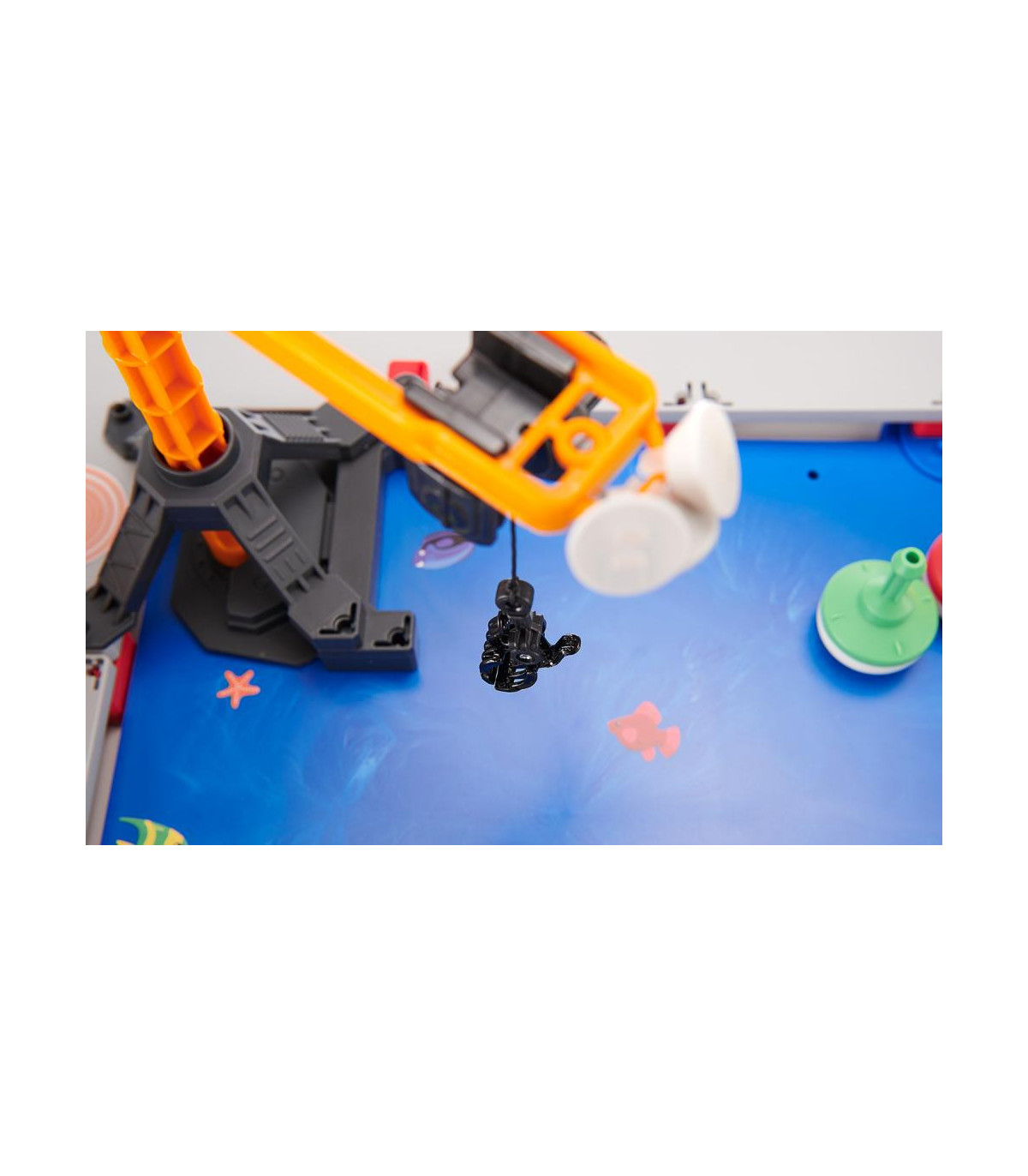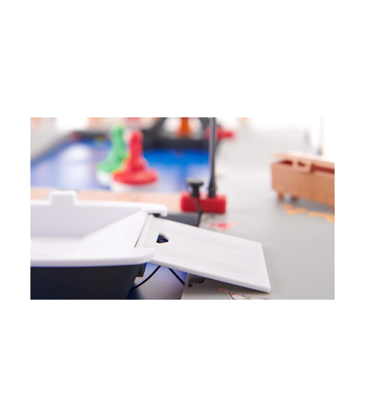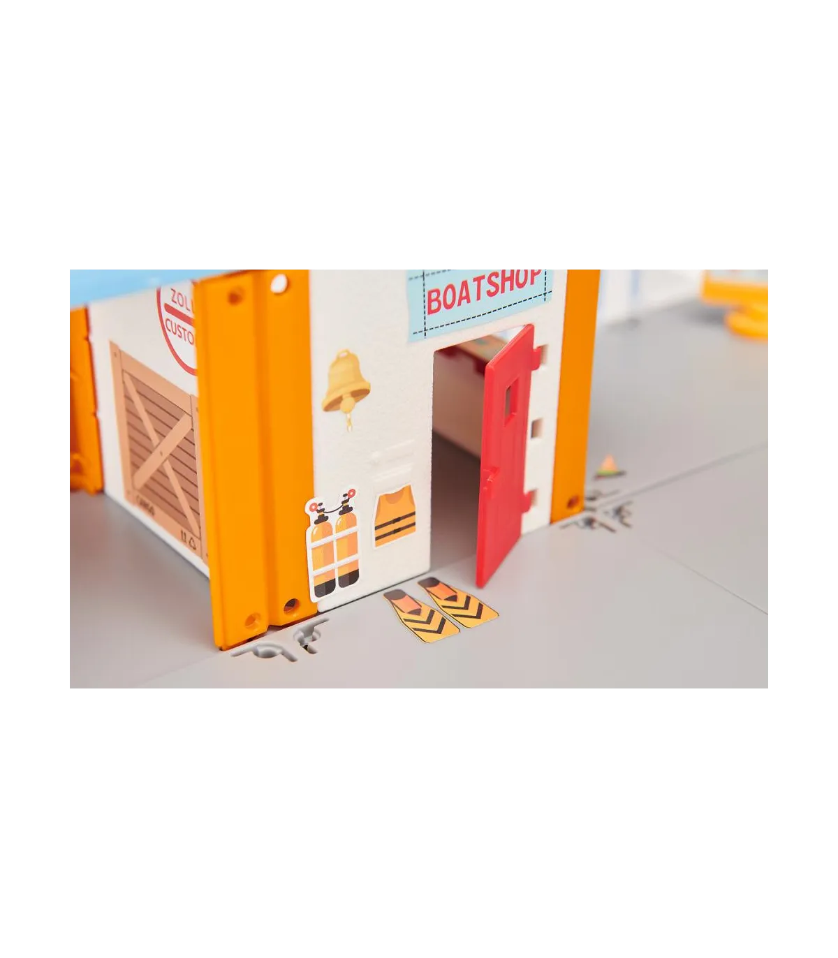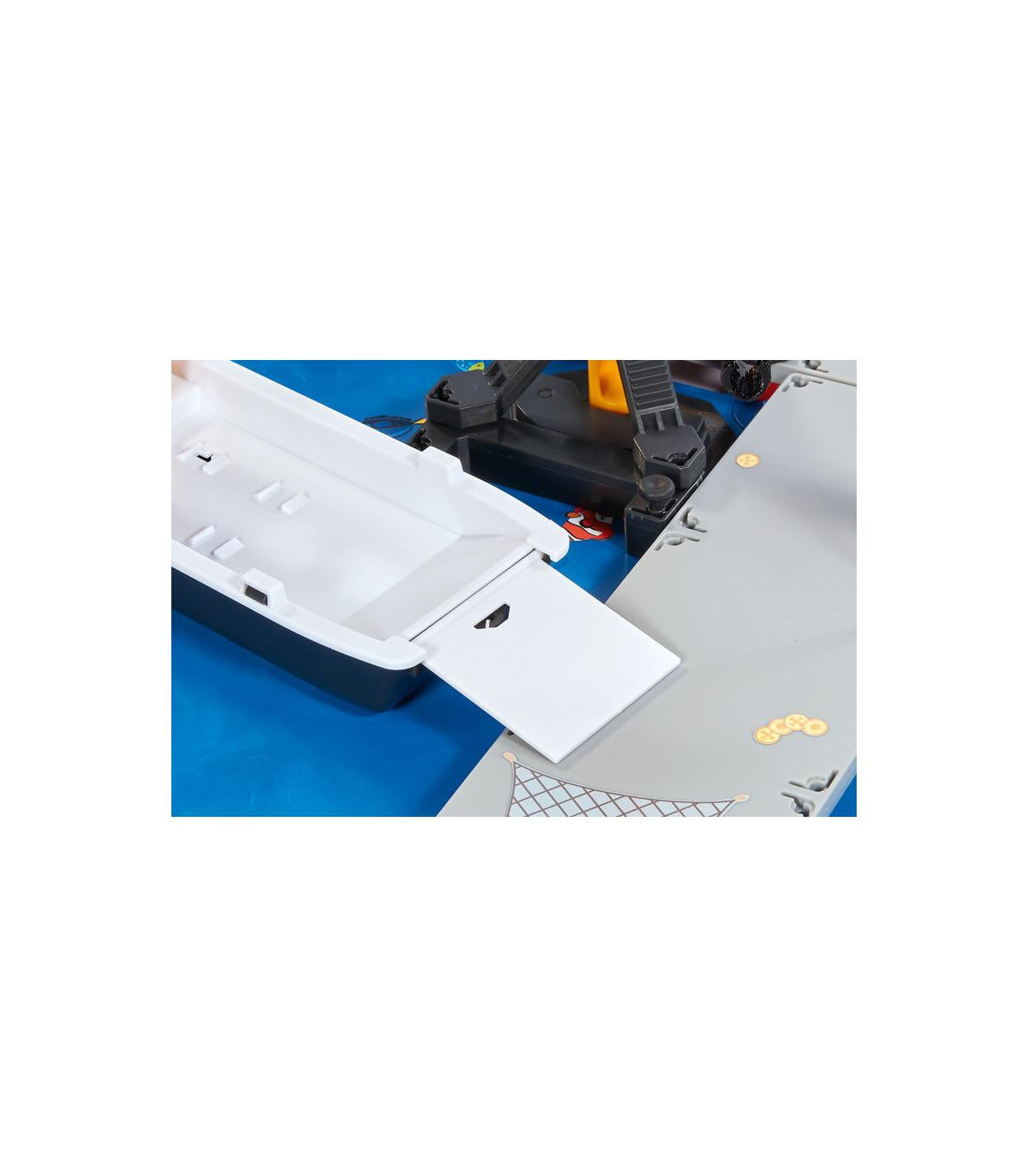 Estación de abastecimiento para barcos: siempre hay algo que hacer en el nuevo muelle de SIKUWORLD. El muelle se puede construir de diversas formas utilizando piezas individuales y diseñarlo individualmente con pegatinas. Los barcos se pueden botar y sacar mediante la rampa. El rugido sordo de la bocina del barco anuncia el final de la pausa para el almuerzo de los trabajadores portuarios. El sándwich de pescado se come rápidamente en el snack bar y allí atraca el barco de trabajo. Se puede fijar de forma segura a los bolardos del muro del muelle con tan solo unos sencillos pasos. Entonces la grúa pórtico con el carro comienza a moverse. Hay que descargar la carga del barco de trabajo, como dicen los trabajadores del puerto, porque el capitán quiere volver a partir rápidamente. El embarcadero SIKUWORLD consta del barco de trabajo, boyas, dos banderas, snack bar y un embarcadero con entradas y salidas, dos paneles de plástico con diseño azul, grúa y cajones. Las cajas se pueden abrir, llenar y vaciar. El muelle SIKUWORLD se puede utilizar solo y es el complemento ideal para el mundo acuático SIKUWORLD y el barco portacontenedores SIKUWORLD.