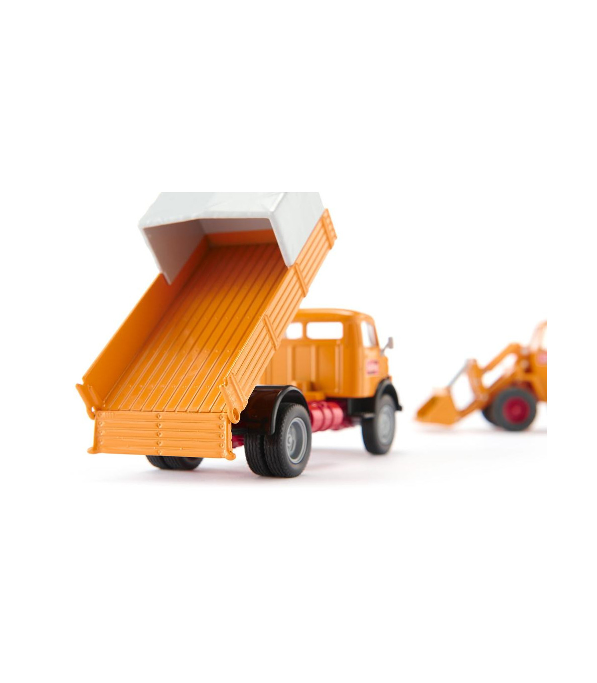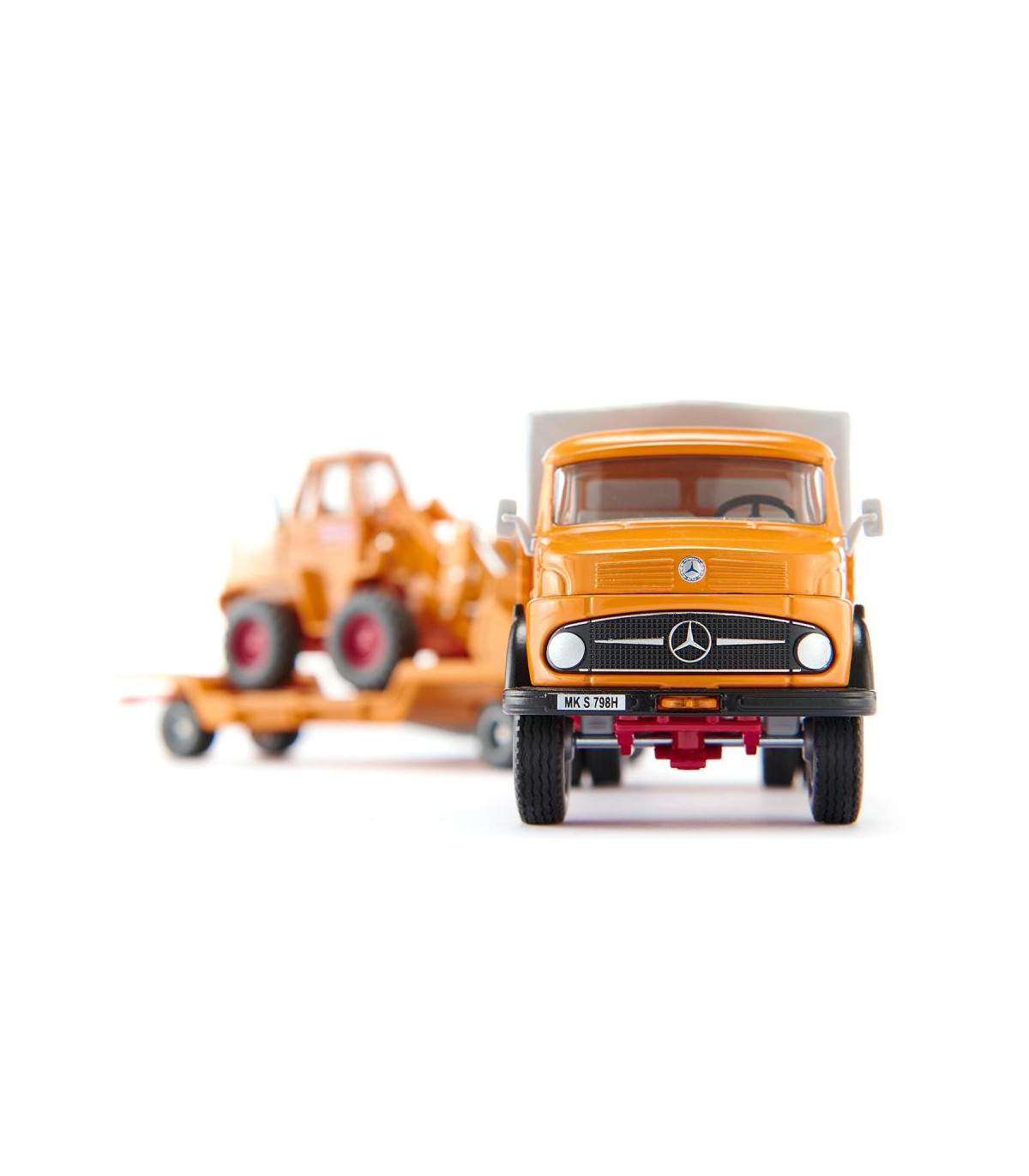 Héroes inolvidables de la obra: el capó redondo de Mercedes-Benz se construyó casi un millón de veces. Un número excepcionalmente alto de unidades y un tiempo de producción excepcionalmente largo: de 1959 a 1996. El camión transportaba mercancías, materiales de construcción y tierra durante el milagro económico y hoy sigue circulando por todo el mundo. Fue el rostro de muchas obras de construcción en la República Federal. El característico capó se puede abrir y la plataforma se puede inclinar. El motor diésel de 100 CV arrastra una góndola rebajada con la legendaria Kramer Allrad 411. Las cargadoras sobre ruedas amarillas llevan desde los años 50 moviendo tierra, quitando escombros y transportando tubos y paletas. El equipo trabaja con el diseño histórico de la empresa constructora Bölling.