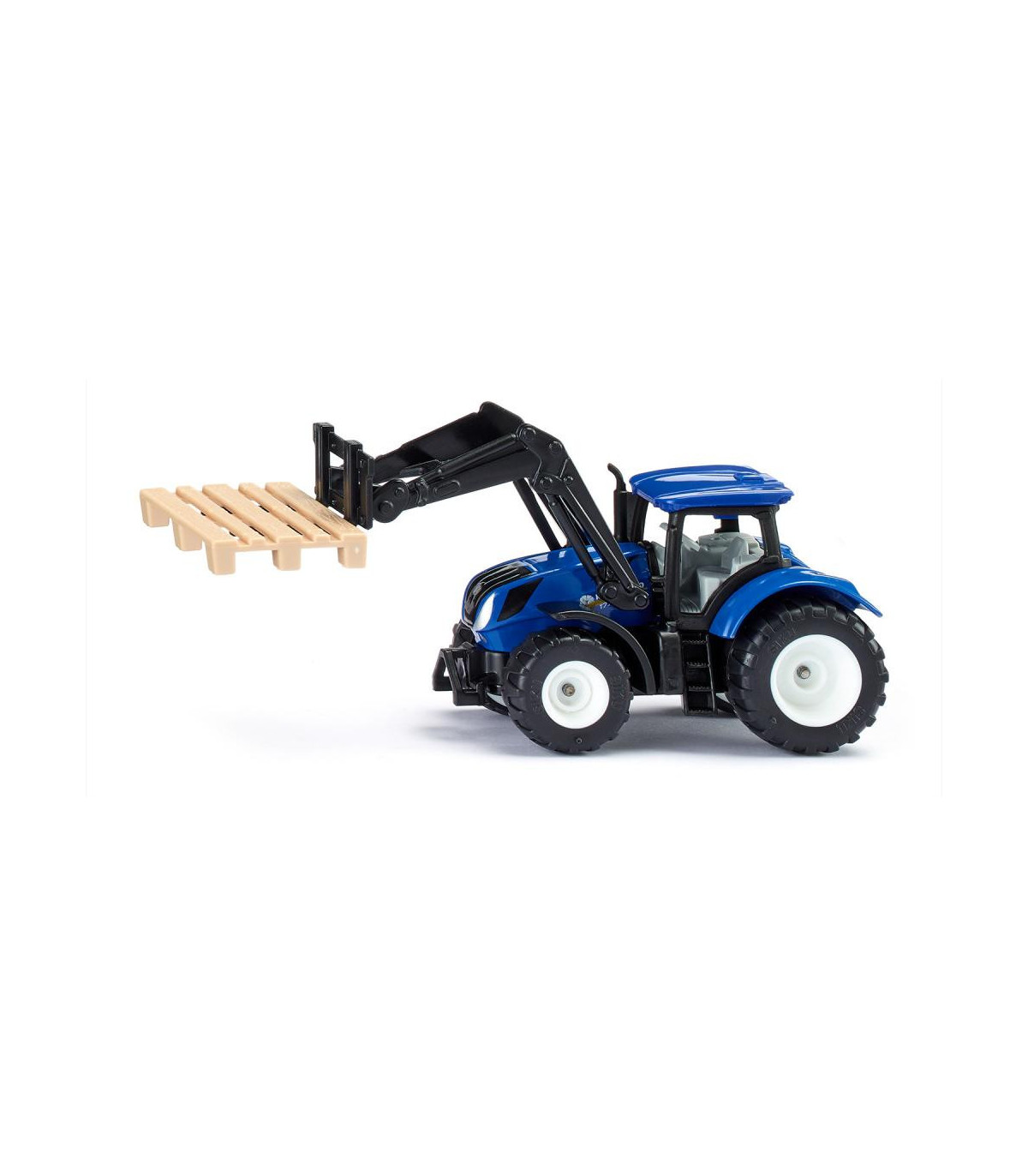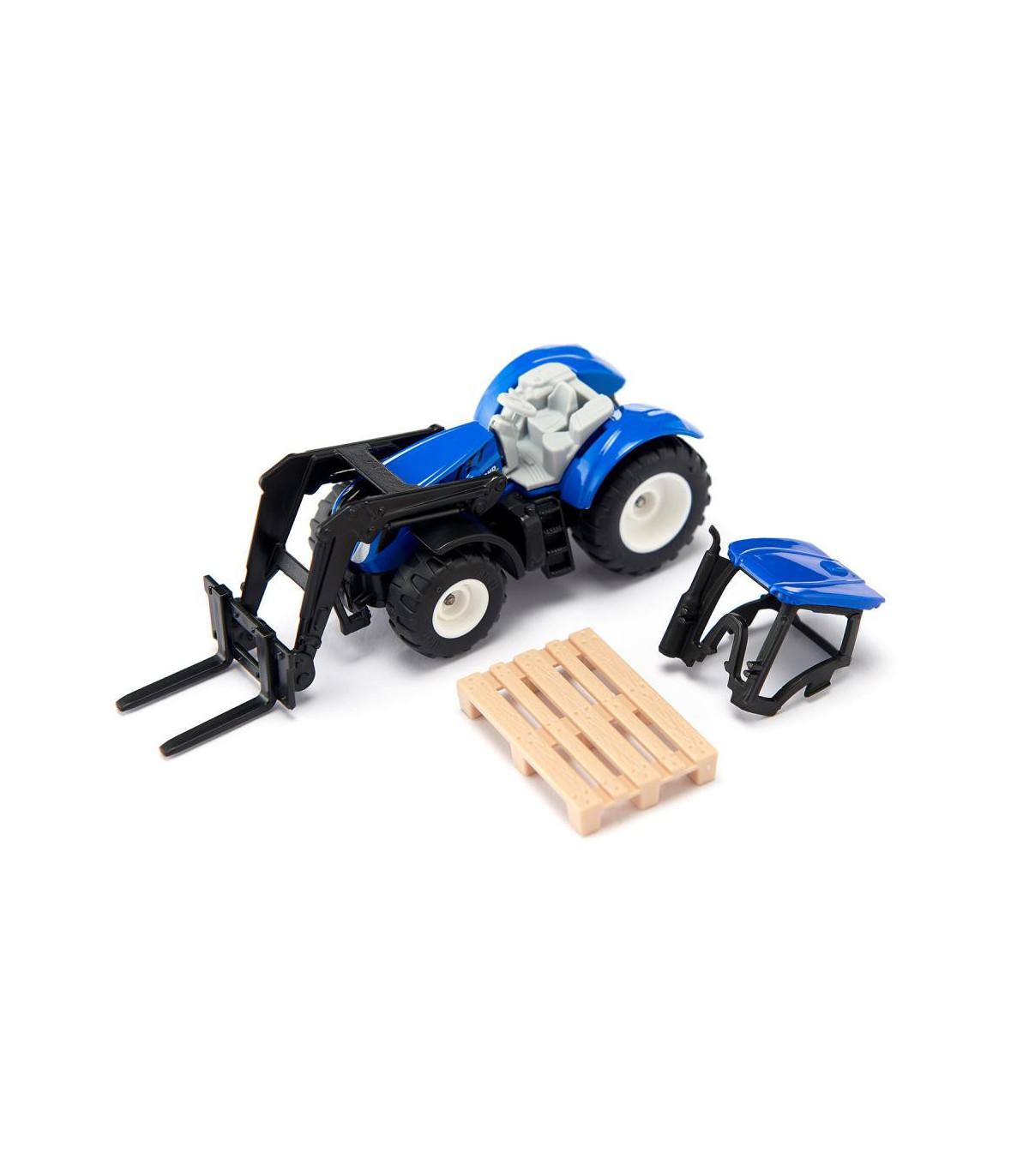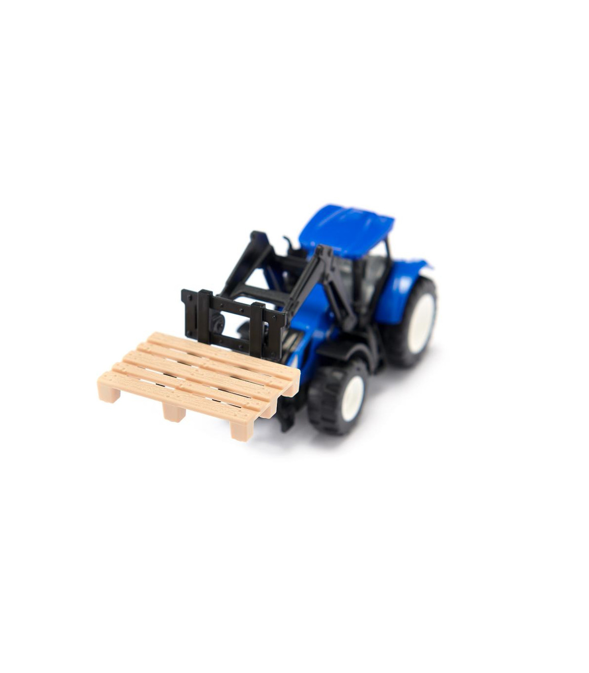 Maestro de apilamiento con túnica azul: apilando cajas de rejilla con leña, transportando cajas con frutas y verduras. Con una horquilla elevadora, un tractor con cargador frontal sustituye a una carretilla elevadora en la granja. El cargador frontal del tractor New Holland se puede mover hacia arriba y hacia abajo y la cabina también se puede quitar. Todos los remolques siku se pueden fijar al enganche de remolque. El tractor se conduce con el diseño típico de New Holland y neumáticos de goma.