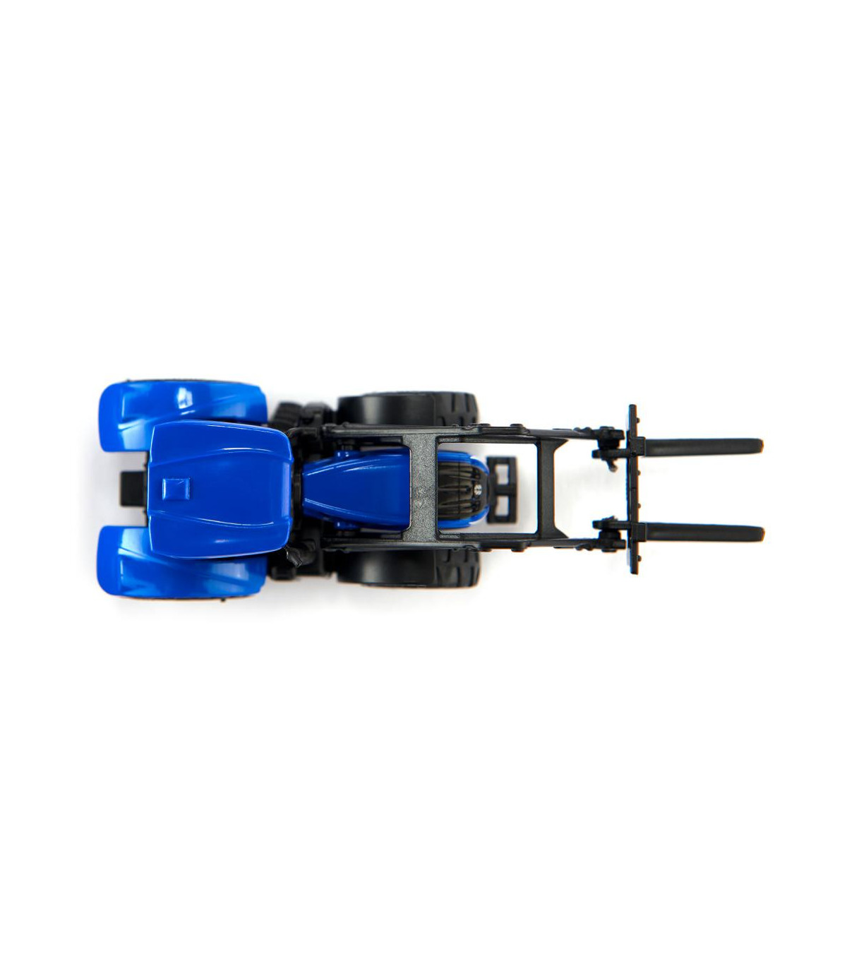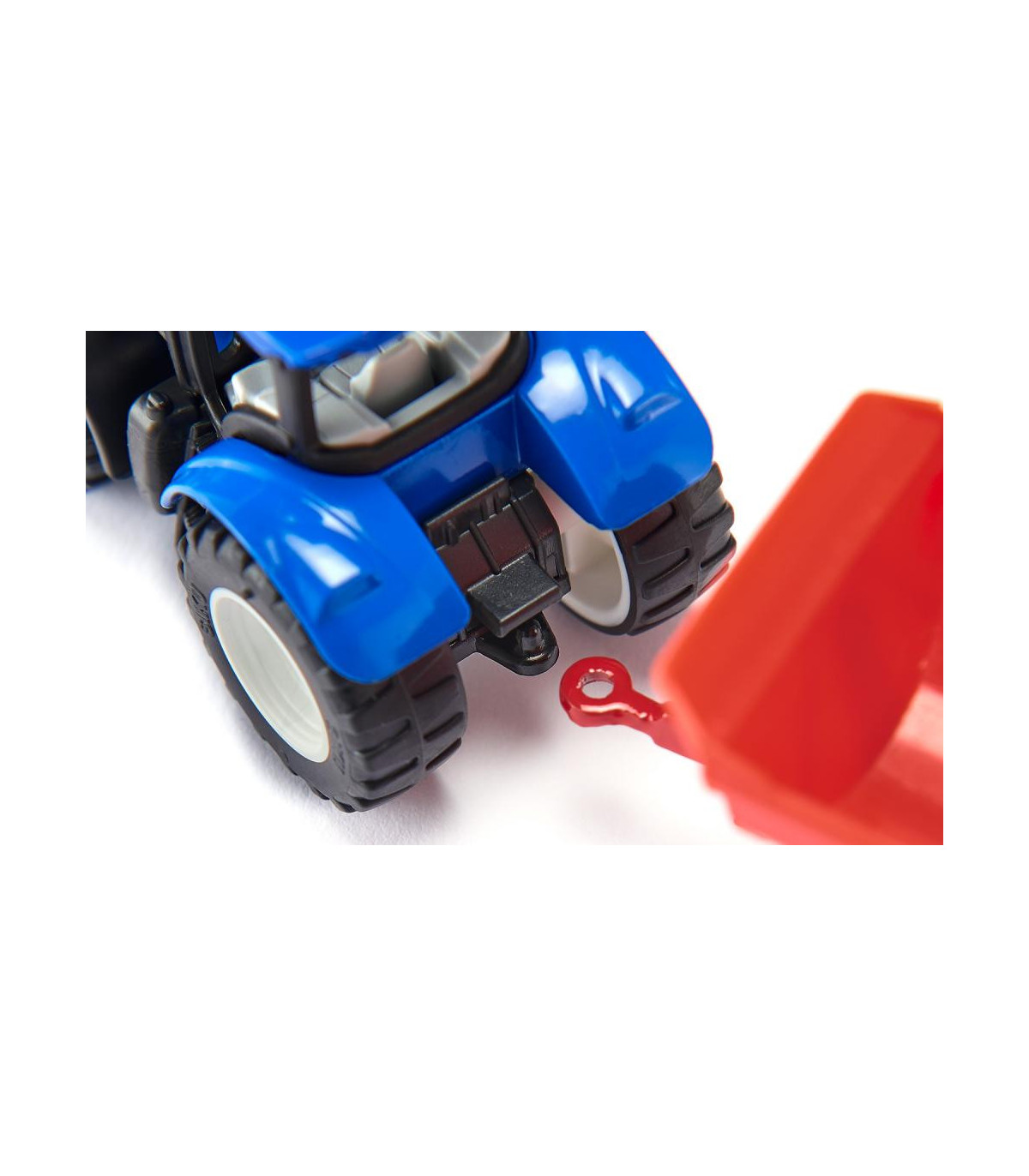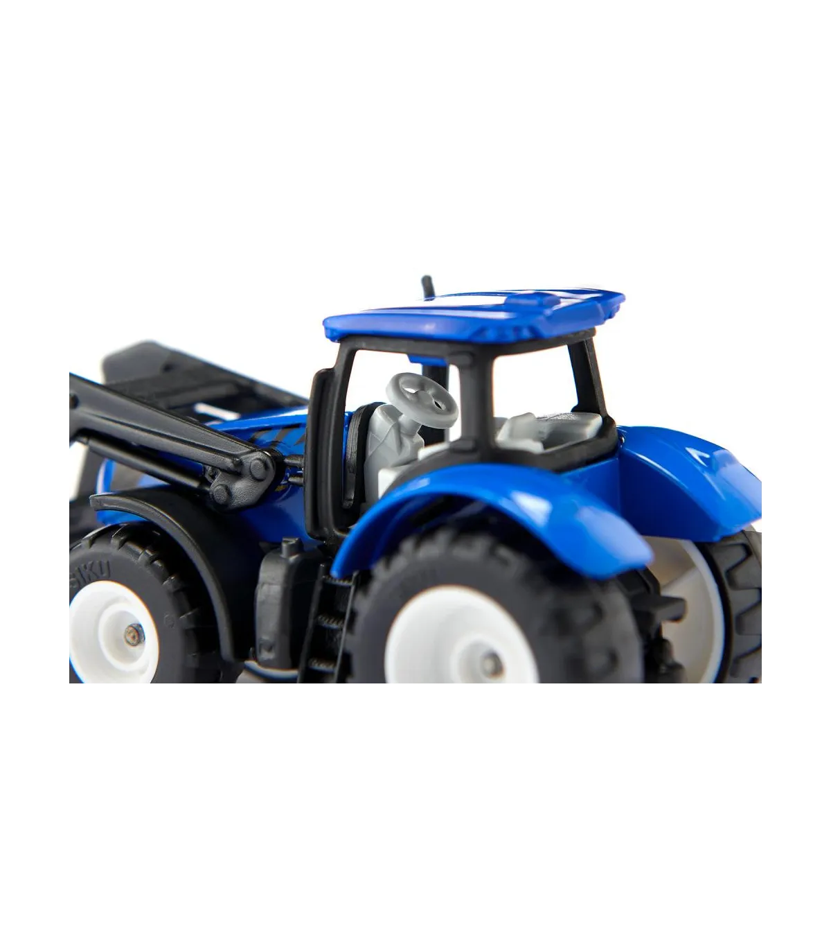 Maestro de apilamiento con túnica azul: apilando cajas de rejilla con leña, transportando cajas con frutas y verduras. Con una horquilla elevadora, un tractor con cargador frontal sustituye a una carretilla elevadora en la granja. El cargador frontal del tractor New Holland se puede mover hacia arriba y hacia abajo y la cabina también se puede quitar. Todos los remolques siku se pueden fijar al enganche de remolque. El tractor se conduce con el diseño típico de New Holland y neumáticos de goma.