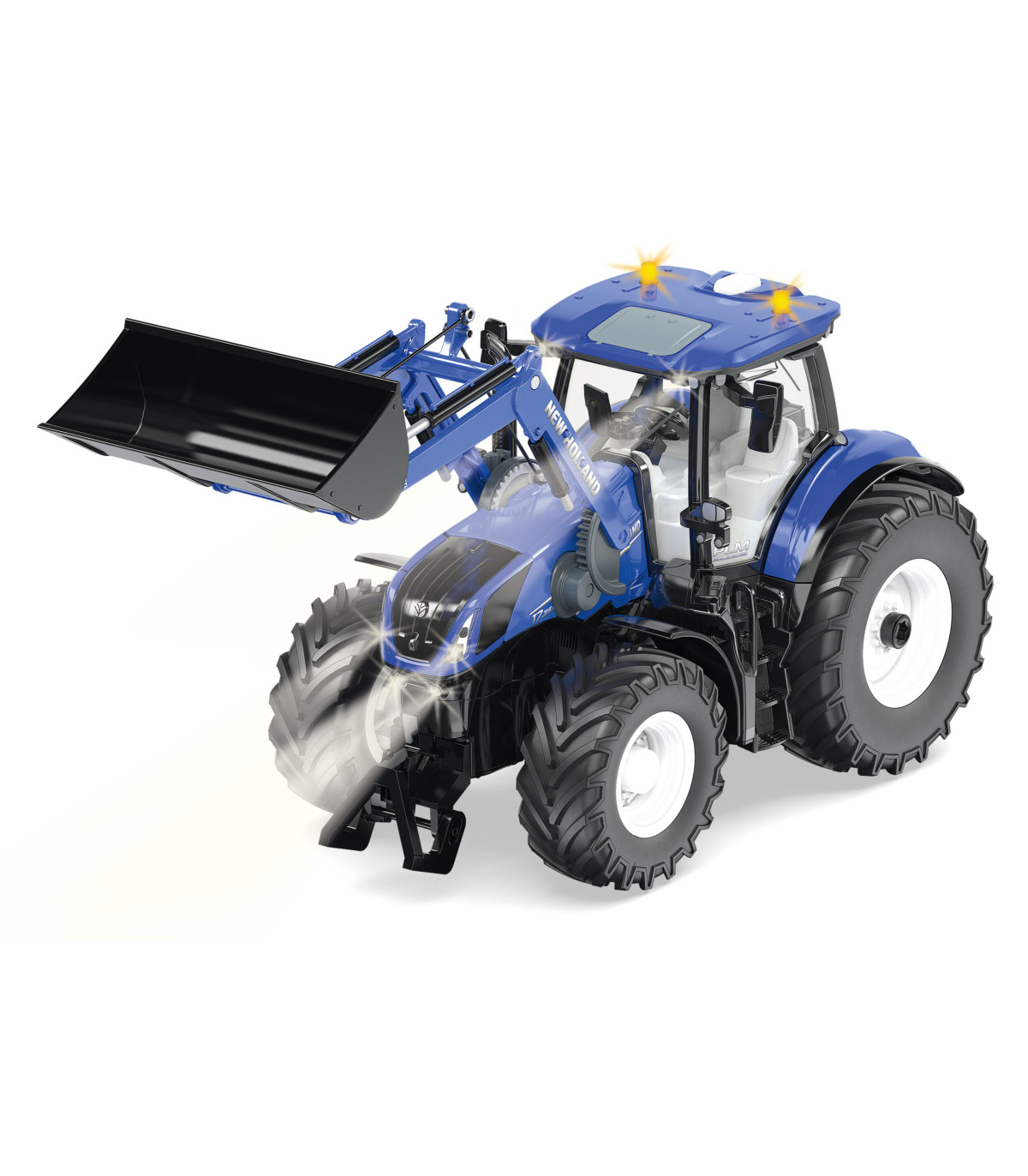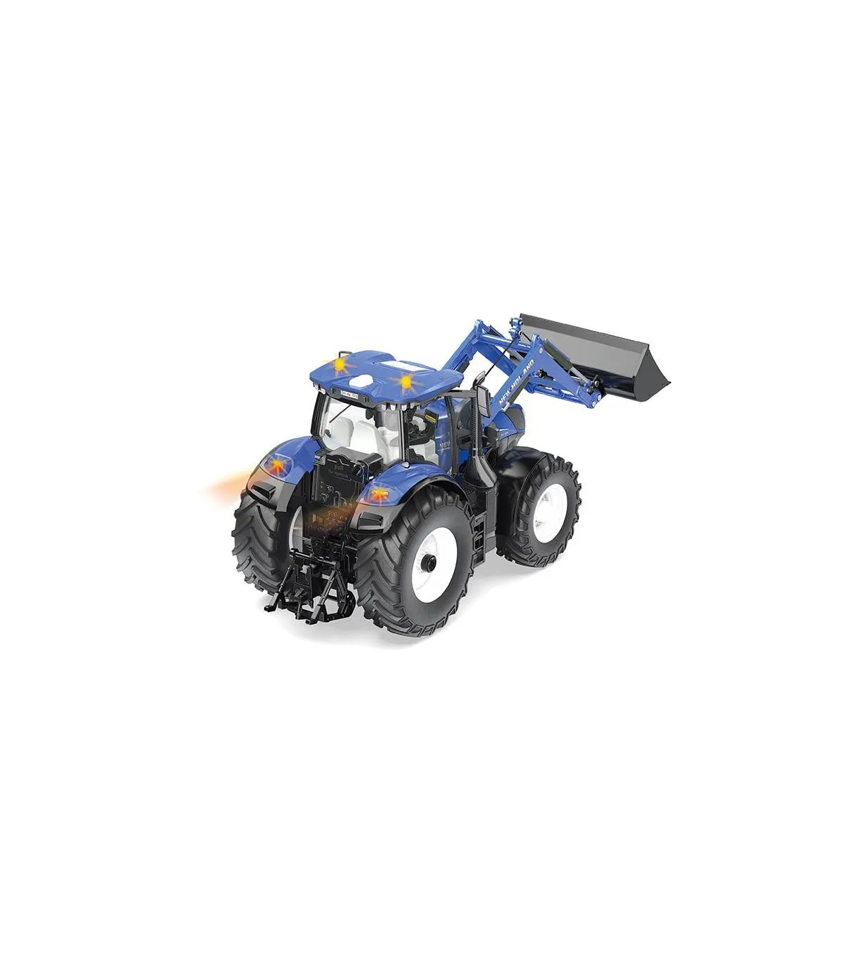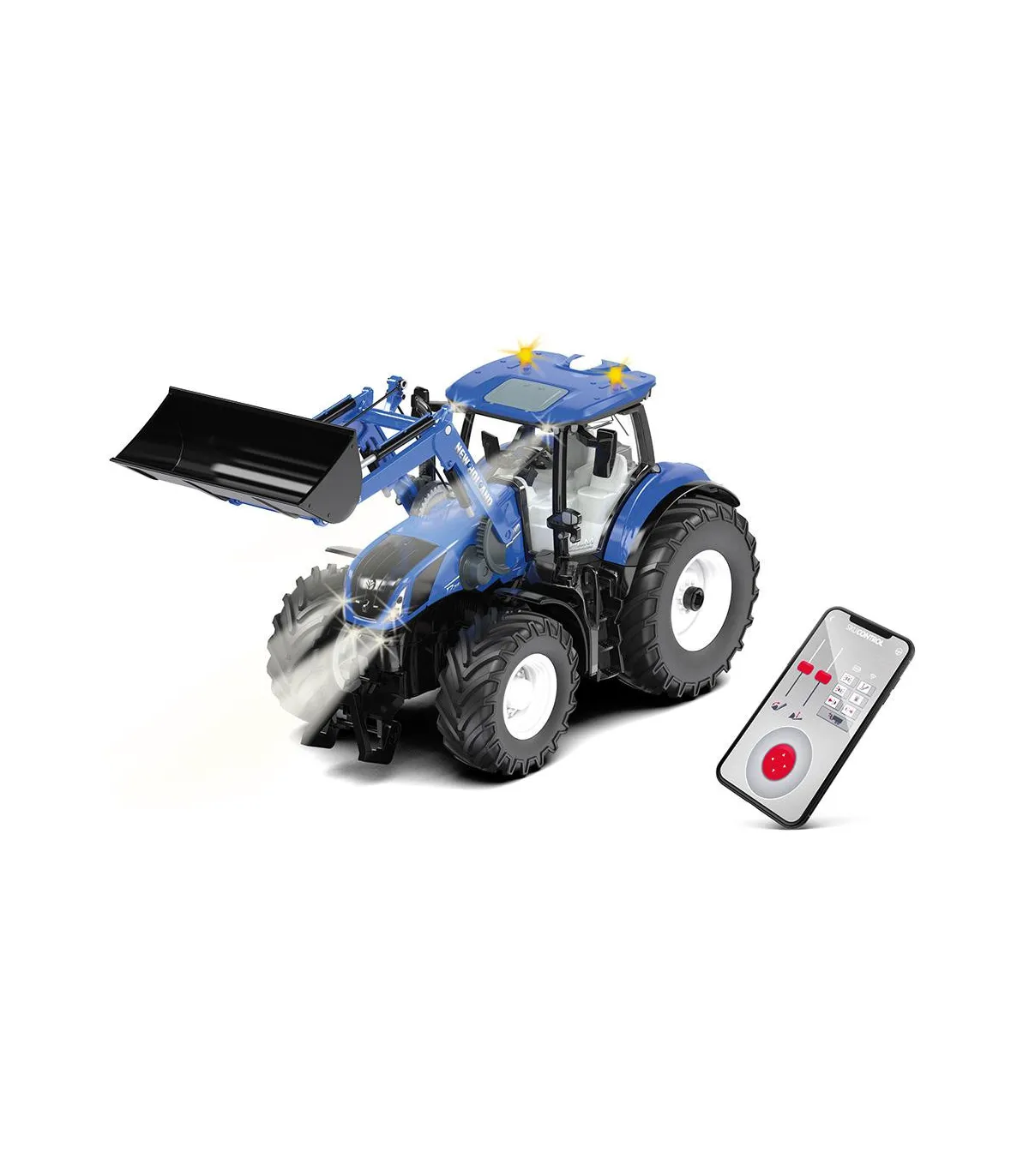 Tractor RC de alta gama con manto azul, 6,7 litros de seis cilindros y 313 CV: el New Holland T7.315 es el modelo superior de la serie de vehículos pesados. El motor potente y al mismo tiempo económico hace que el tractor grande sea un todoterreno en el campo y en la carretera. Con el cargador frontal, el New Holland T7.315 se convierte en una herramienta de trabajo en la granja. Con la APLICACIÓN SIKUCONTROL, las 5 marchas, los 12 LED y las numerosas funciones del tractor, como el acoplamiento trasero, se pueden controlar mediante un teléfono inteligente y una tableta. La tracción trasera y la dirección se controlan proporcionalmente. Además, el brazo de carga del cargador frontal y el cargador se pueden mover de manera realista. El brazo de carga también puede equiparse con una horquilla para palés. Esto convierte el cargador frontal en un montacargas. La horquilla se mantiene automáticamente en posición horizontal incluso cuando está levantada. Las funciones se pueden controlar a través del control del gamepad virtual o los sensores de movimiento de los dispositivos móviles. Esta función intuitiva ofrece diversión adicional. La APLICACIÓN SIKUCONTROL se puede descargar de forma gratuita desde App Store y Google Play Store. La configuración y las funciones de la aplicación se actualizan continuamente. Con la función OTA (Over-The-Air) de la aplicación, el software del tractor también se puede actualizar directamente.